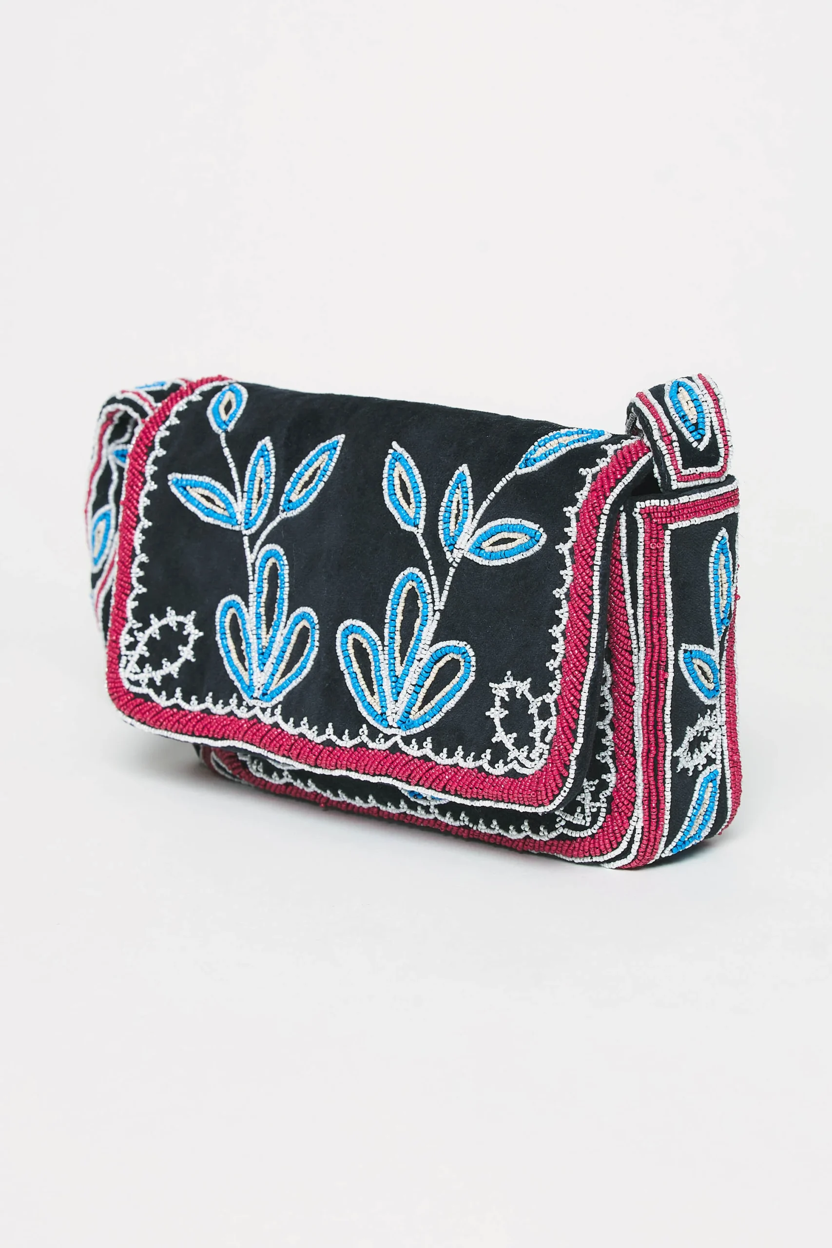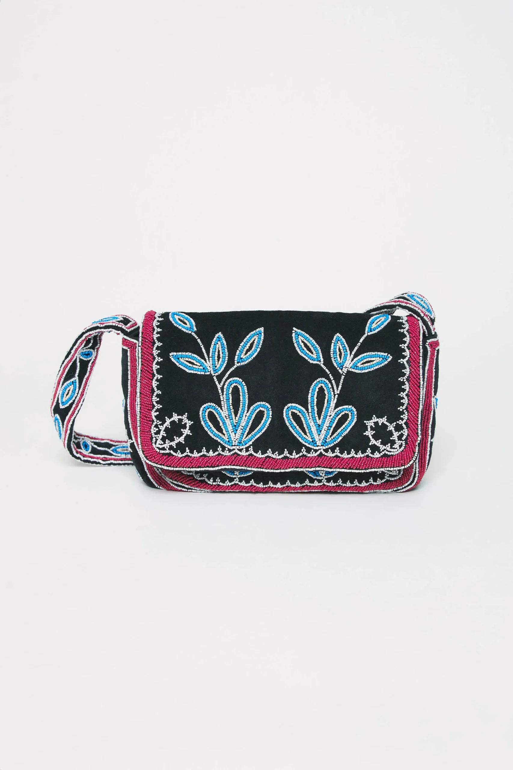 Sac en coton brodé de perles à la main. Anse moyenne. Fermeture avec un bouton pression. Petit compartiment intérieur avec zip.