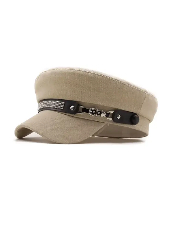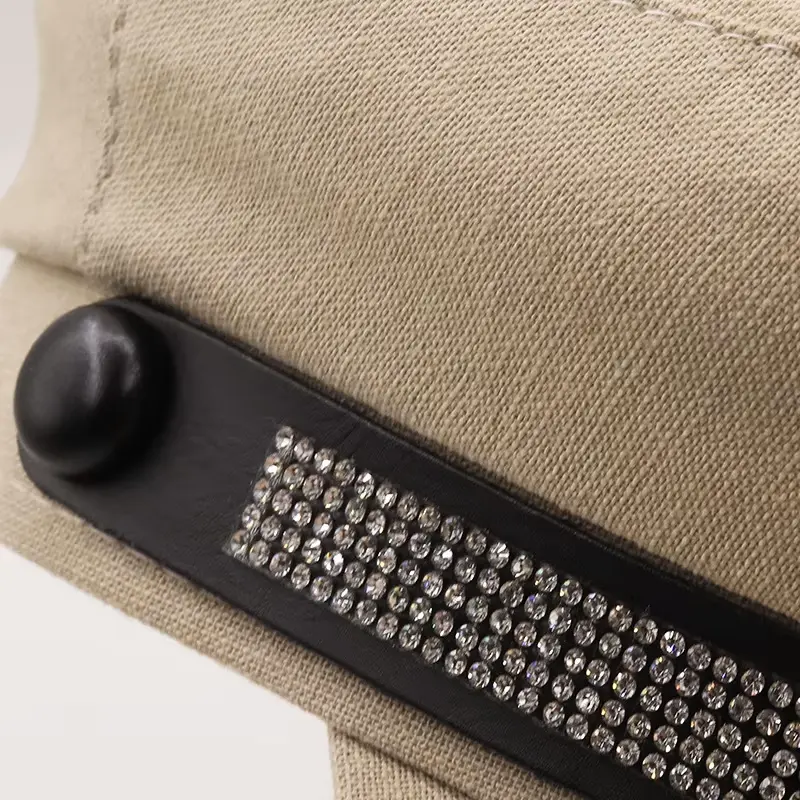 Elégance et Modernité avec cette casquette en coton beige rehaussée d’une bande décorative incrustée de strass scintillants. Cet accessoire unique allie simplicité et sophistication, parfait pour les femmes audacieuses en quête de style.
