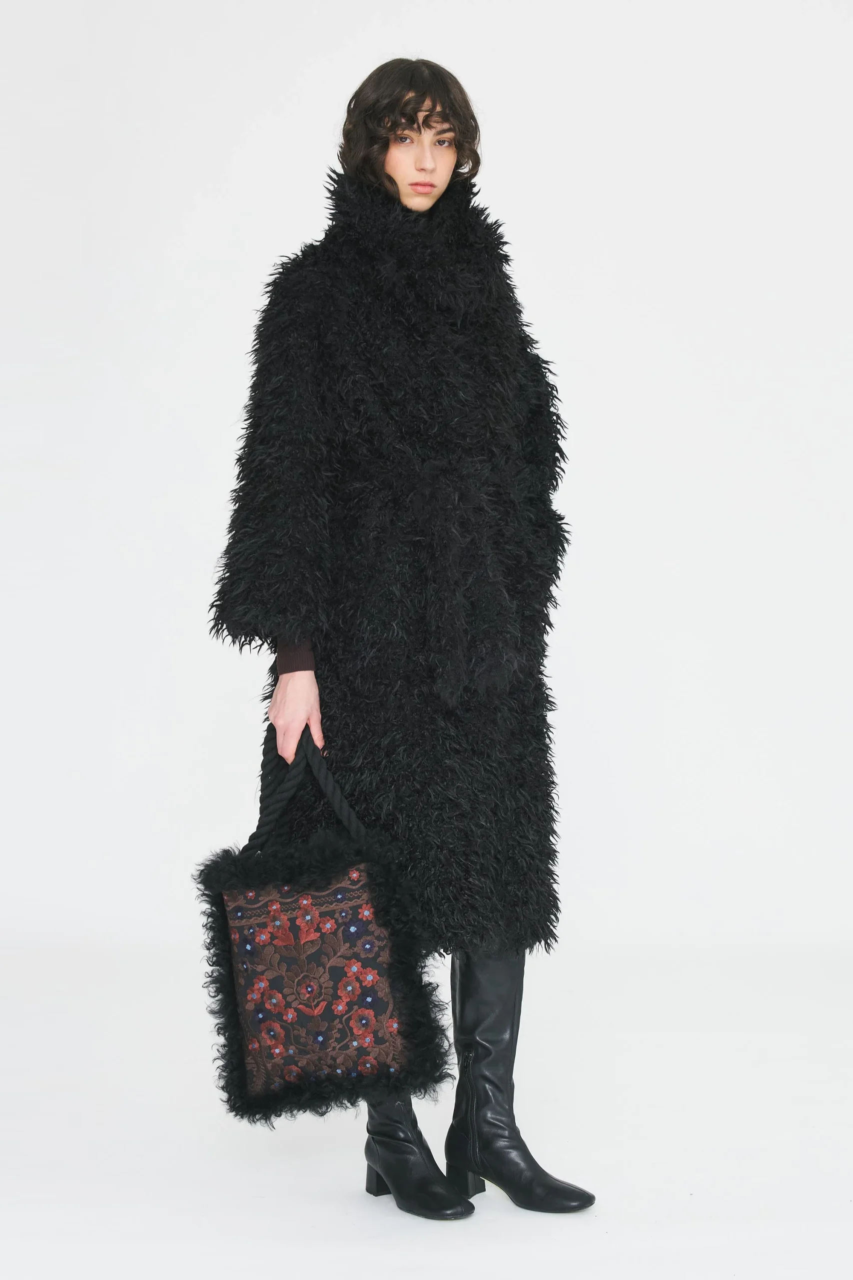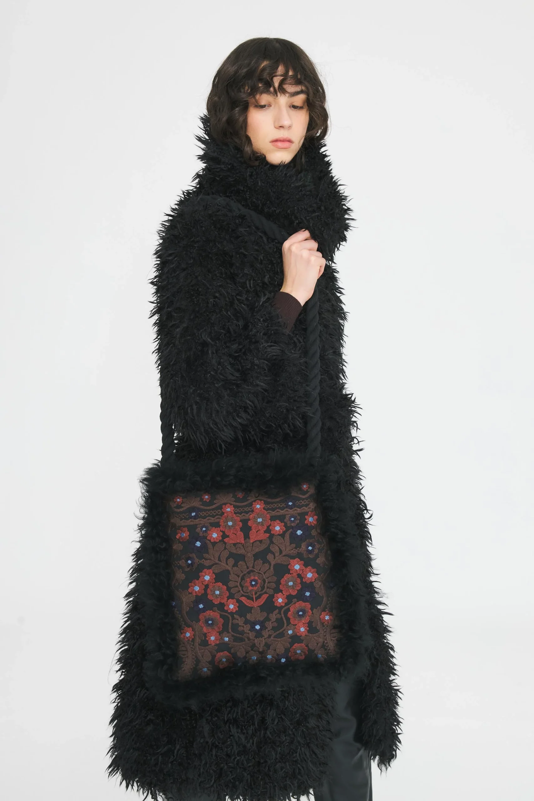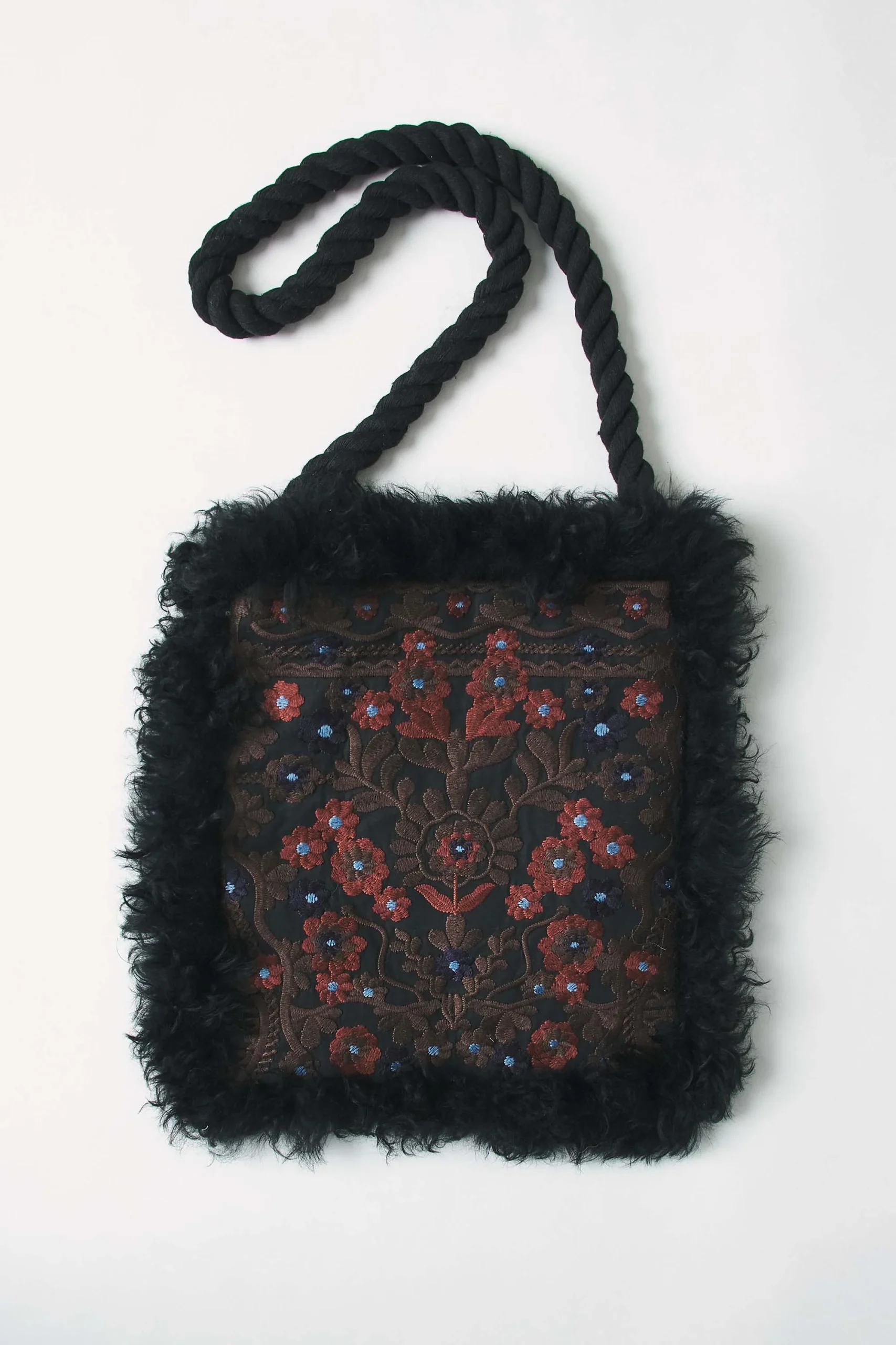 Sac brodé d’inspiration afghane. Broderies florales artisanales sur l’ensemble du sac finitions en fourrure d’agneau ton sur ton. Anse torsadé en coton. Fermeture à boutons-pression.