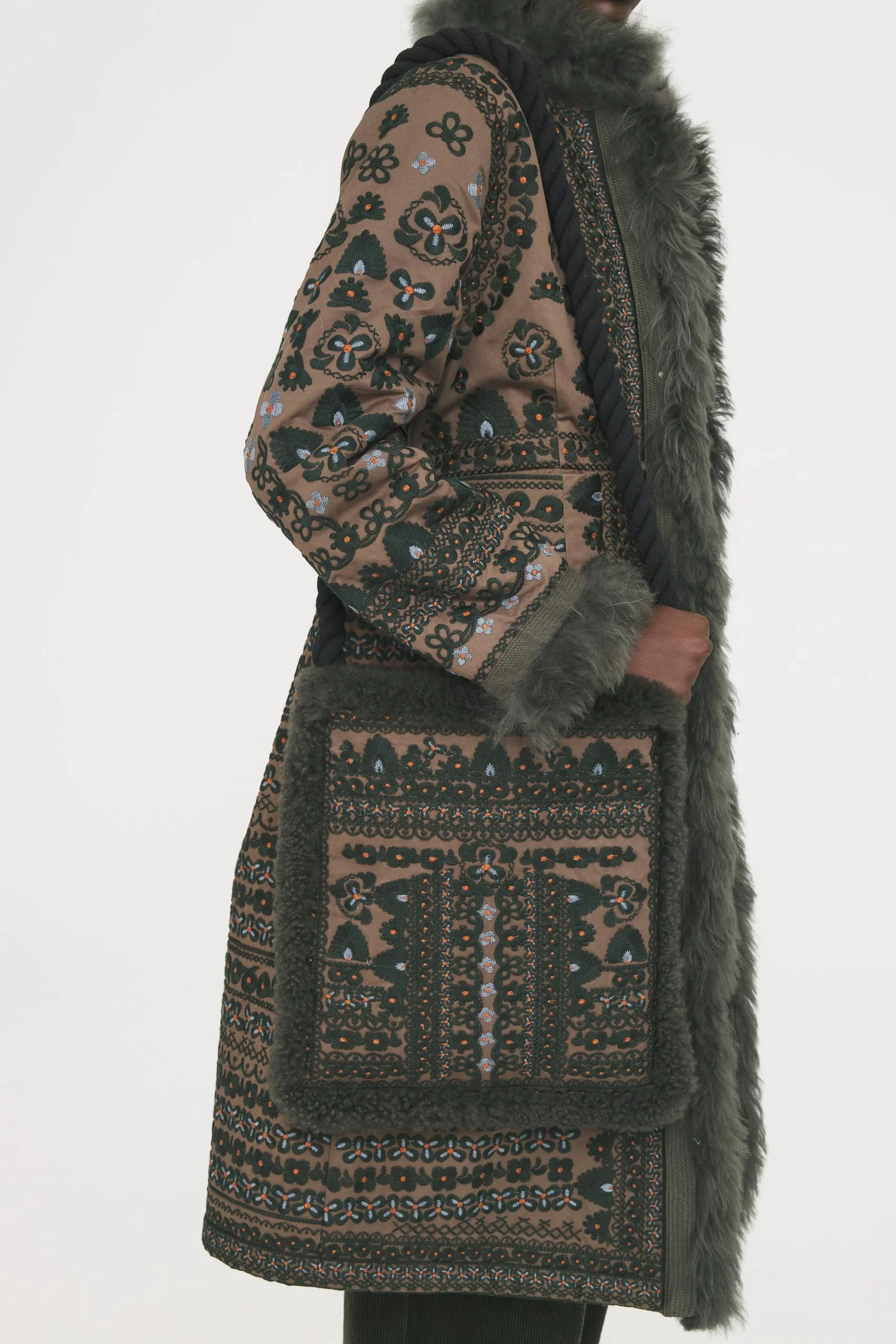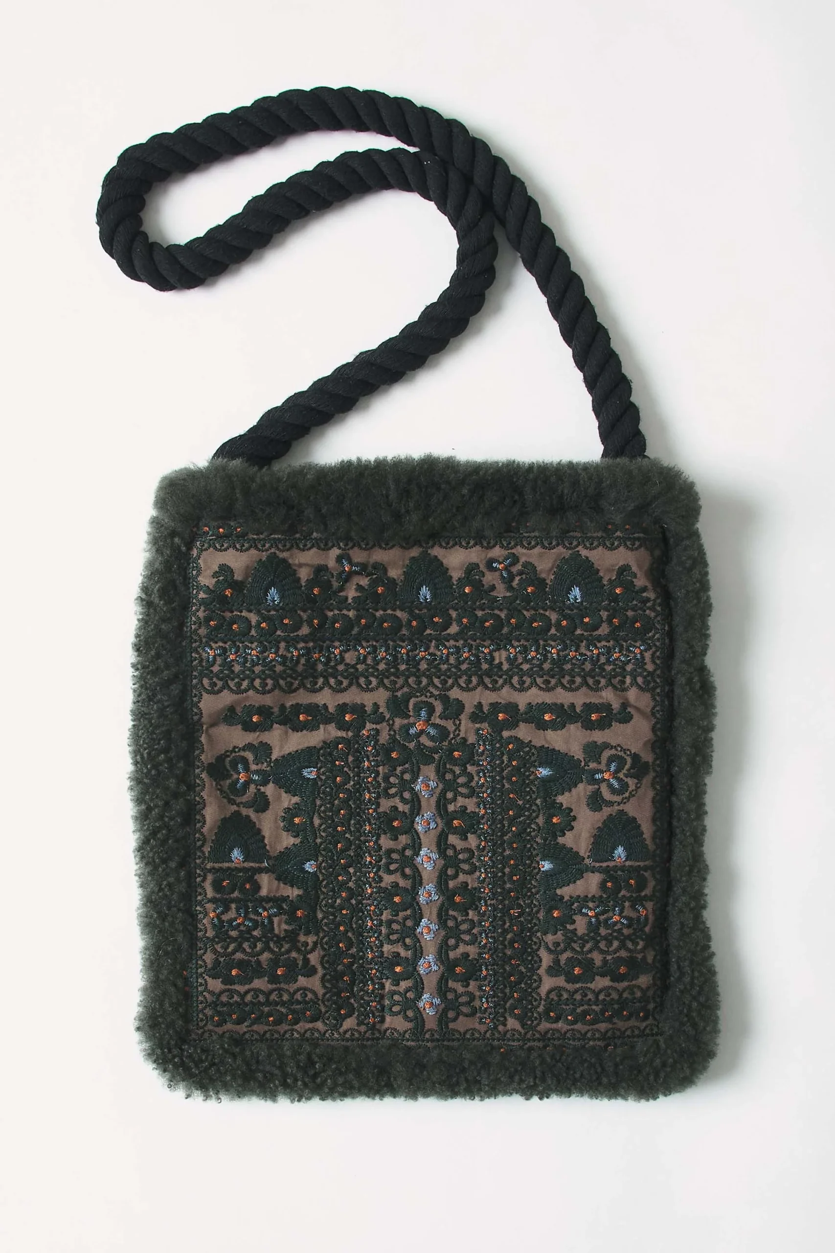 Sac brodé d’inspiration afghane. Broderies florales artisanales sur l’ensemble du sac finitions en fourrure d’agneau ton sur ton. Anse torsadé en coton. Fermeture à boutons-pression. Doublé.