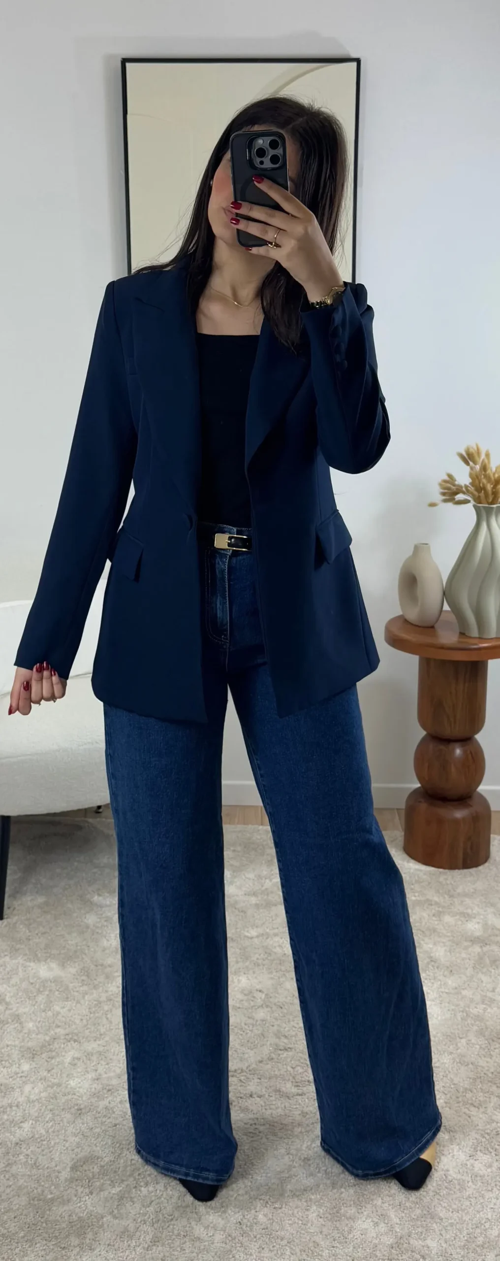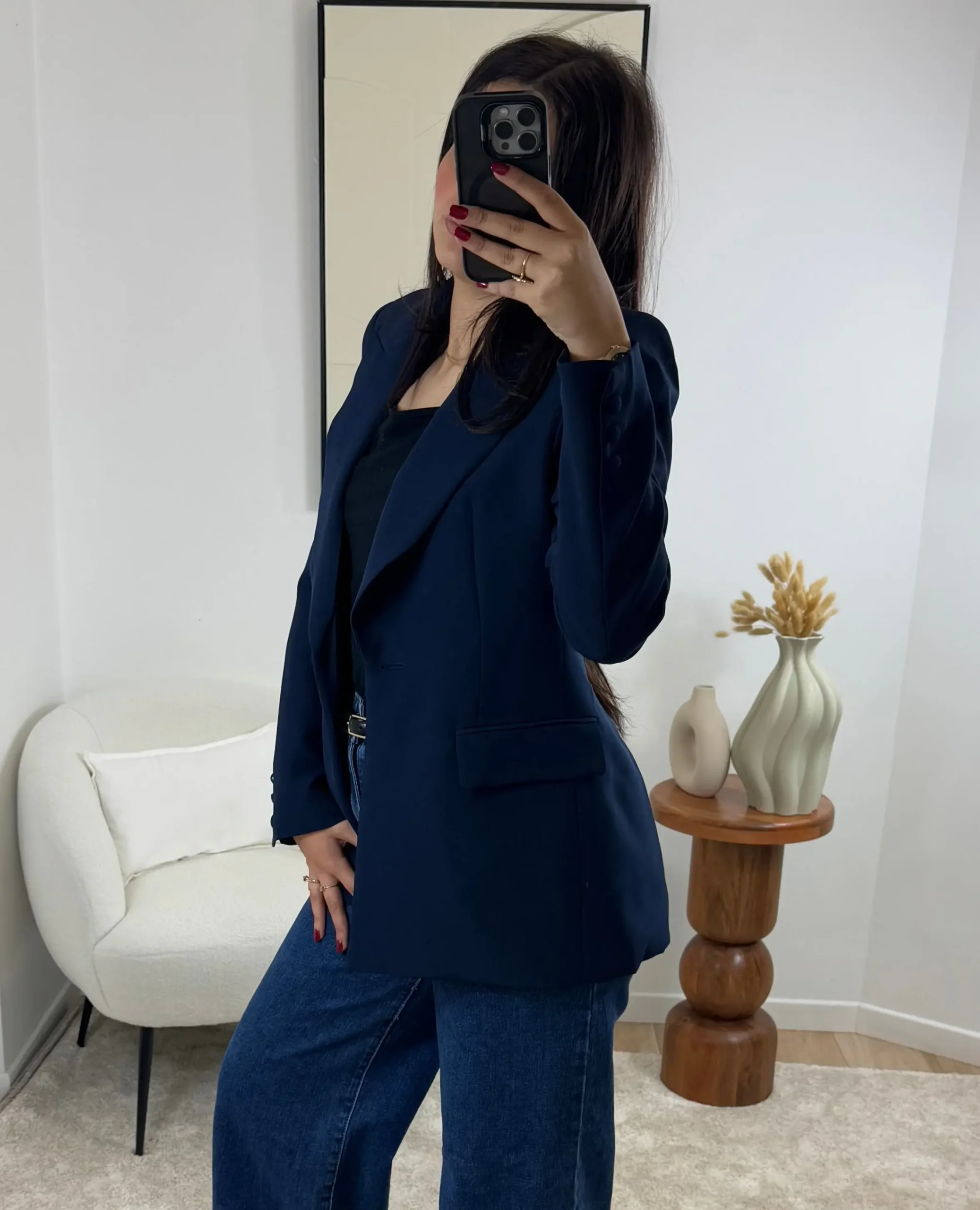 DESCRIPTION : • Veste cintrée avec épaulettes • Bouton au milieu pour fermer • Couleur : Marine • Col à revers pour un style sophistiqué • Fente sur le milieu au dos Le modèle mesure 1,68 m et porte une taille S COMPOSITION : 95% polyester 5% elastane
