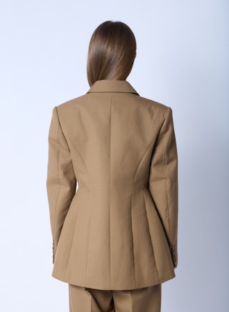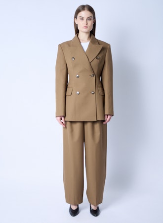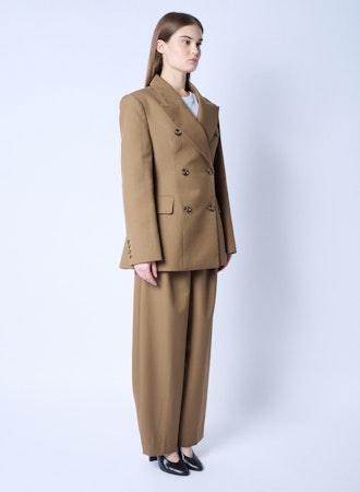 Son double boutonnage croisé apporte cette allure chic signature qui caractérise l’art du tailleur. De plus, sa couleur camel intemporelle traverse les saisons avec élégance. Par ailleurs, ses lignes épurées et sa coupe oversize structurée créent cette silhouette moderne et féminine.