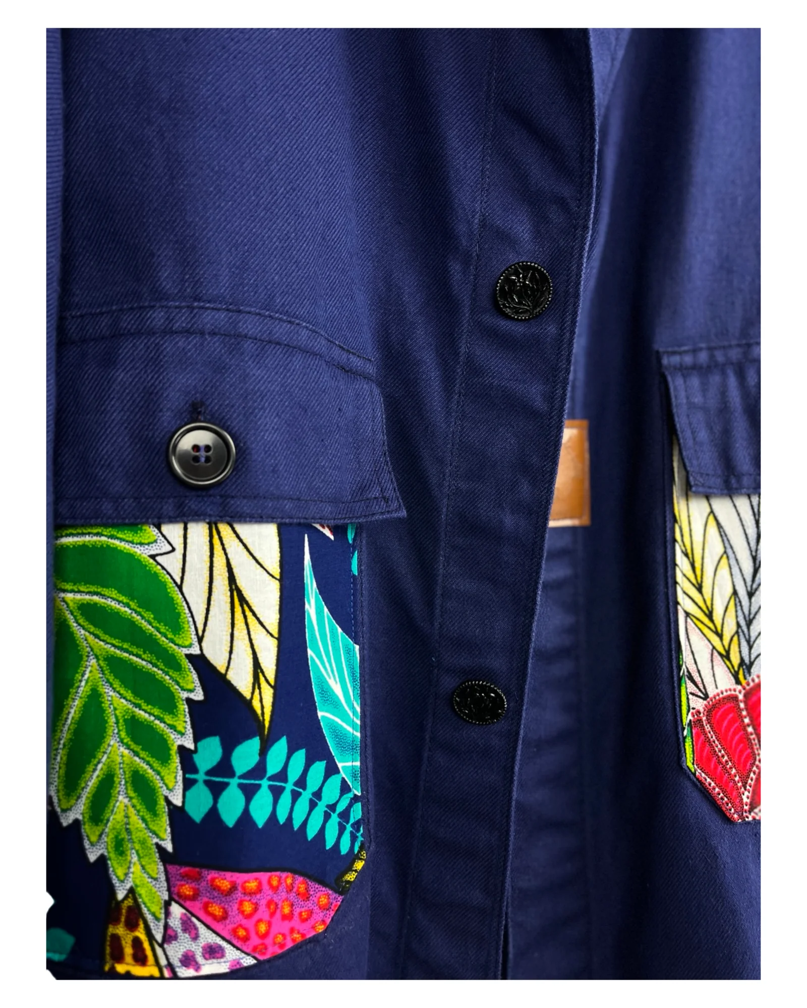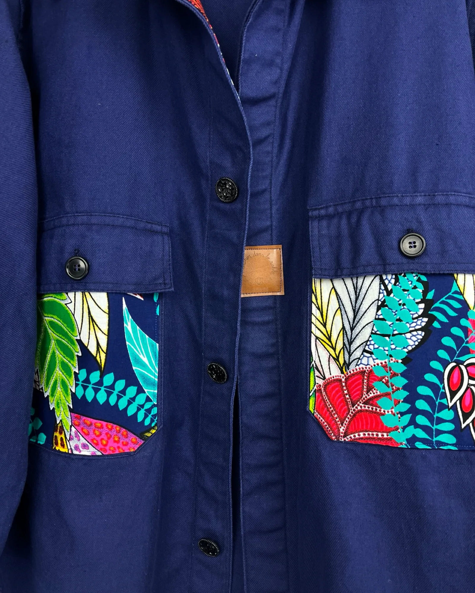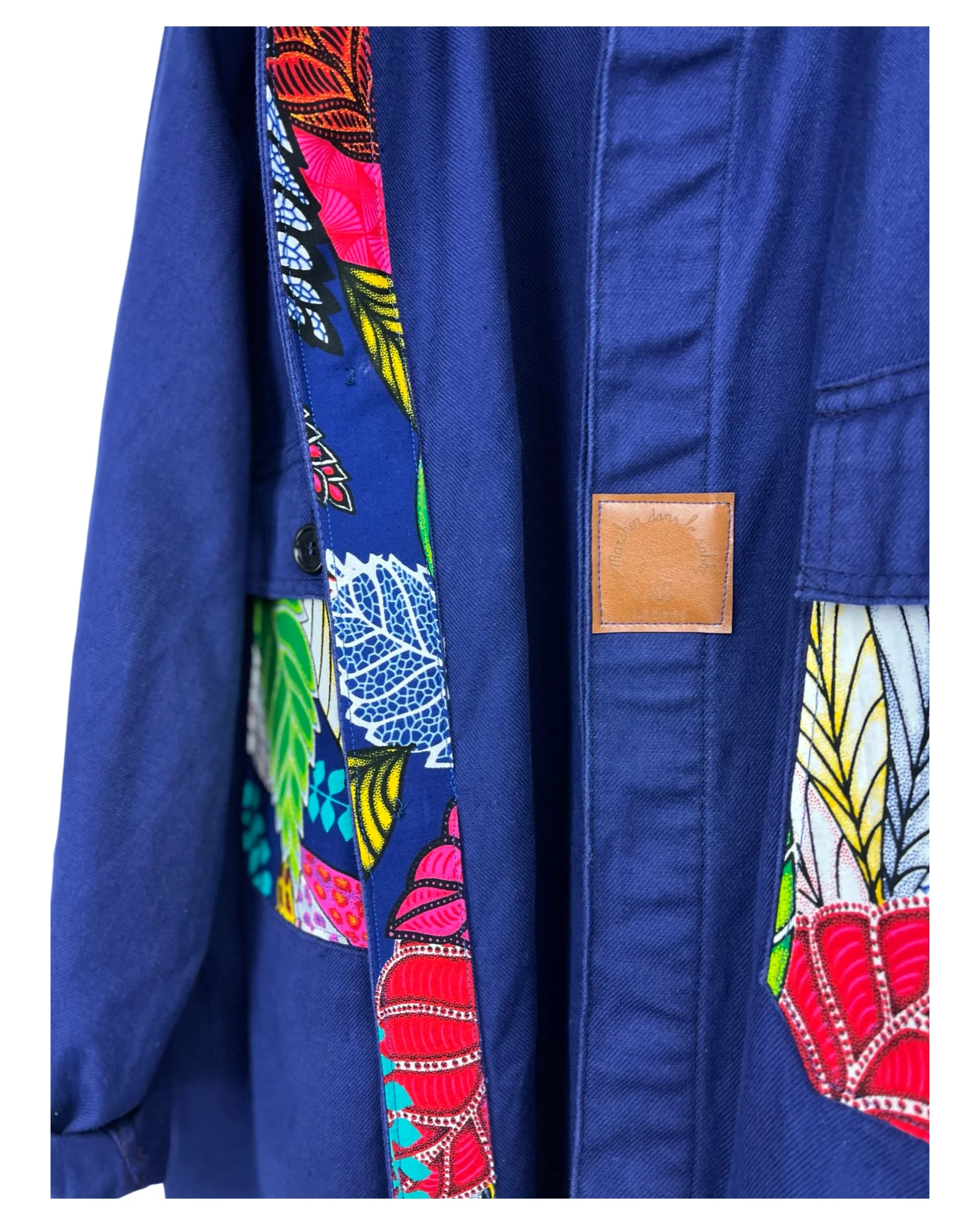 VESTE BLEU DE TRAVAIL WAX Description et entretien : – Véritable Veste de Travail 100% Coton Bleu Marine.– Tissu Wax 100% Coton.– Jacron logo simili cuir fabrication française.– Boutons Fleuri Métal Noir.Ce modèle convient pour une taille droite XL/XXL.Convient également pour une taille L pour un style plus ample.Coupe droite mixte.Longueur de la veste : […]