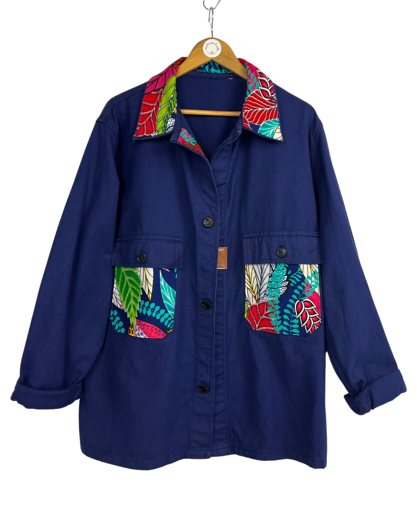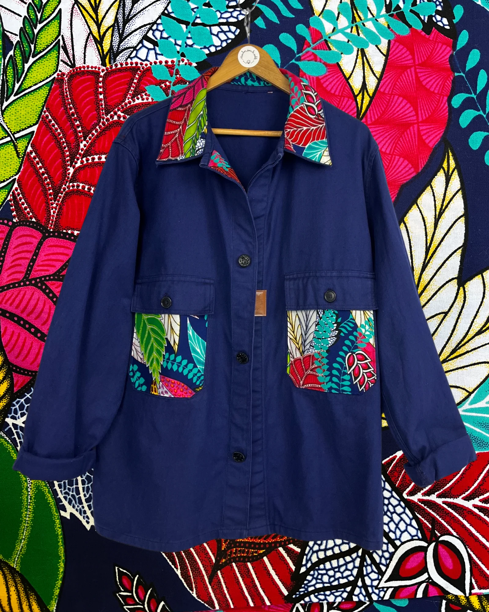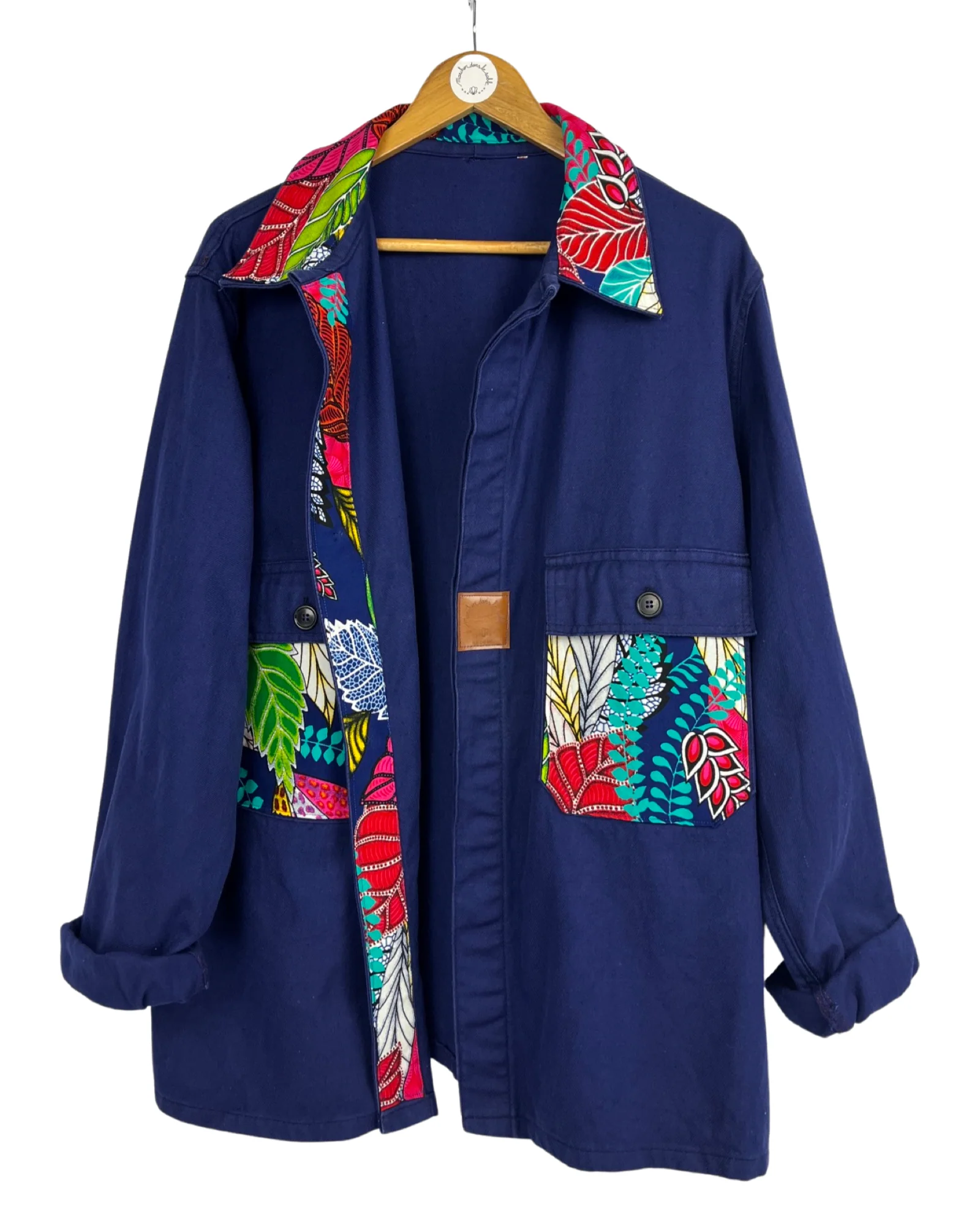 VESTE BLEU DE TRAVAIL WAX Description et entretien : – Véritable Veste de Travail 100% Coton Bleu Marine.– Tissu Wax 100% Coton.– Jacron logo simili cuir fabrication française.– Boutons Fleuri Métal Noir.Ce modèle convient pour une taille droite XL/XXL.Convient également pour une taille L pour un style plus ample.Coupe droite mixte.Longueur de la veste : […]