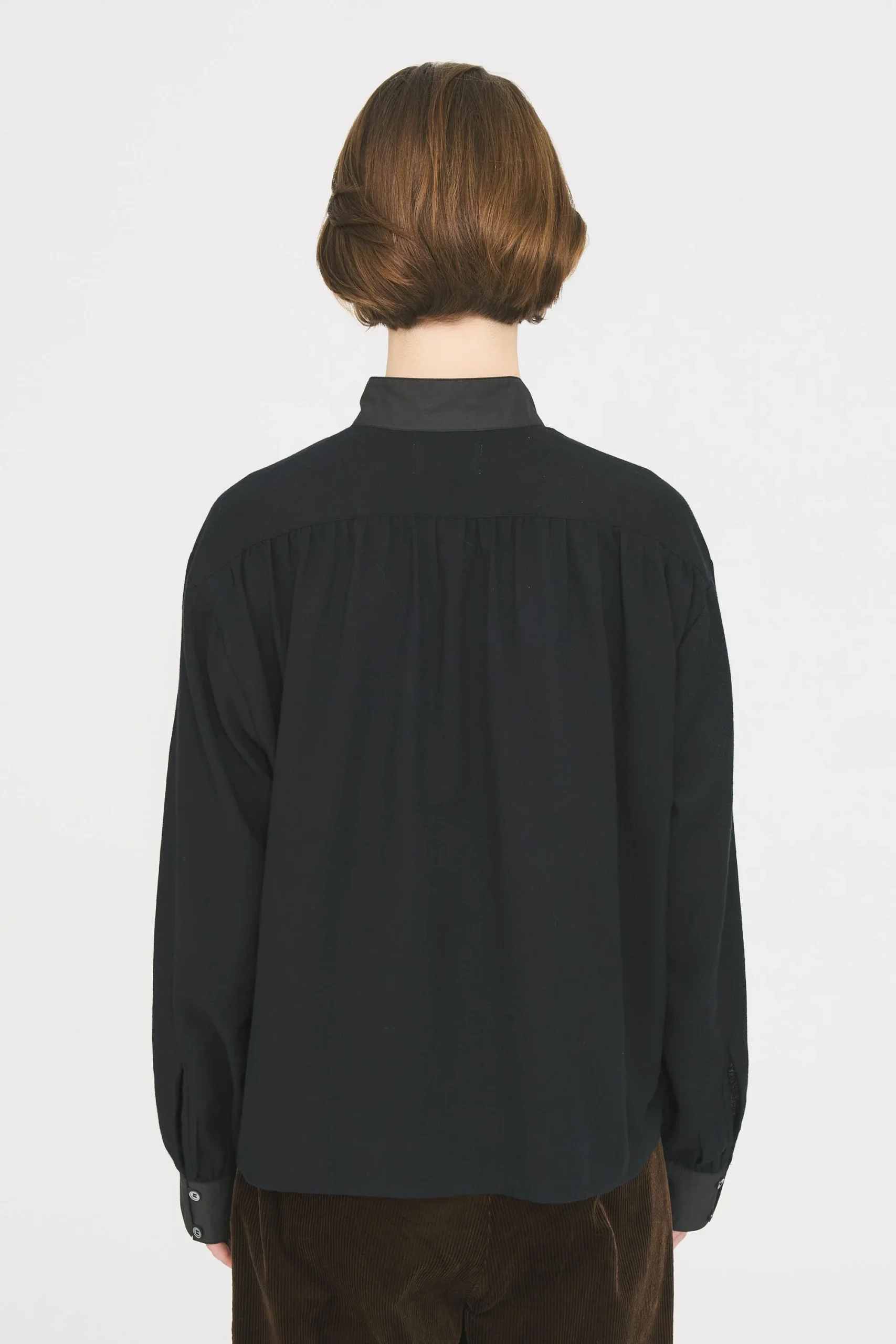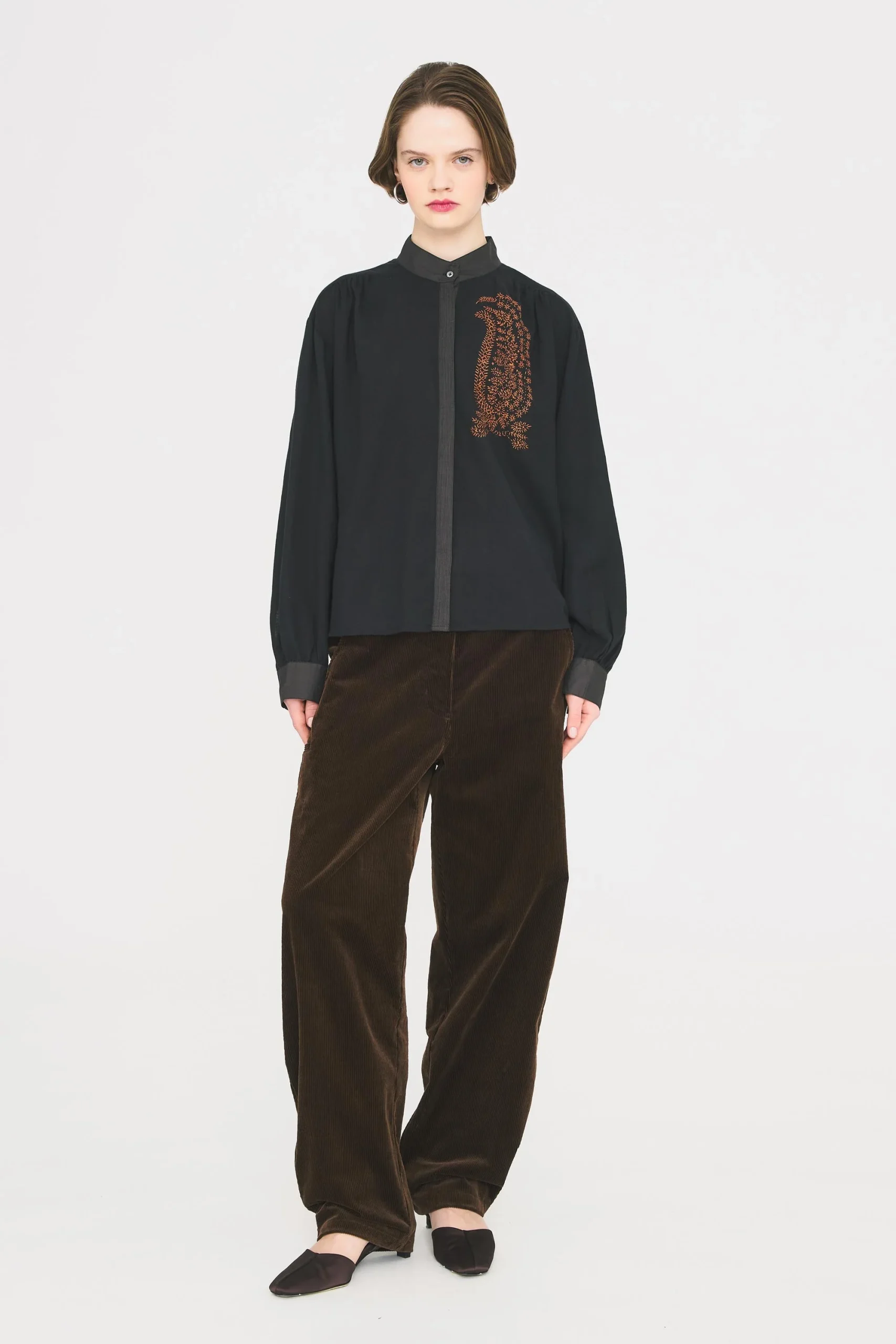 Blouse en flanelle de coton à col mao. Broderie main sur le devant de la blouse. Manches longues. Patte de boutonnage dissimulée. Col, patte de boutonnage et poignets en tissu.