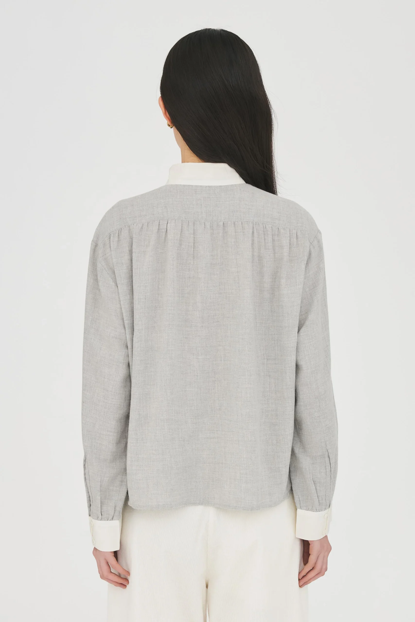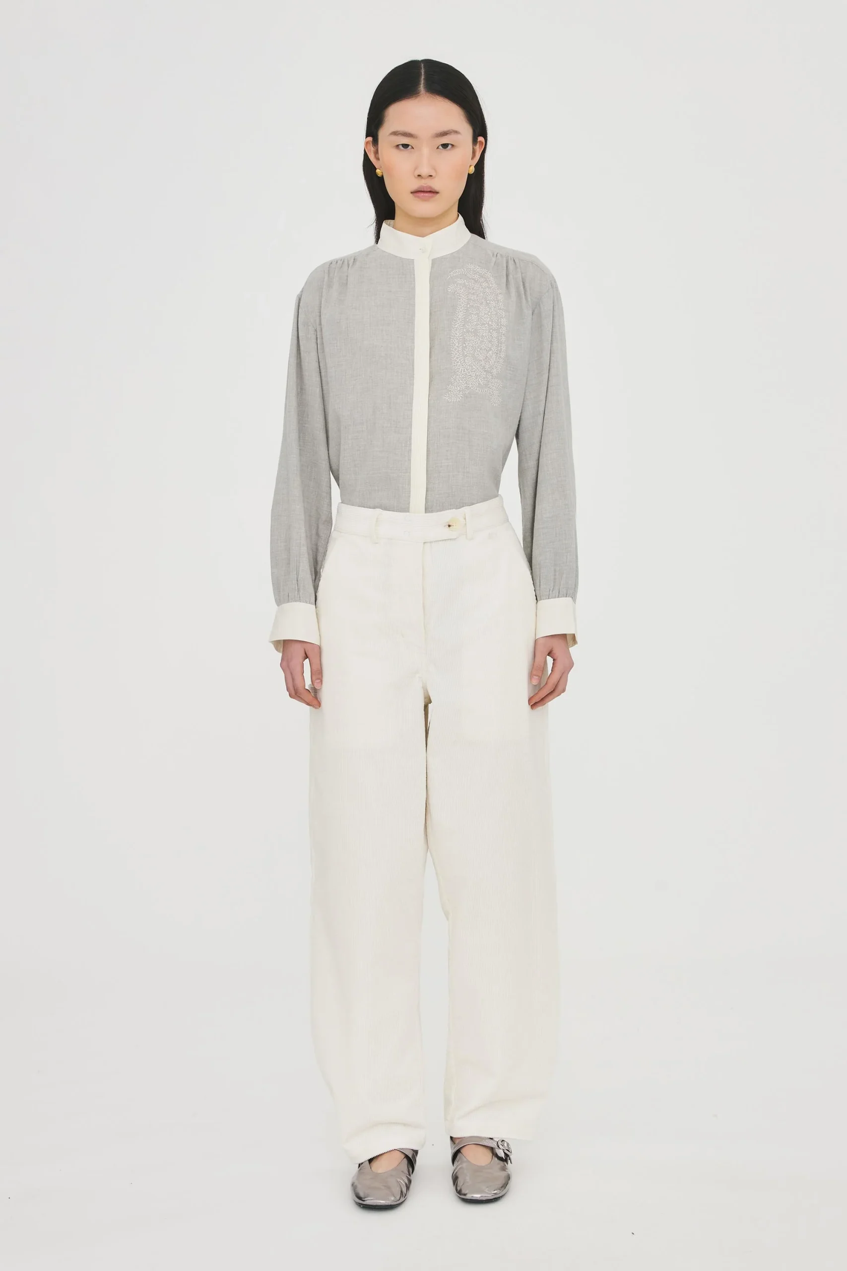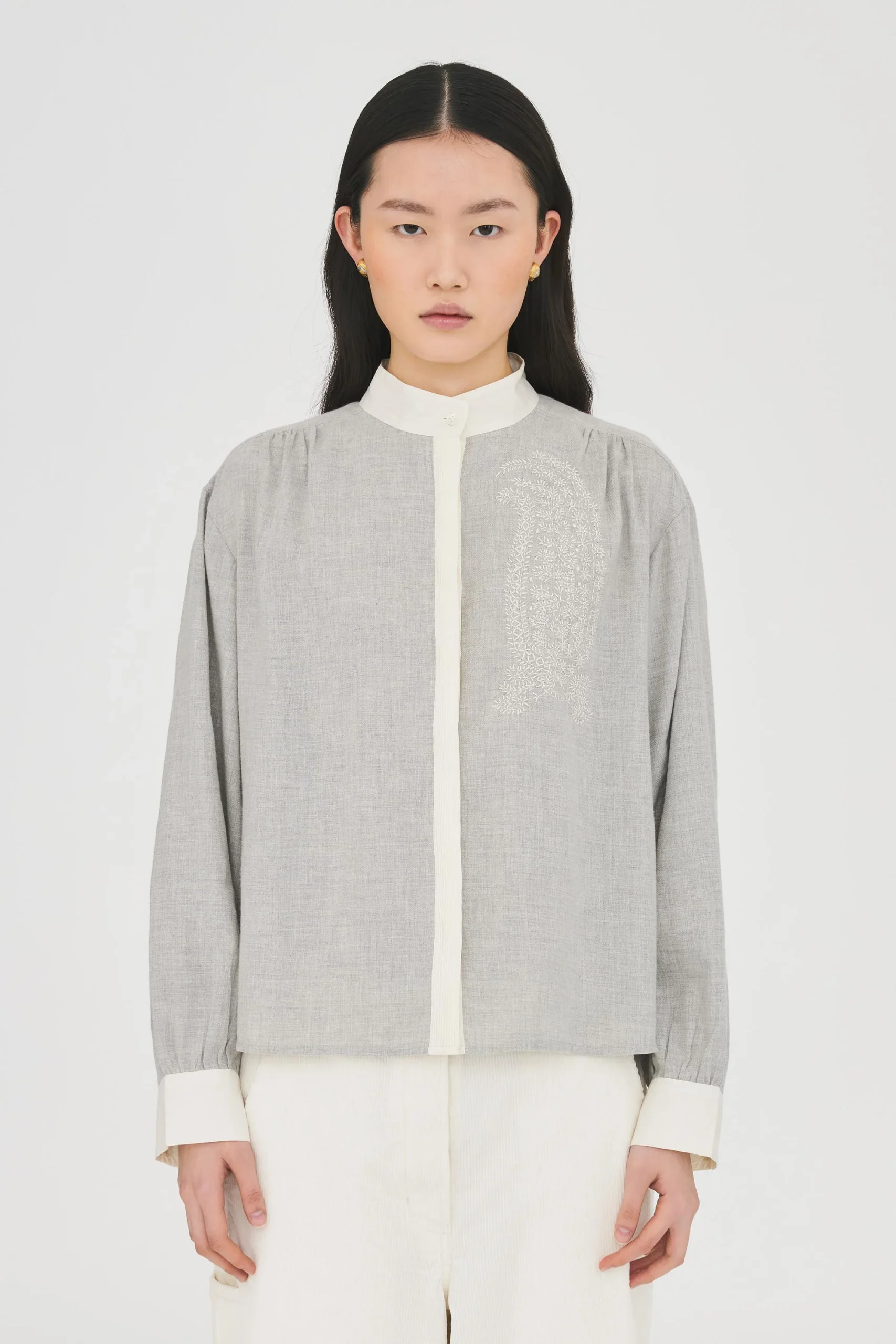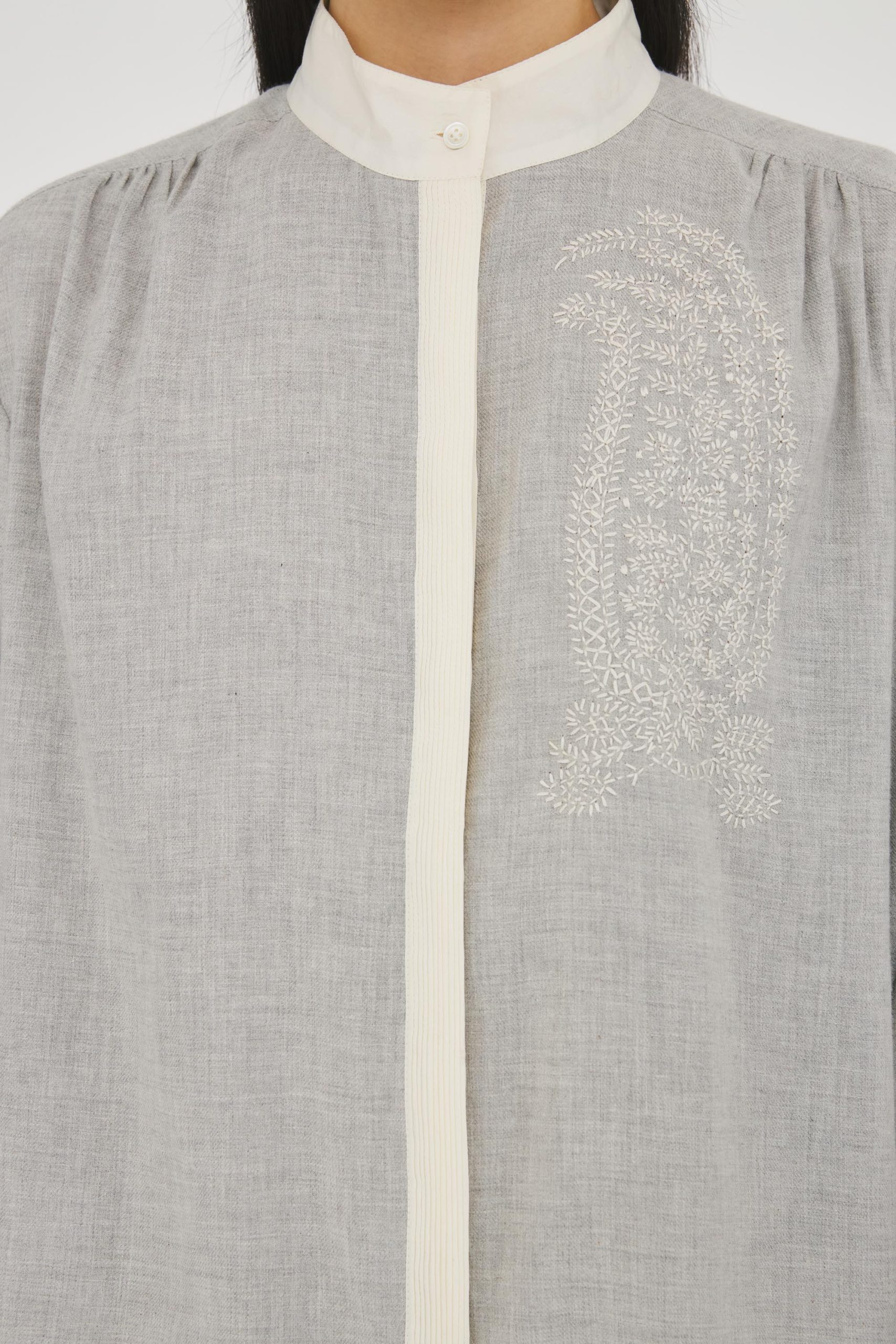 Blouse en flanelle de coton à col mao. Broderie main sur le devant de la blouse. Manches longues. Patte de boutonnage dissimulée. Col, patte de boutonnage et poignets en tissu.