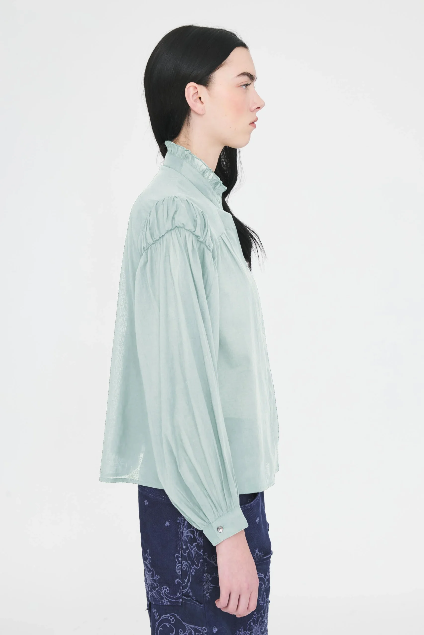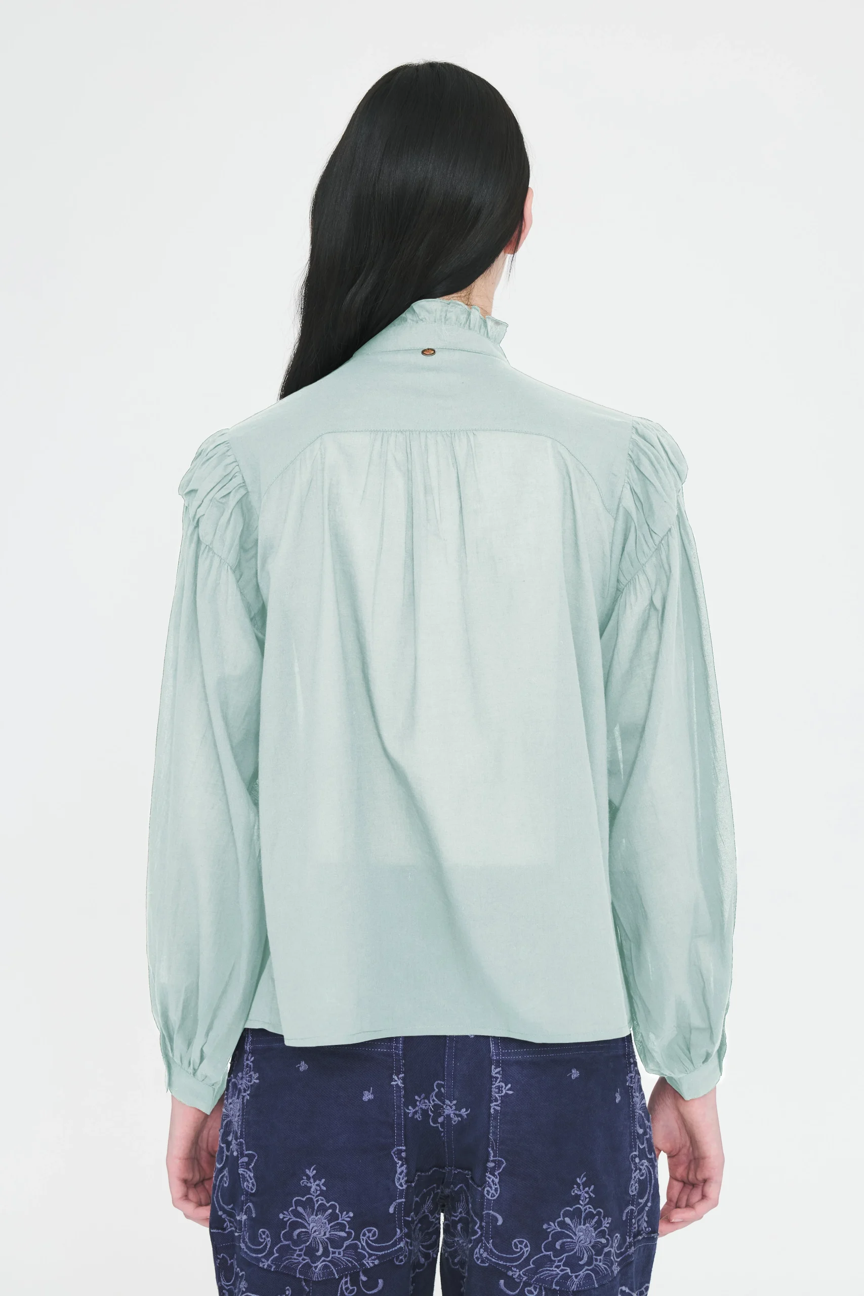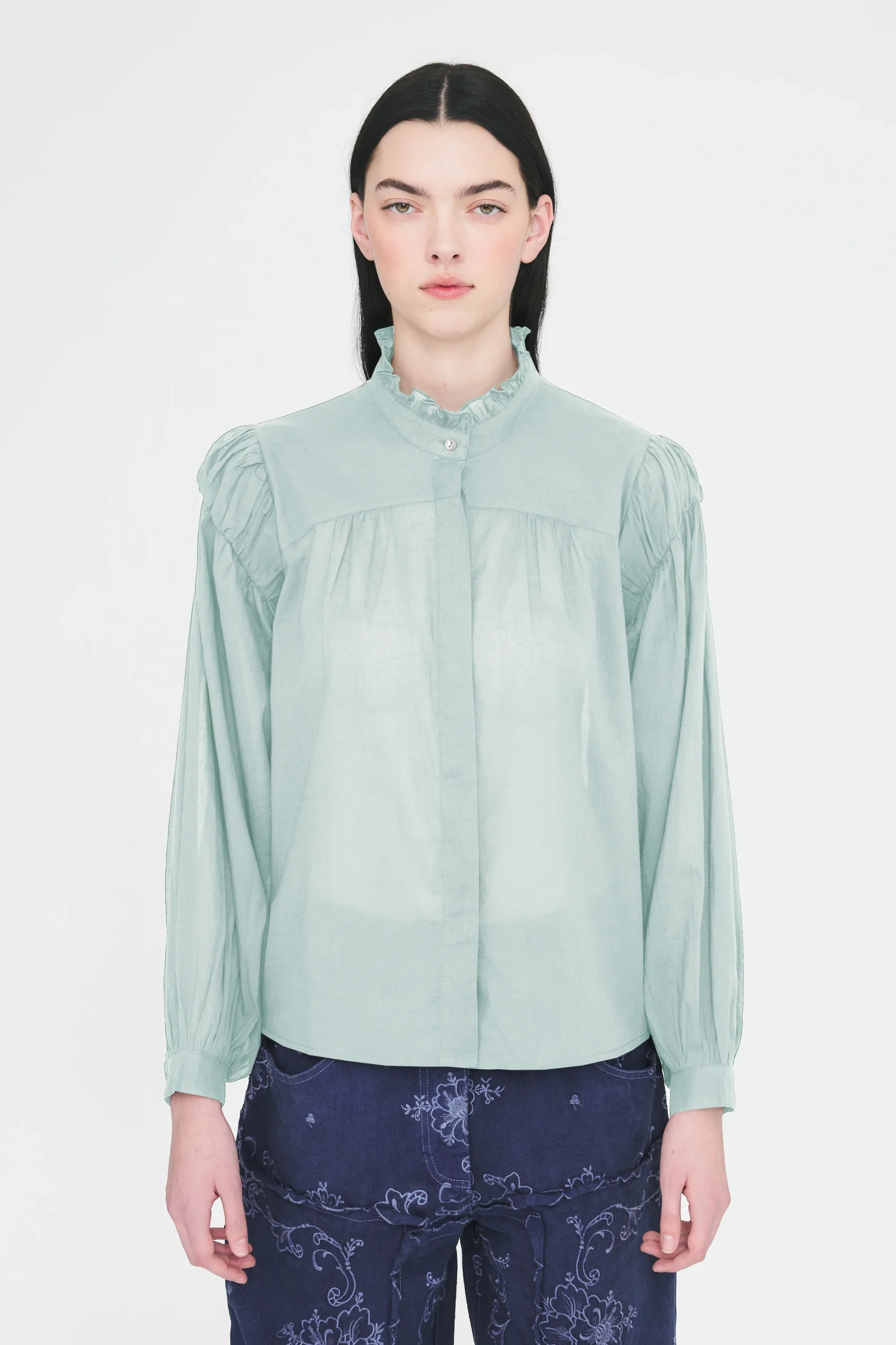 Blouse en voile de coton. Manches longues. Fronces au niveau de la poitrine et aux épaules. Mini col montant volanté. Patte de boutonnage dissimulée.