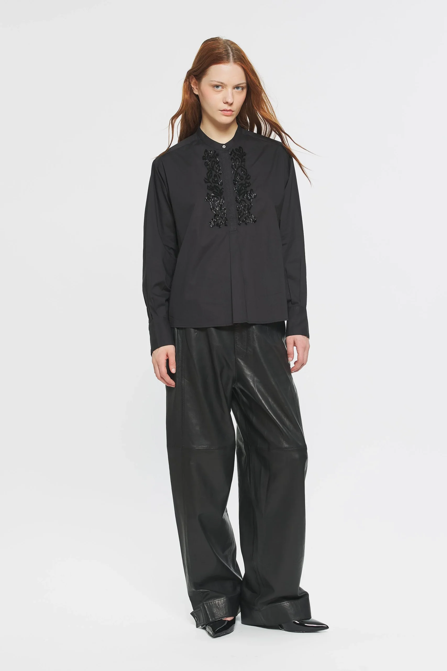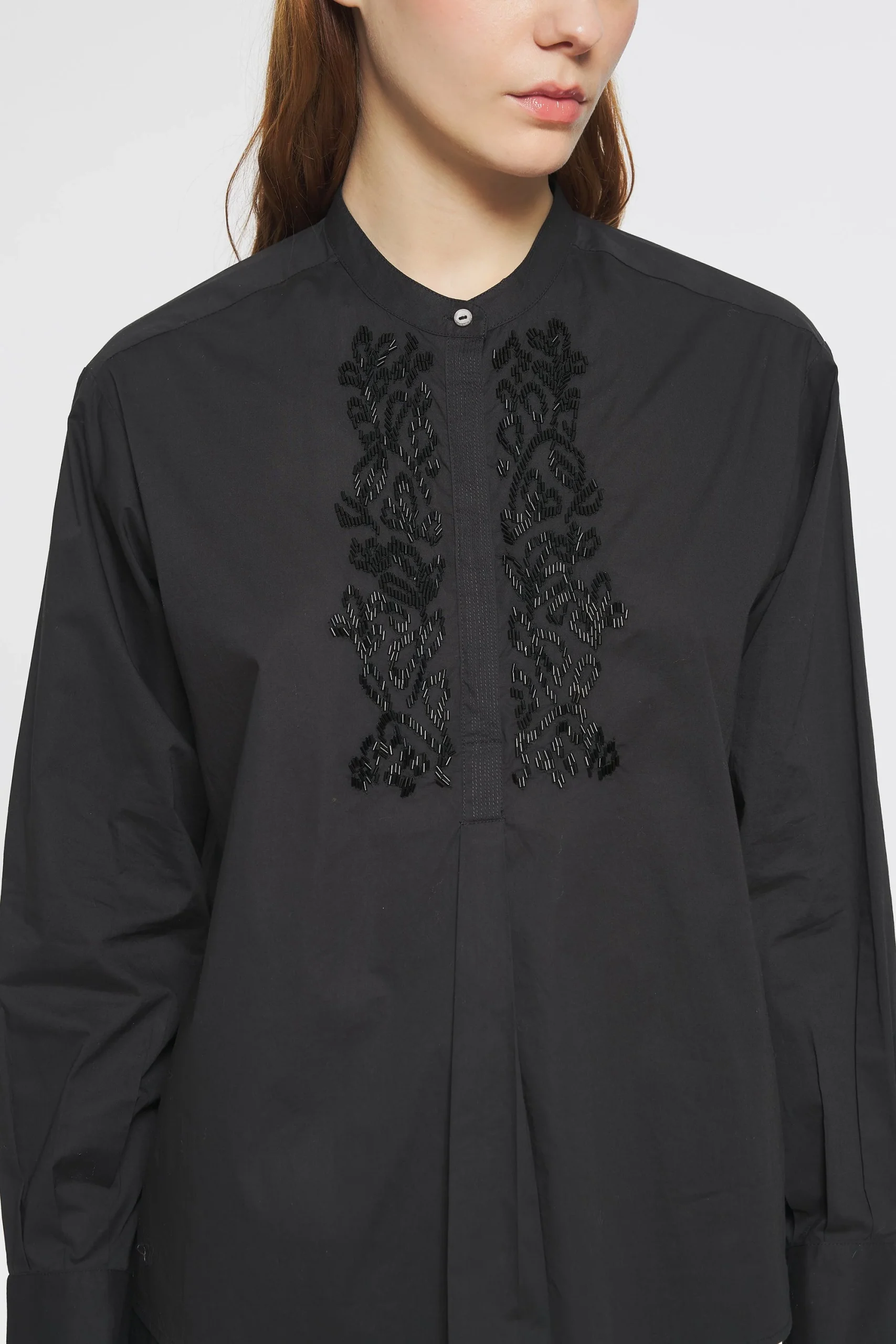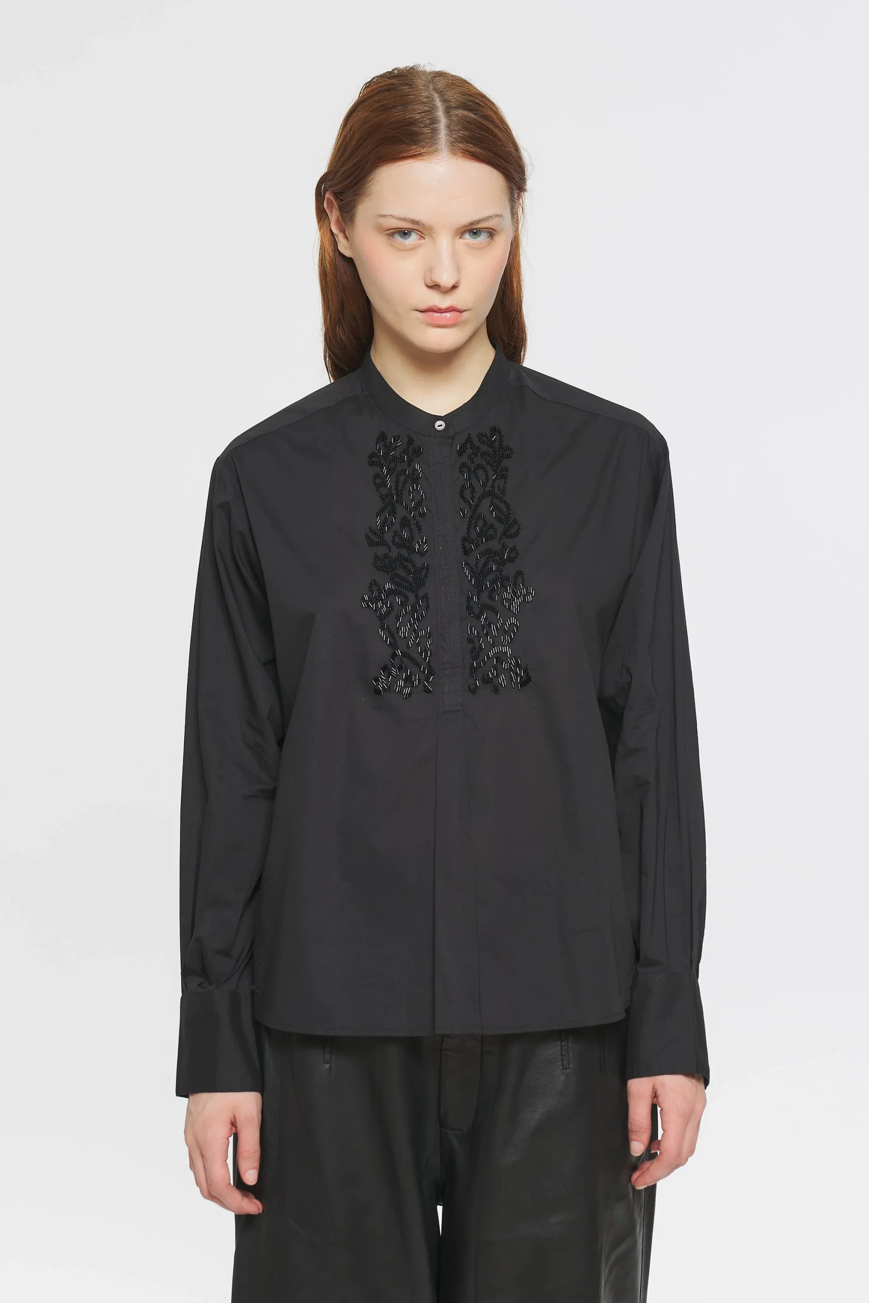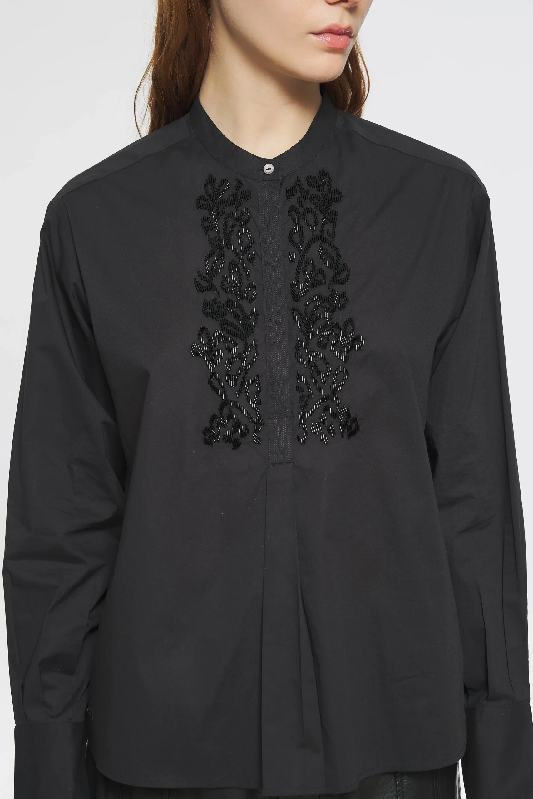 Blouse en coton brodée de perles en verre à la main sur le devant. Poignets et col fermés par un bouton en nacre naturelle.