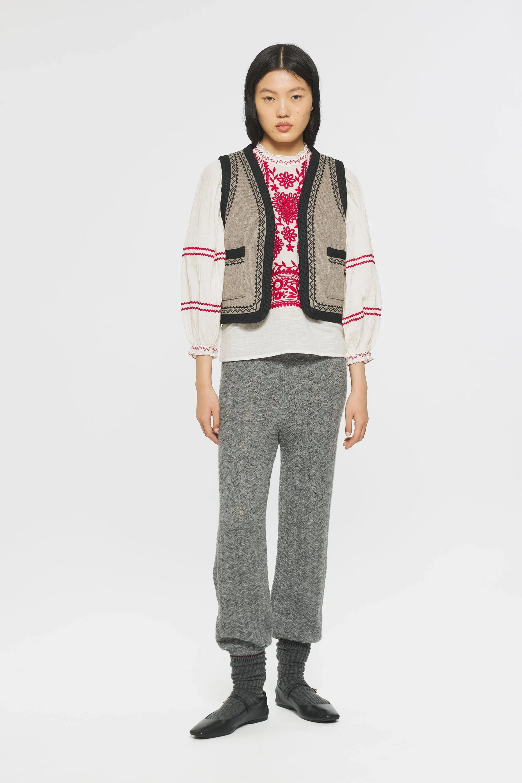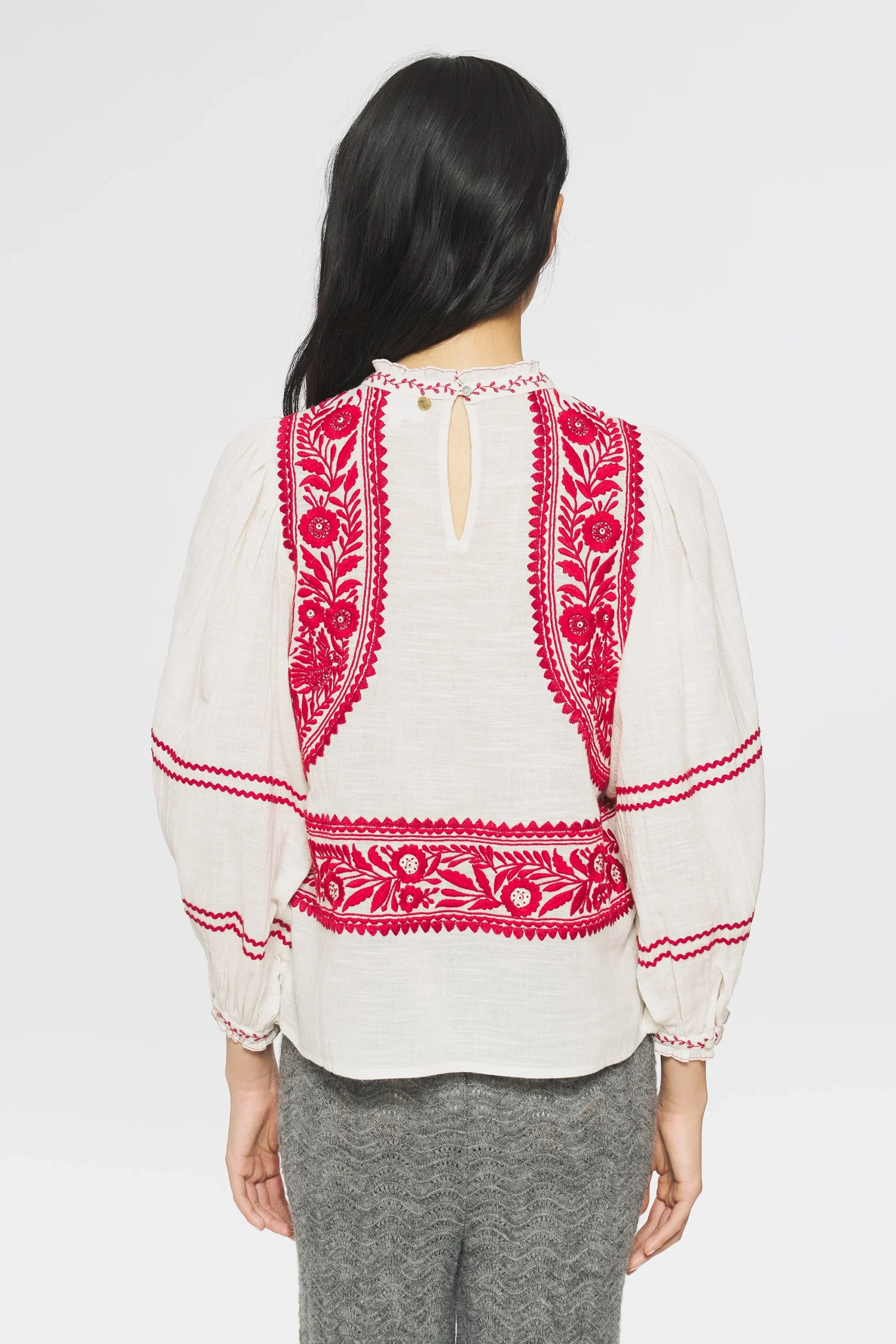 Blouse brodée en crêpe de coton. Col rond volanté. Ruban brodé sur le devant, épaules, emmanchure, col et poignets. Patte de boutonnage. Bas de manche fermé à l’aide d’un bouton en nacre naturelle.