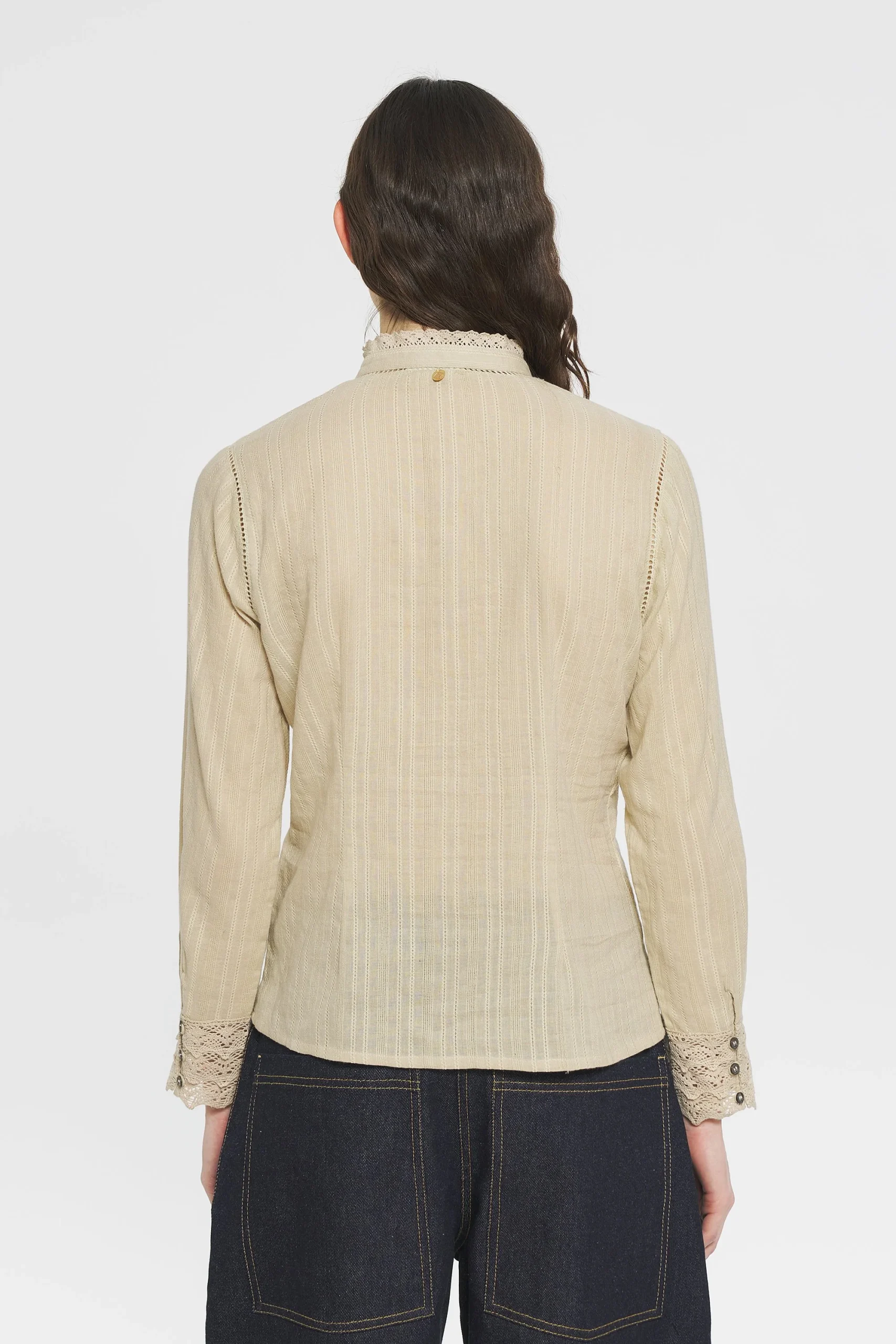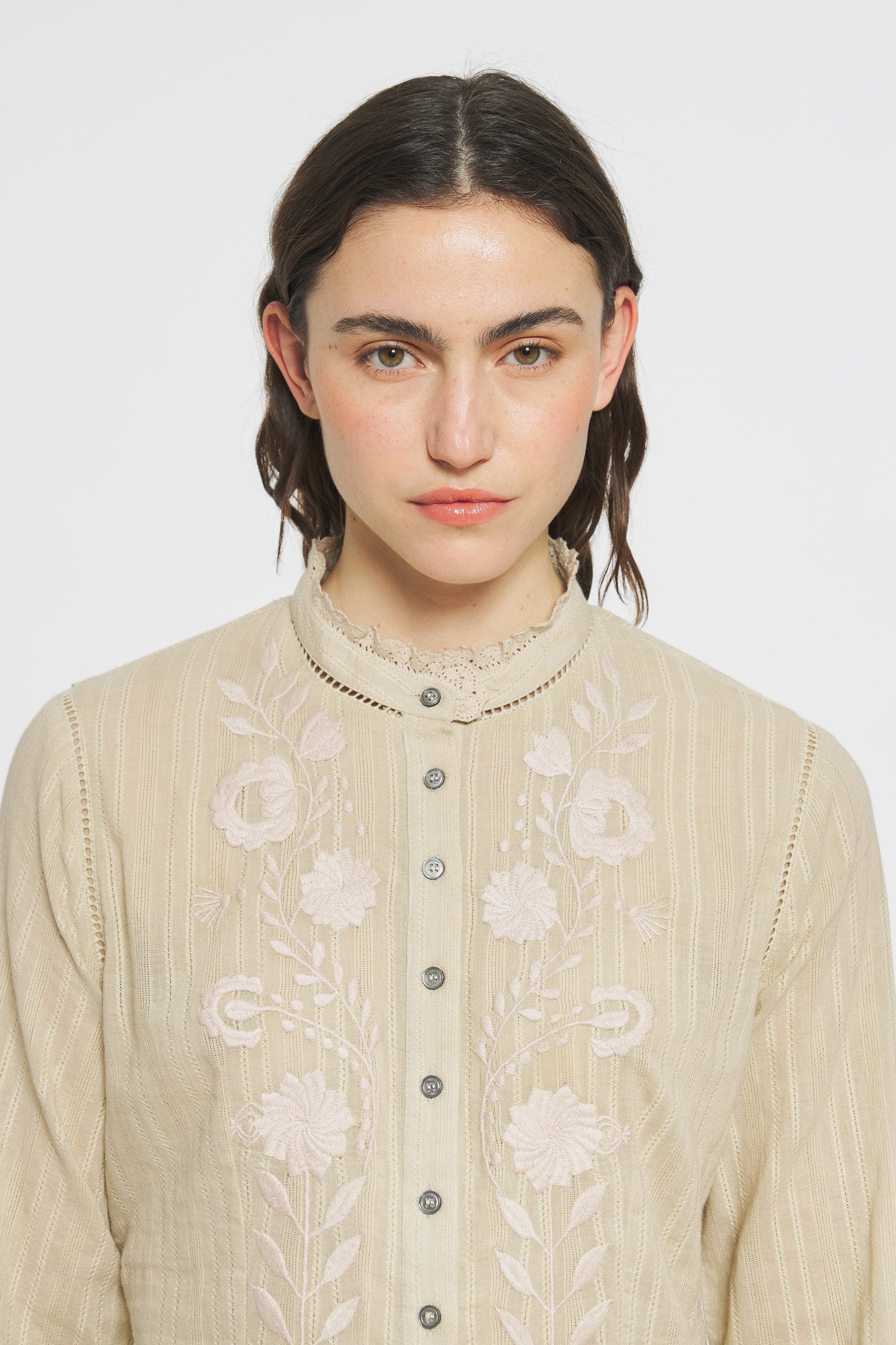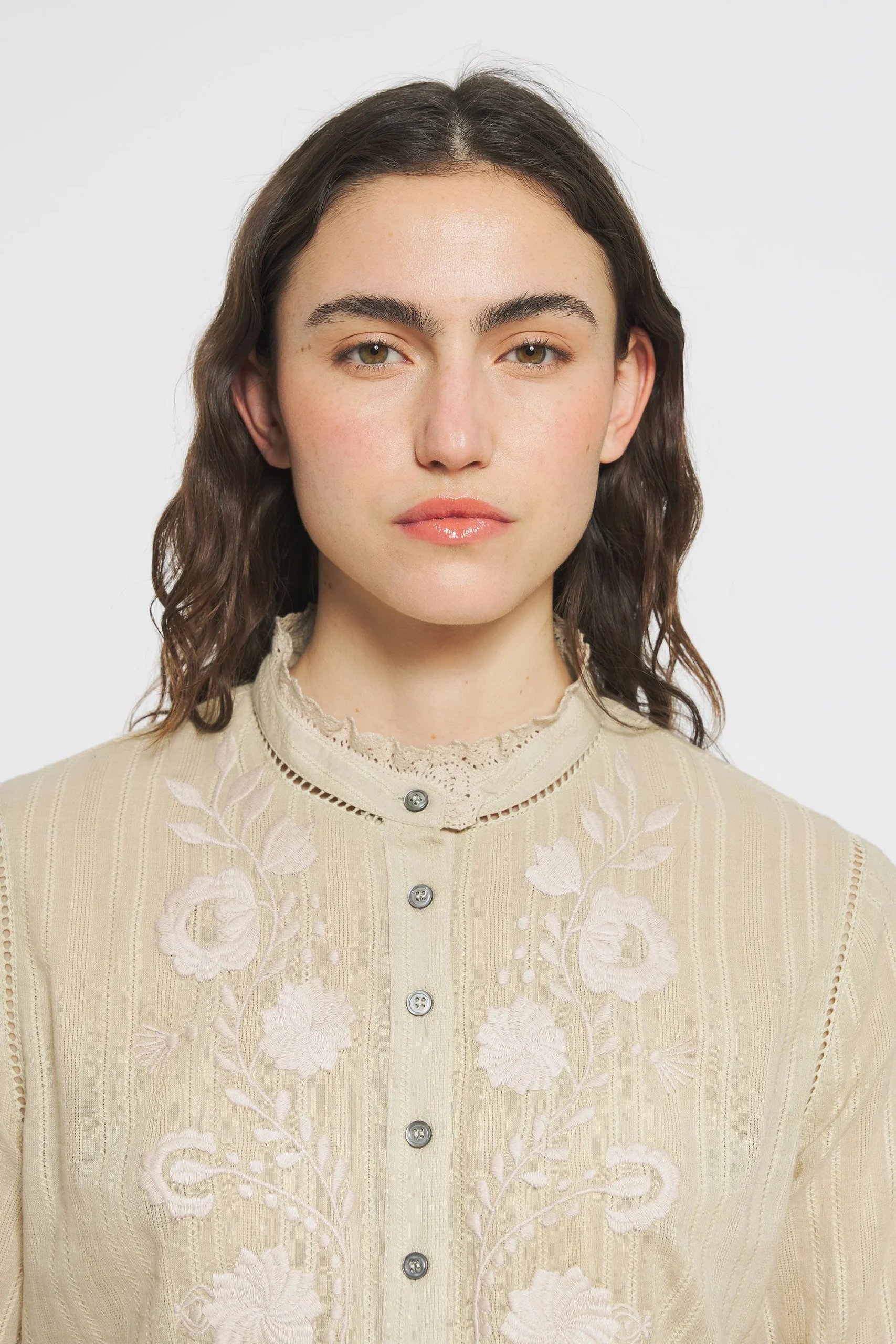 Blouse brodée en crêpe de coton. Col rond volanté. Manches aux poignets par une dentelle en coton. Patte de boutonnage sur le devant. Boutons en nacre naturelle.