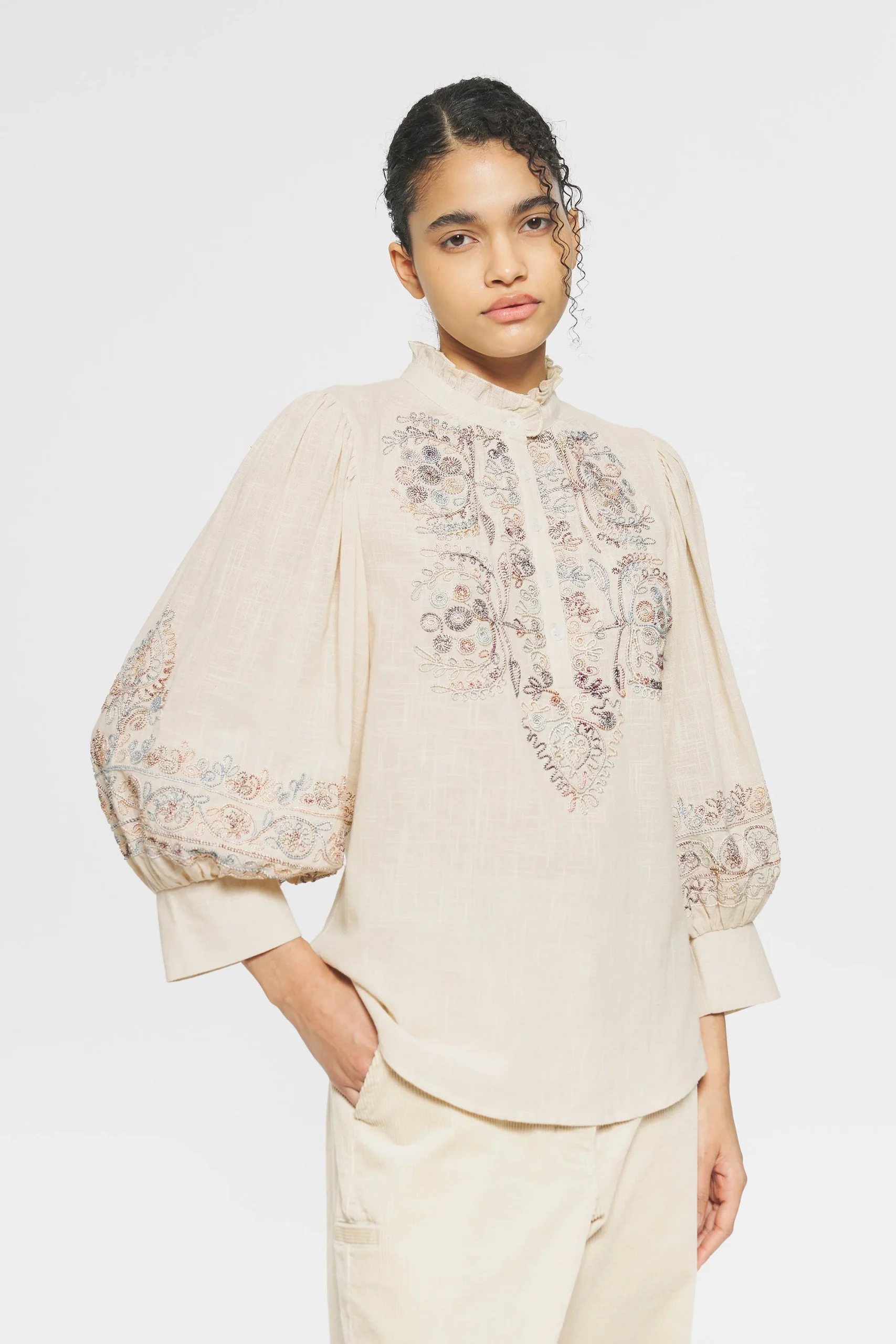 Blouse brodée en coton. Broderies en fil tie and dye de coton cousu au niveau du plastron et des manches. Volants au col. Manches bouffantes.