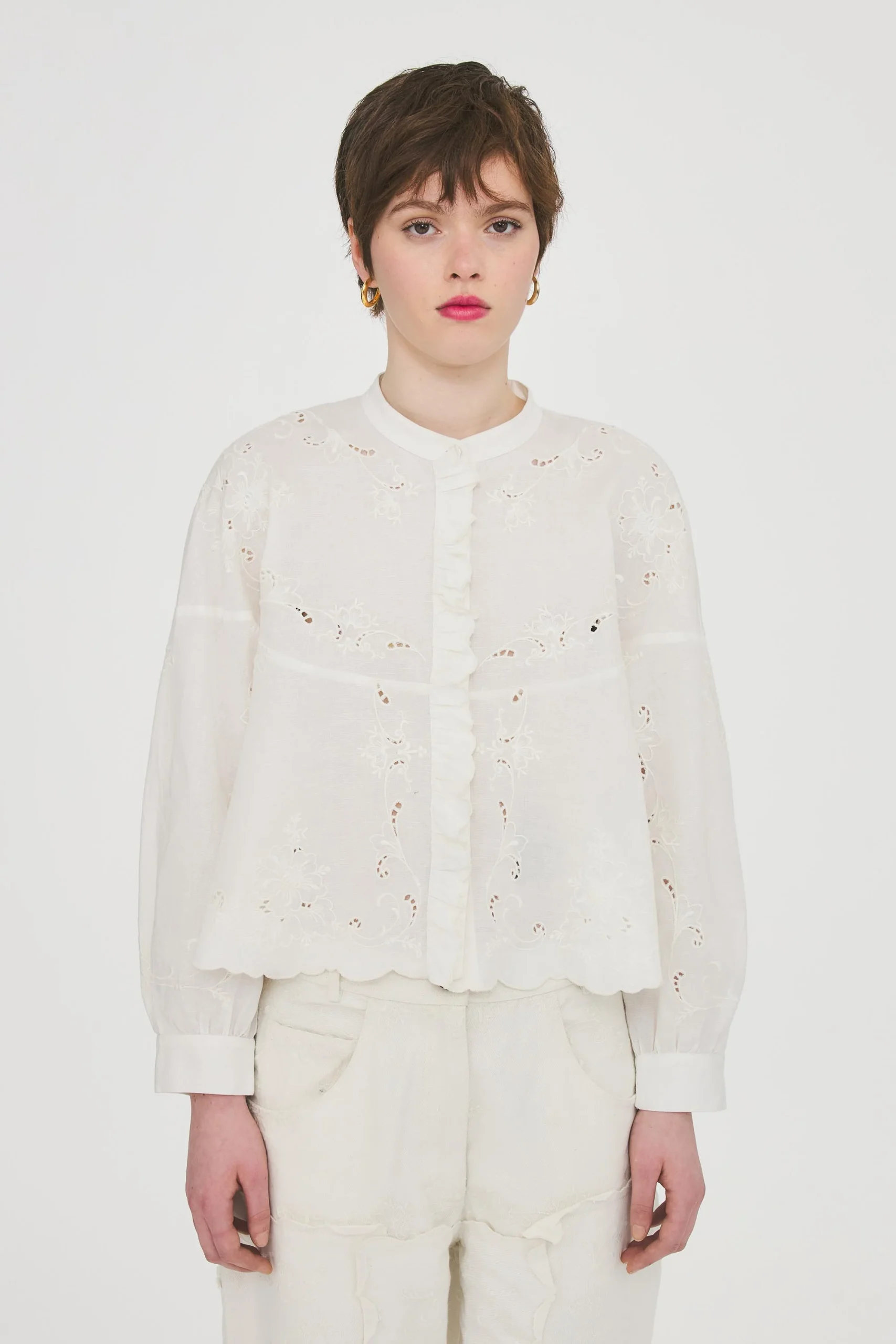 Blouse en coton denim et lin. Blouse entièrement brodée artisanalement. Découpe ondulée. Col mao boutonné.