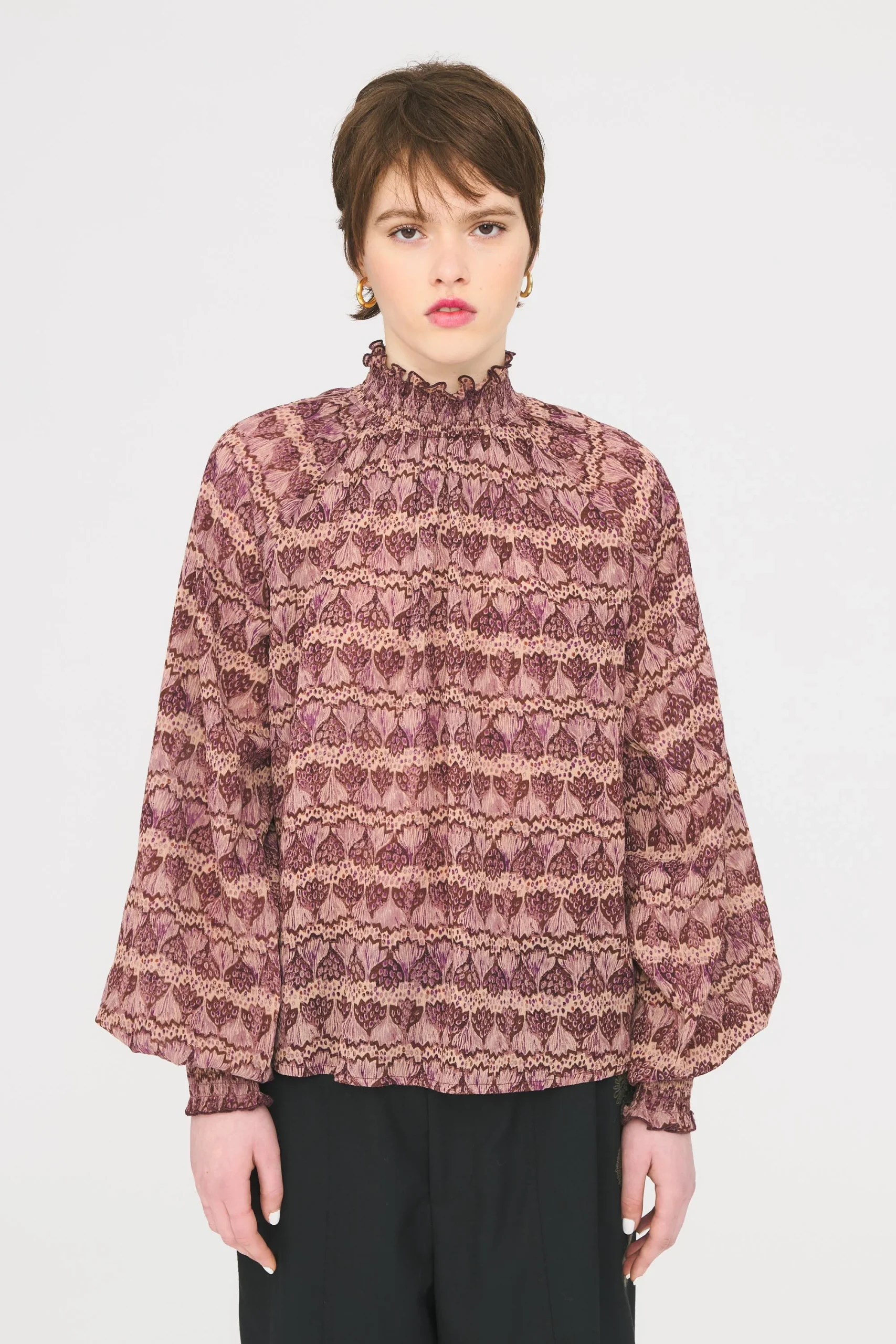 Blouse ample en coton et viscose imprimé. Petit col élastiqué qui se ferme par un bouton. Poignets élastiqués.