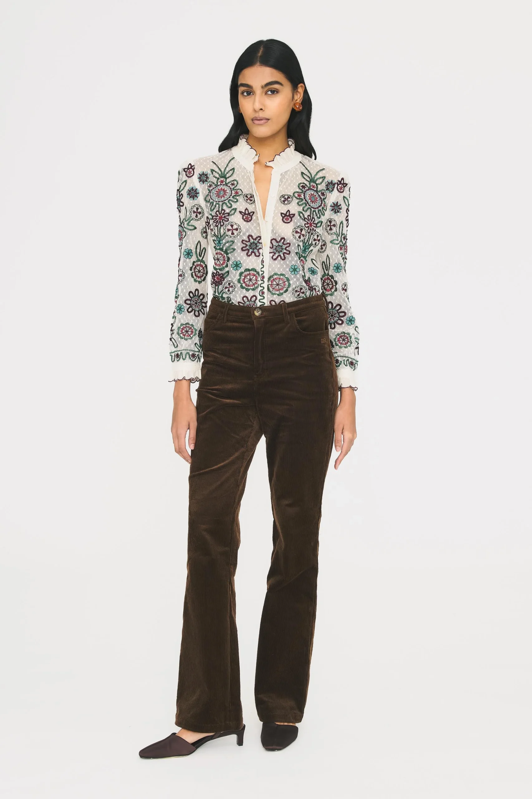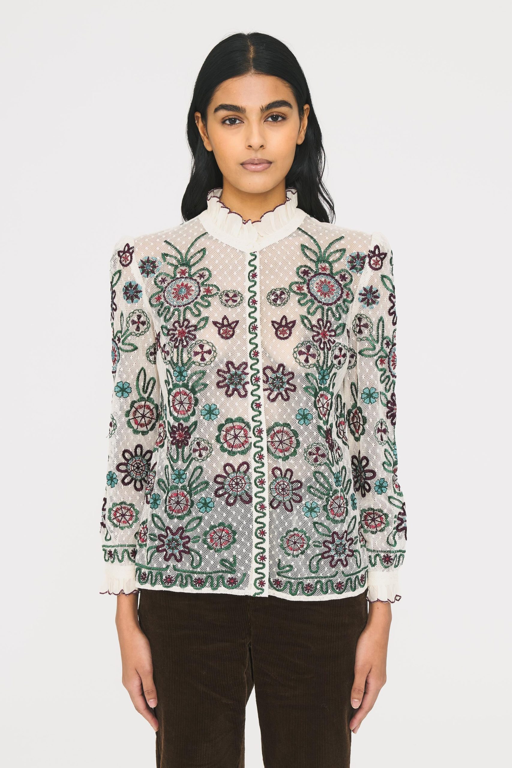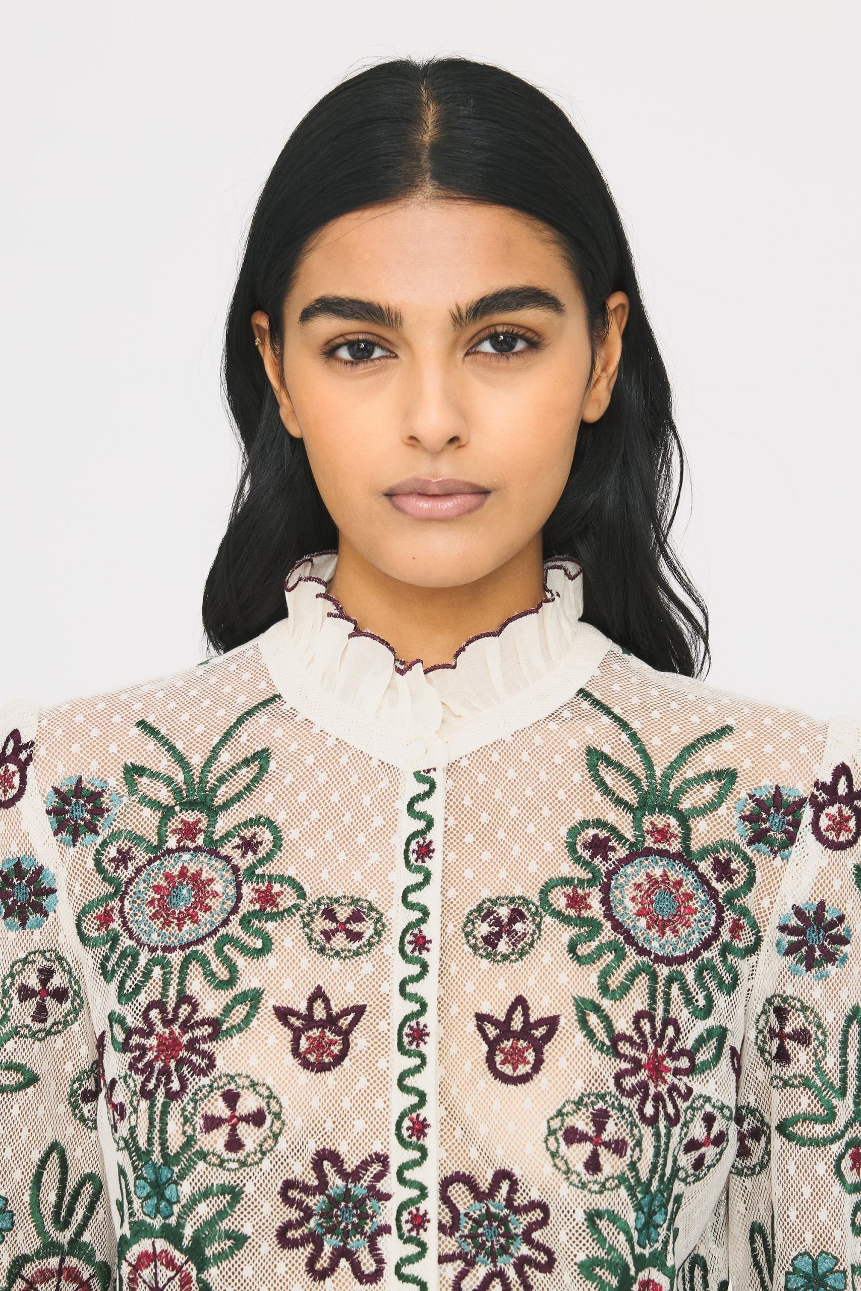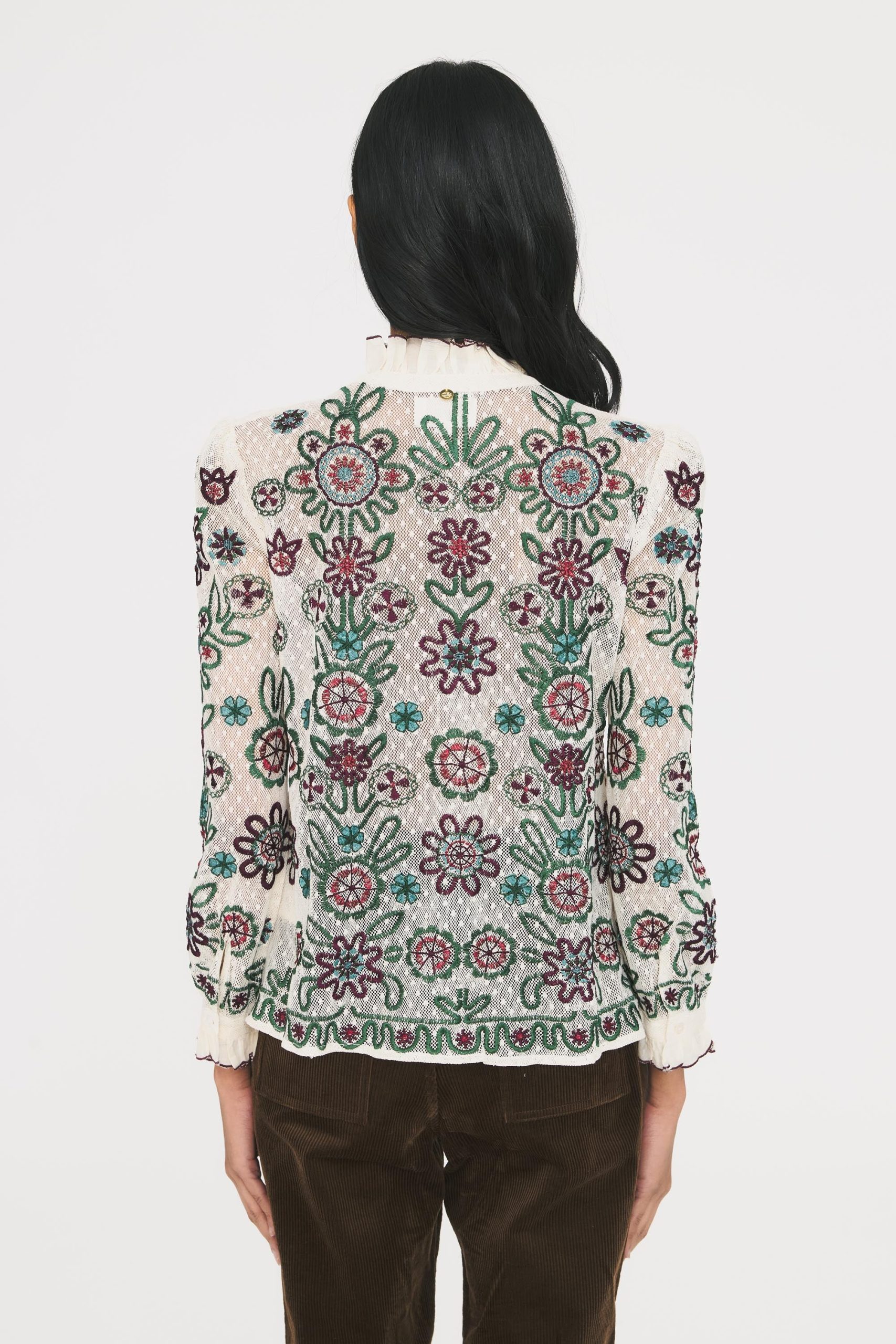 Blouse brodée en résille de coton. Résille avec dessin plumetis. Broderies florales et bicolores. Poignets et col cousus en corolle. Fils satinés.