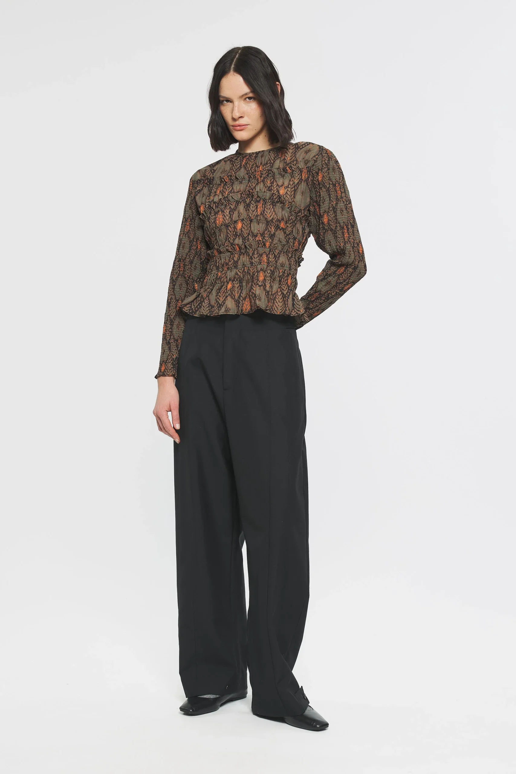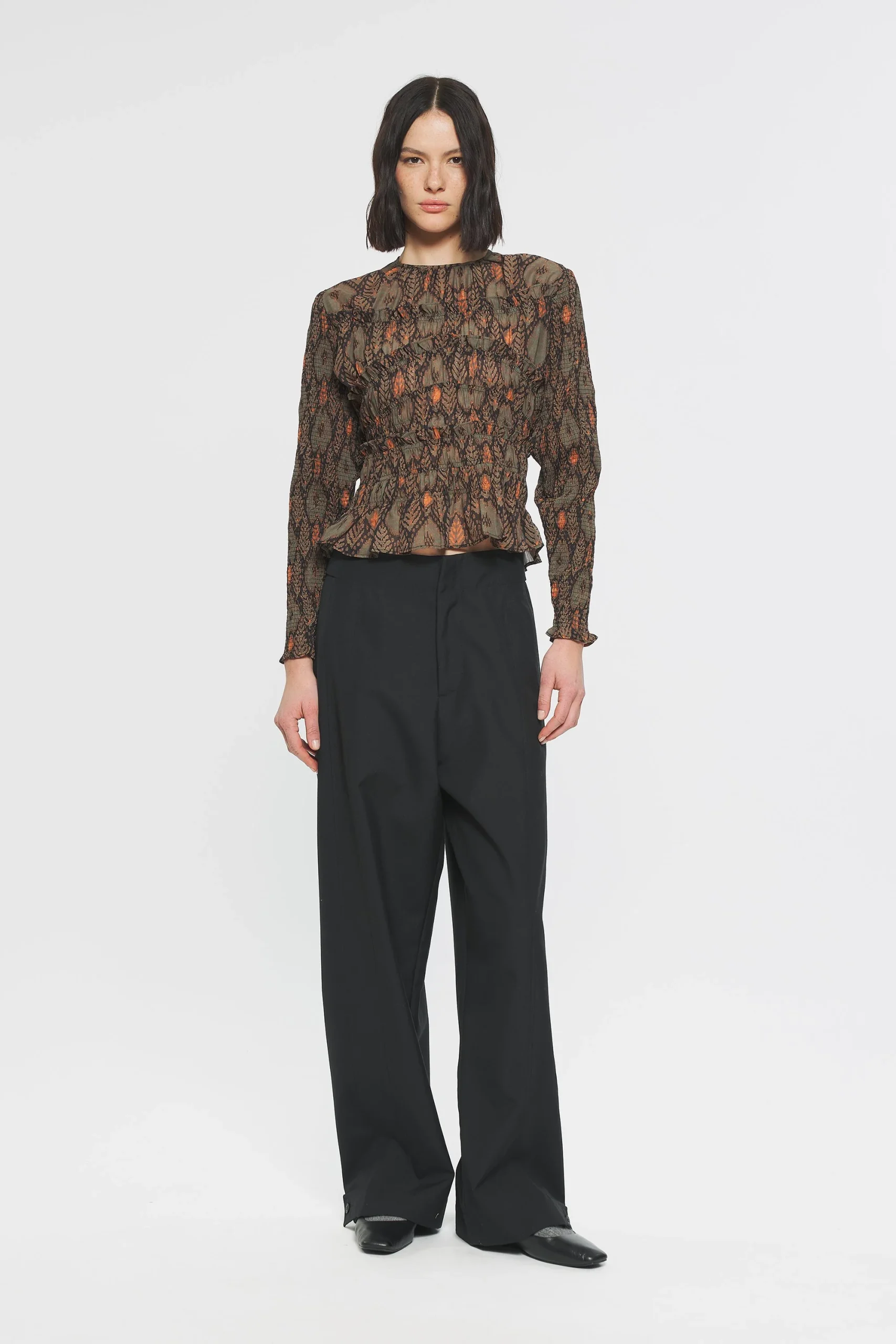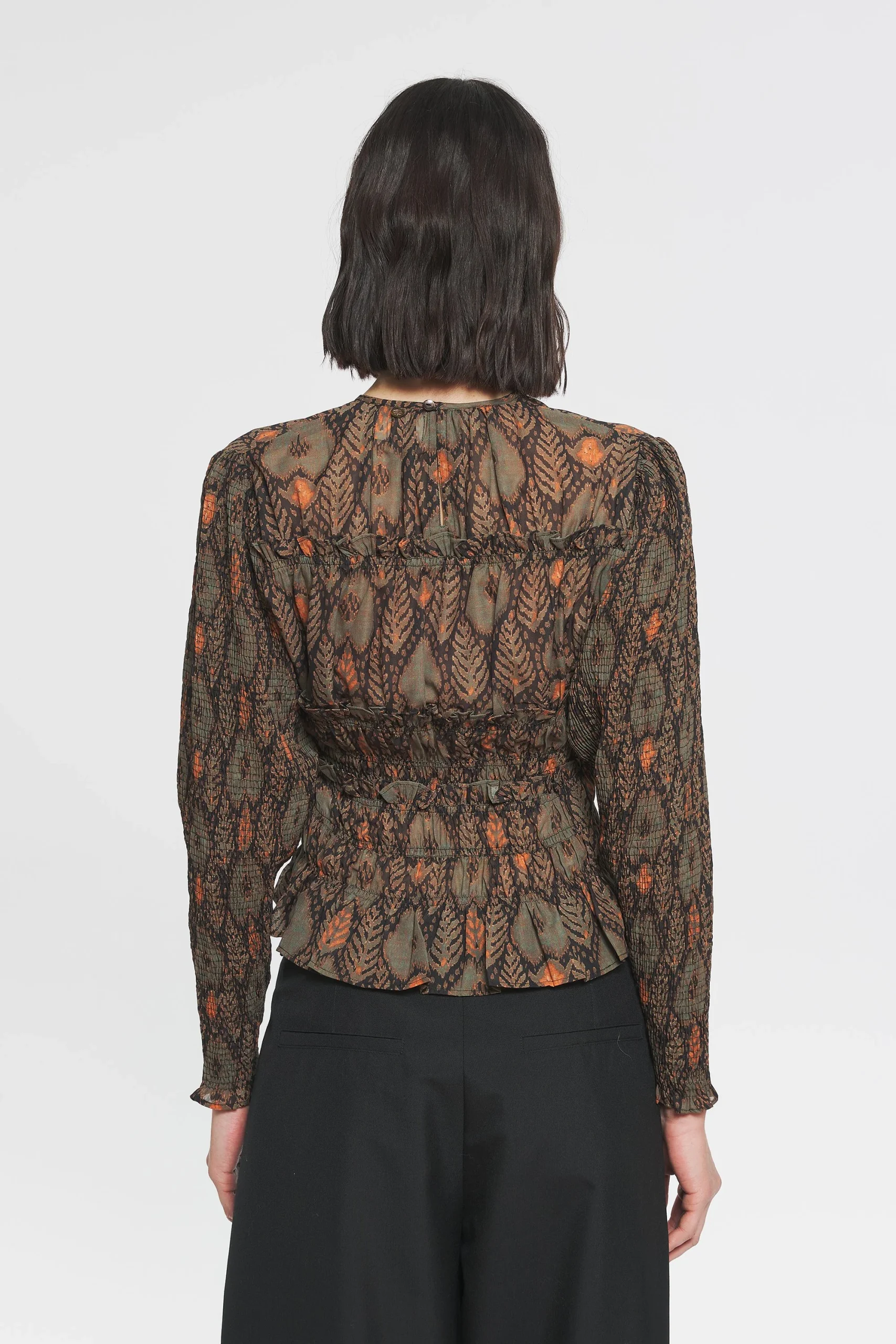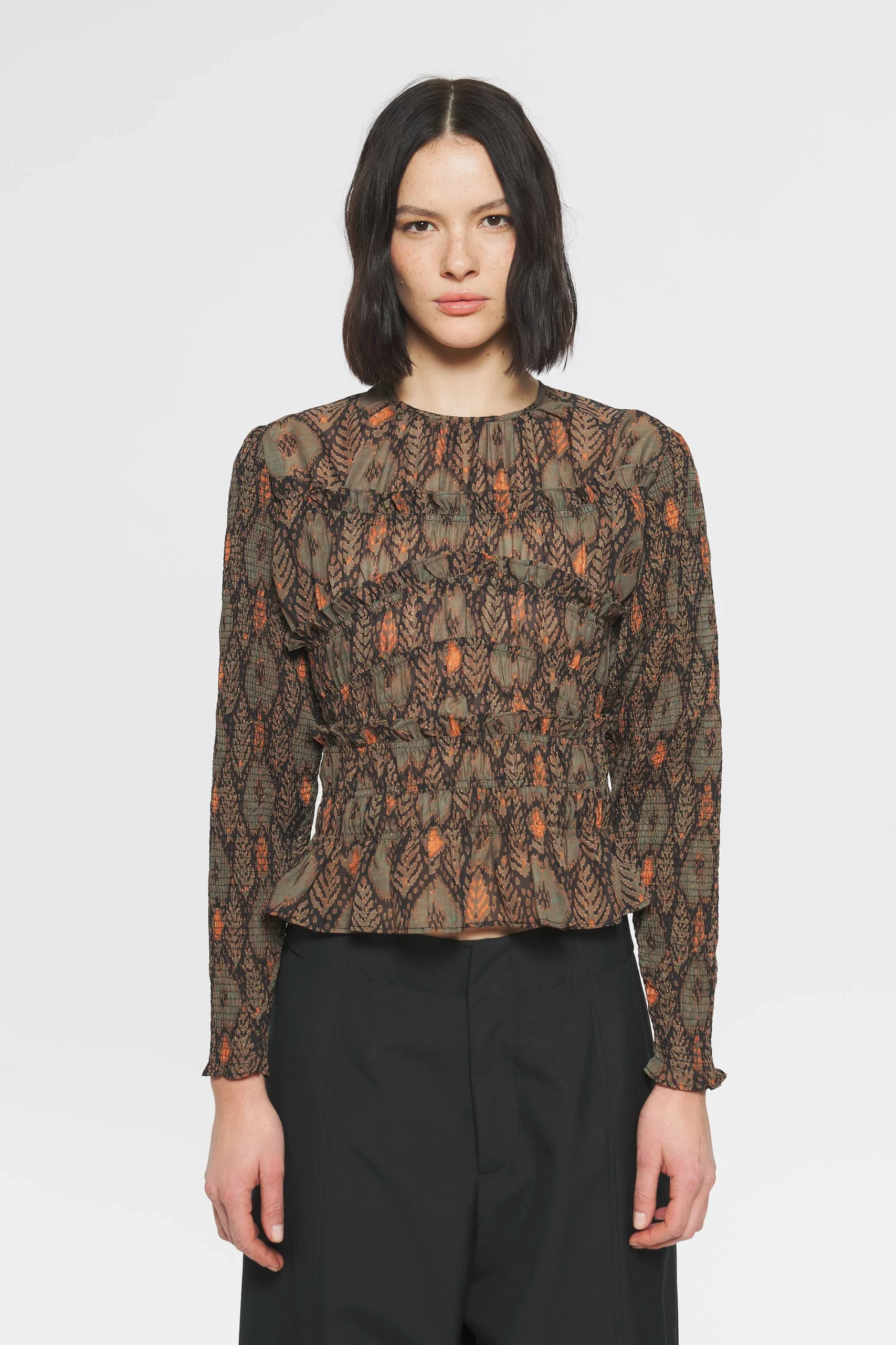Blouse smockée. Tissu imprimé, léger et fin. Fronces aux épaules. Manches longues resserrées aux poignets par des élastiques. Col et poignets volantés.