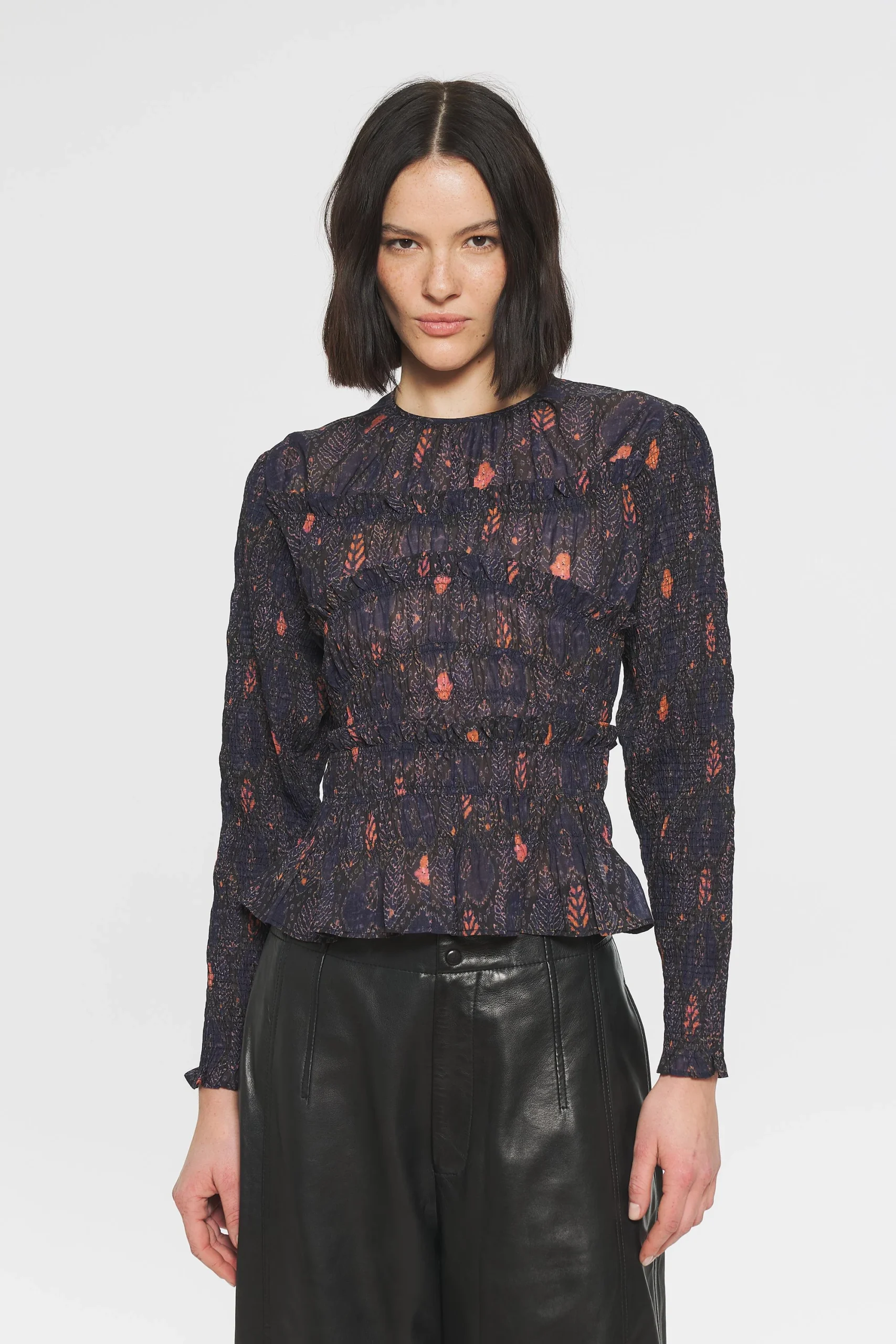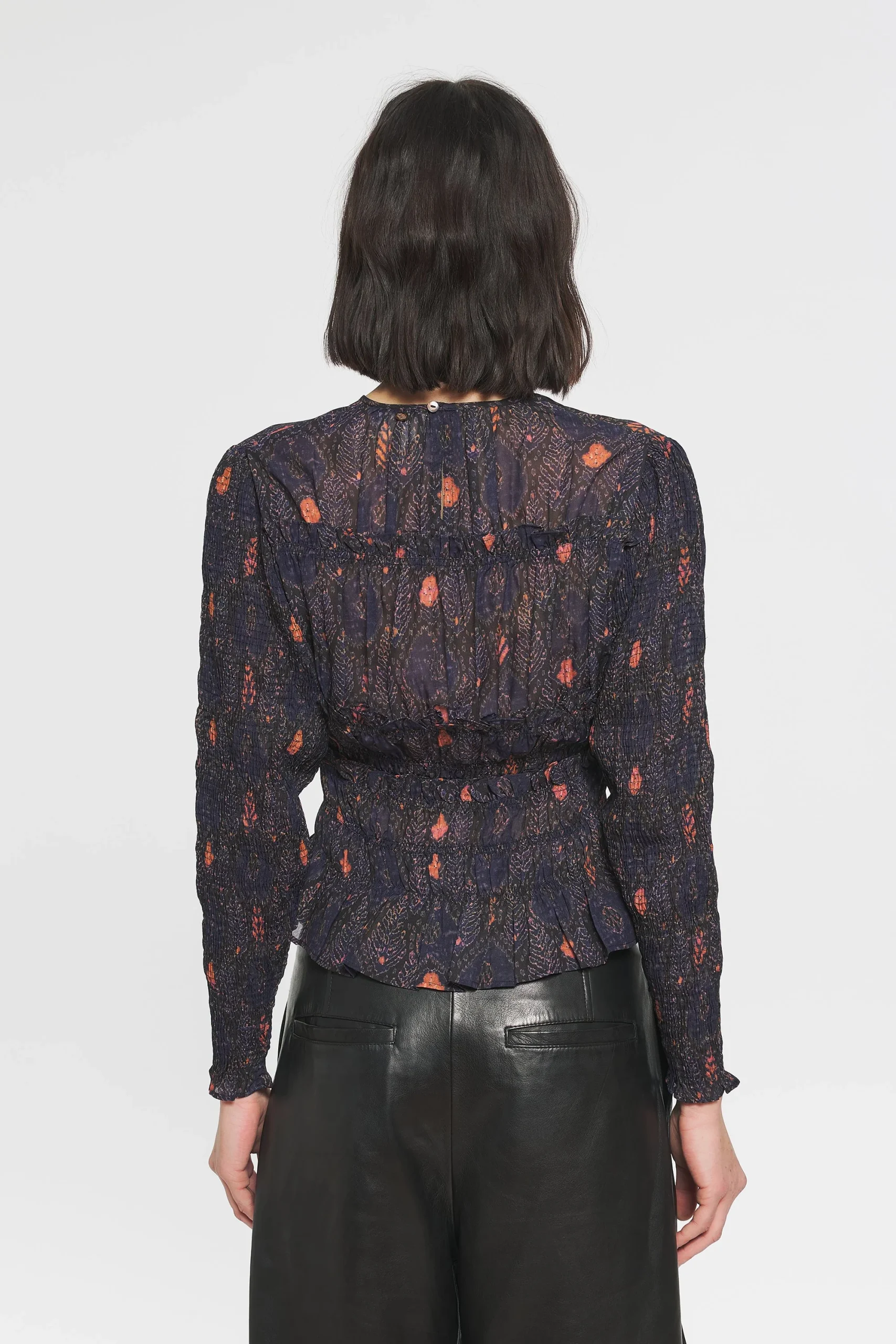 Blouse smockée. Tissu imprimé, léger et fin. Fronces aux épaules. Manches longues resserrées aux poignets par des élastiques. Col et poignets volantés.