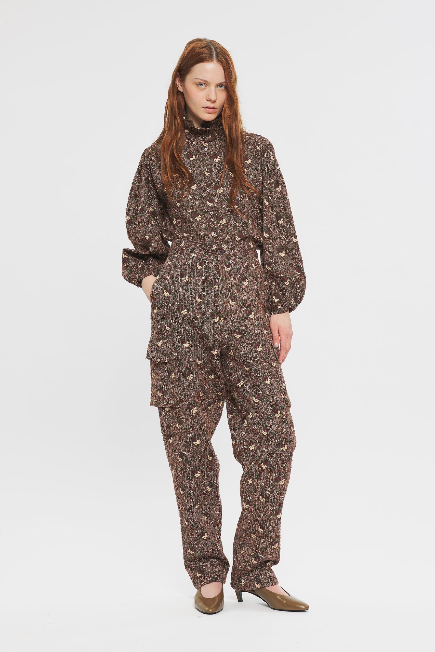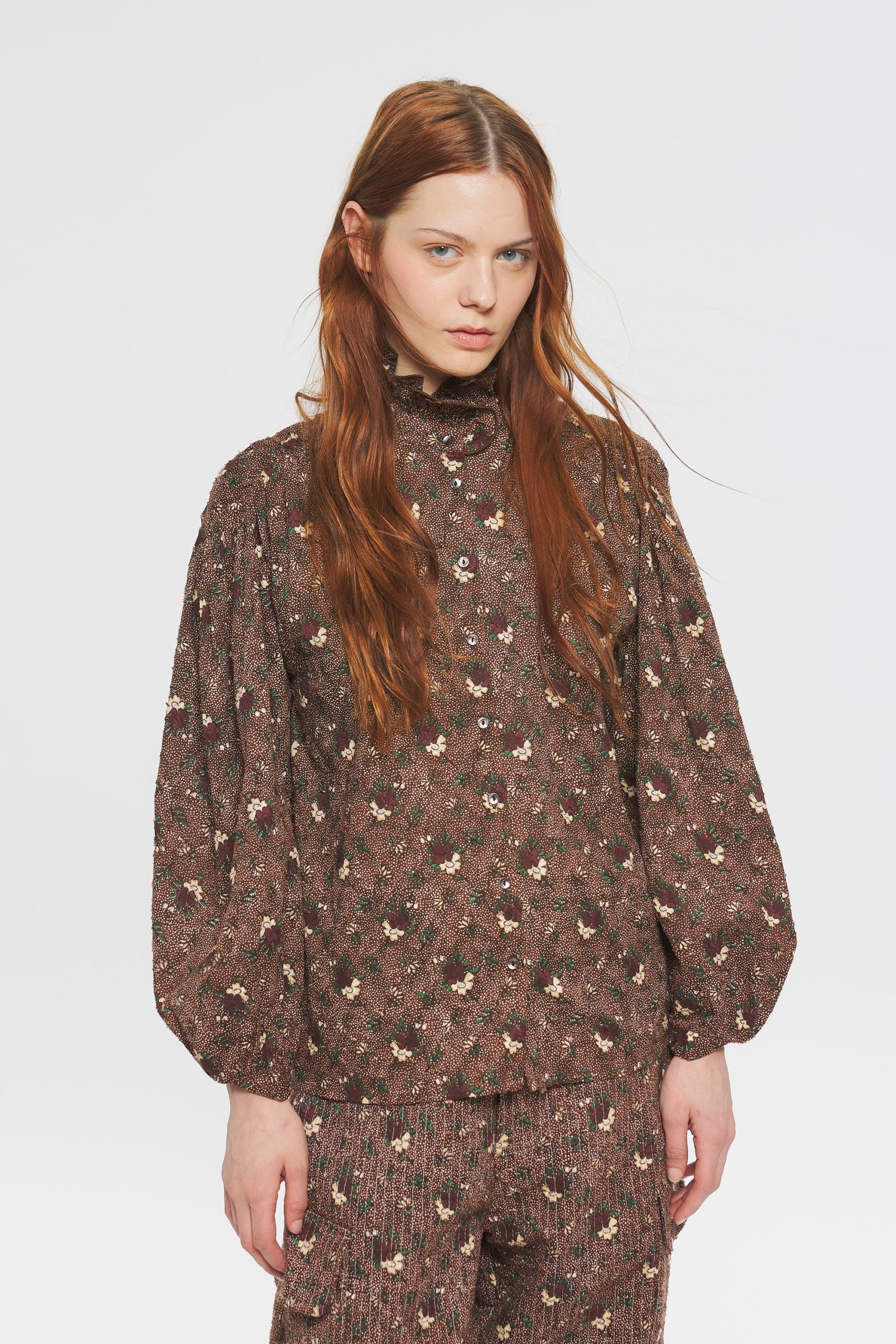 Blouse en voile de coton. Patte de boutonnage sur le devant et aux poignets. Manches ballon resserrées aux poignets par des boutons. Col haut.