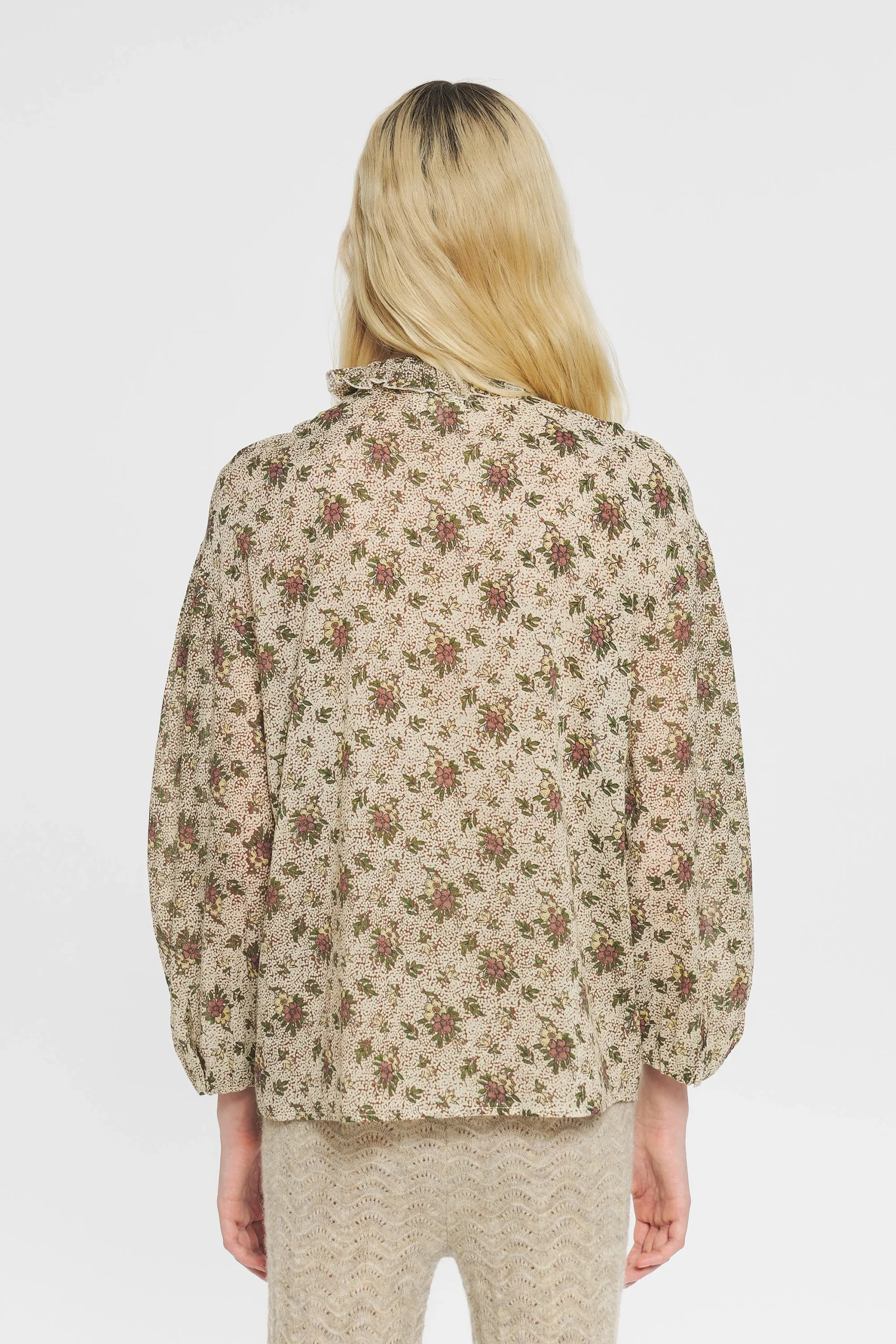 Chemise en voile de coton imprimé. Manches effet ballon resserrées aux poignets par des boutons. Boutons en nacre naturelle. Col froncé légèrement montant.