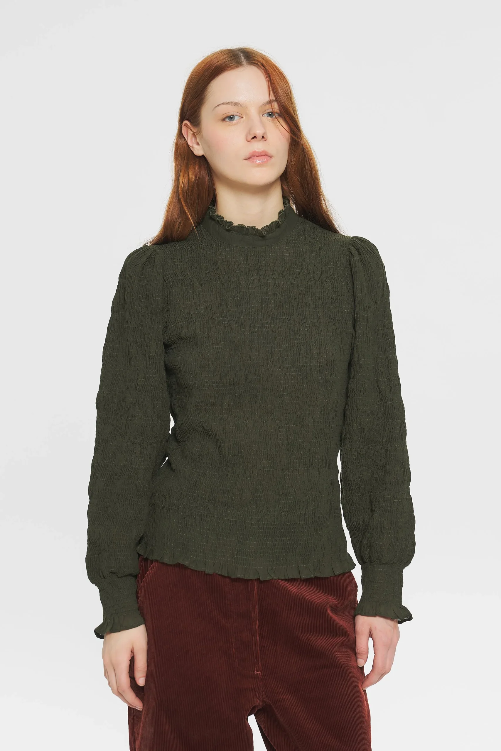 Blouse en voile de coton smockée. Fronces aux épaules et aux poignets. Manches longues resserrées aux poignets par des élastiques. Col, poignets et bas de la blouse volantés. Col rond fermé par un bouton dans le dos. Bouton en nacre naturelle.