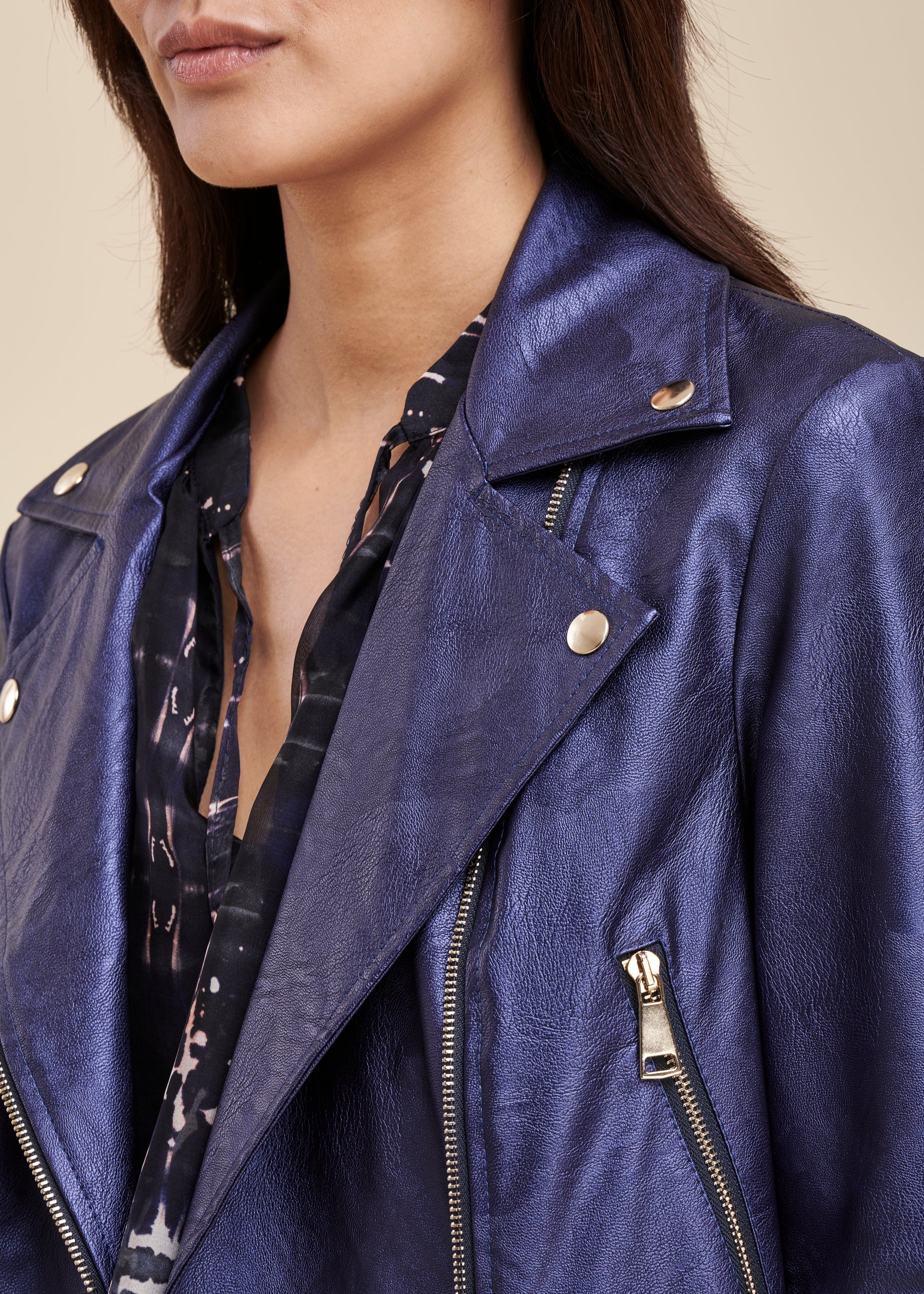 – Blouson coupe « biker » aspect cuir irisé– Manches longues– Col déstructuré avec boutons pression métal or– Fermeture zippée asymétrique devant– Deux poches zippées sur les côtés