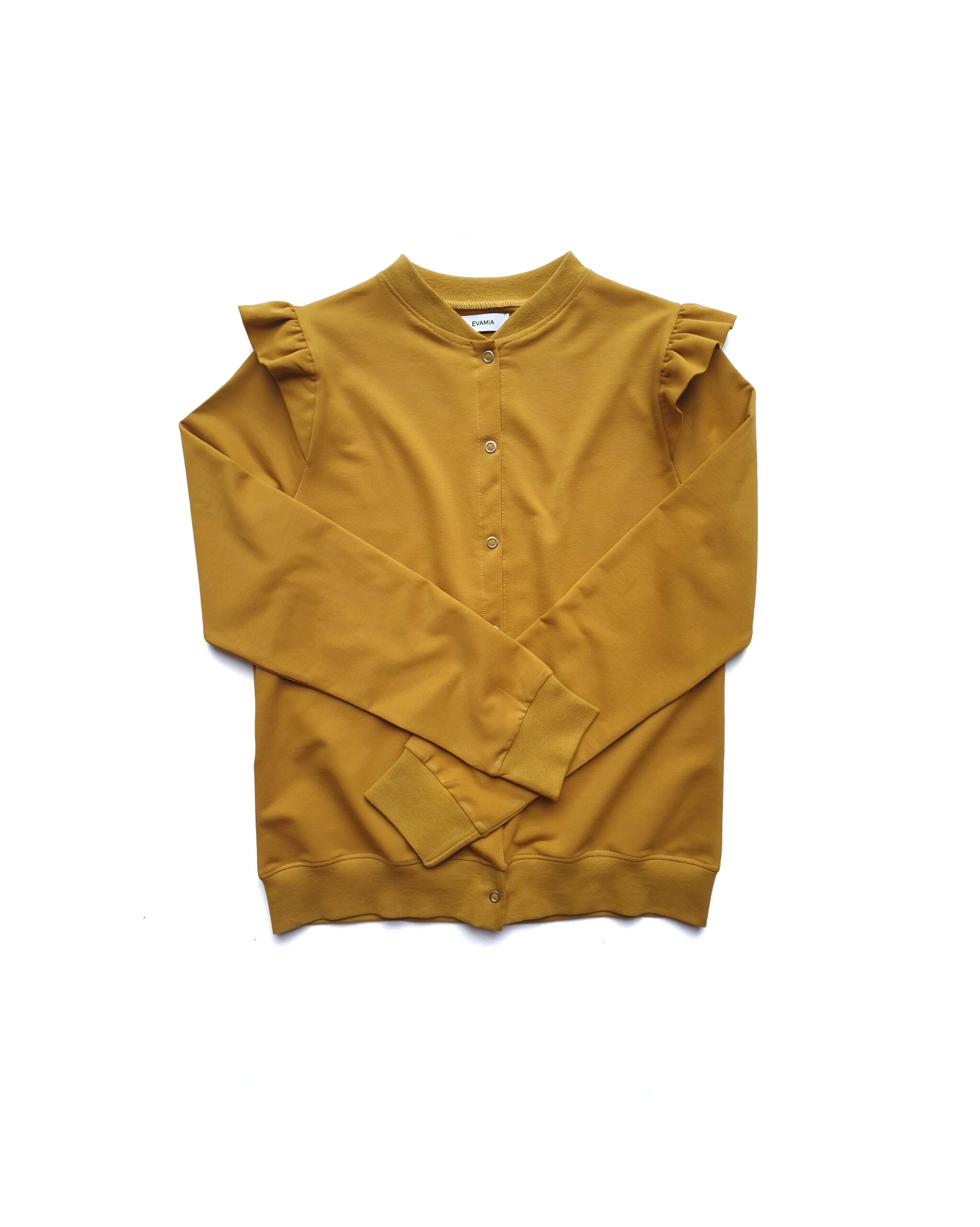 Cardigan en sweat pour femme avec des volants sur les épaules.