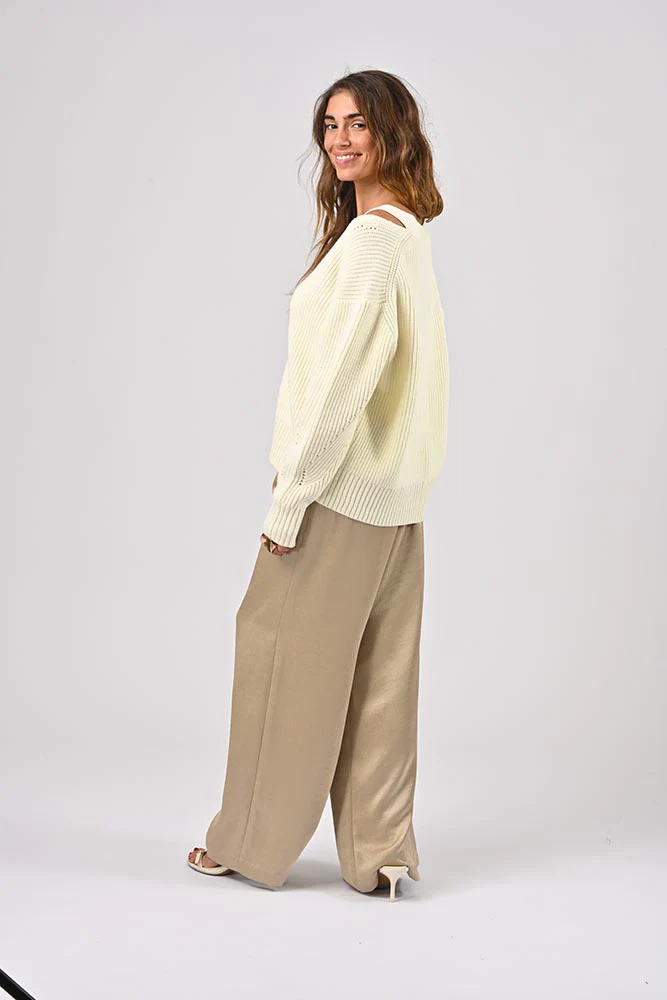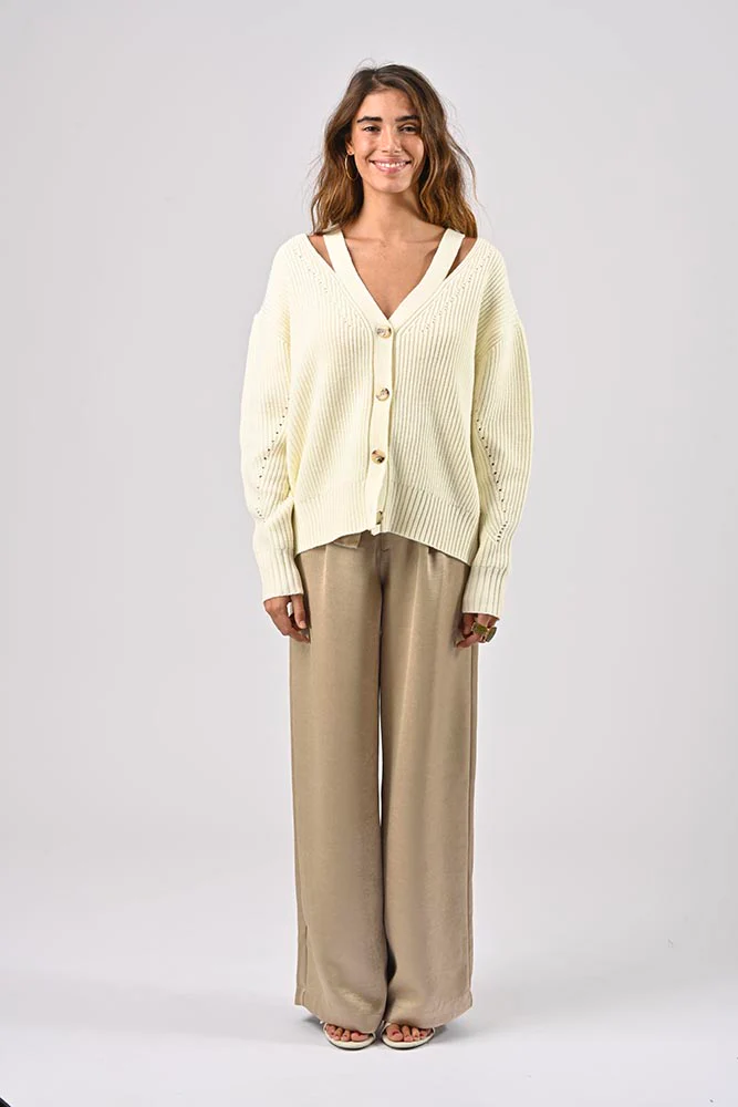 Cardigan en maille. Fente sur les épaules. Col V. Détails avec les boutons à l’avant. Parfait pour un look chic et tendance. Coupe droite et ample. Couleur écru