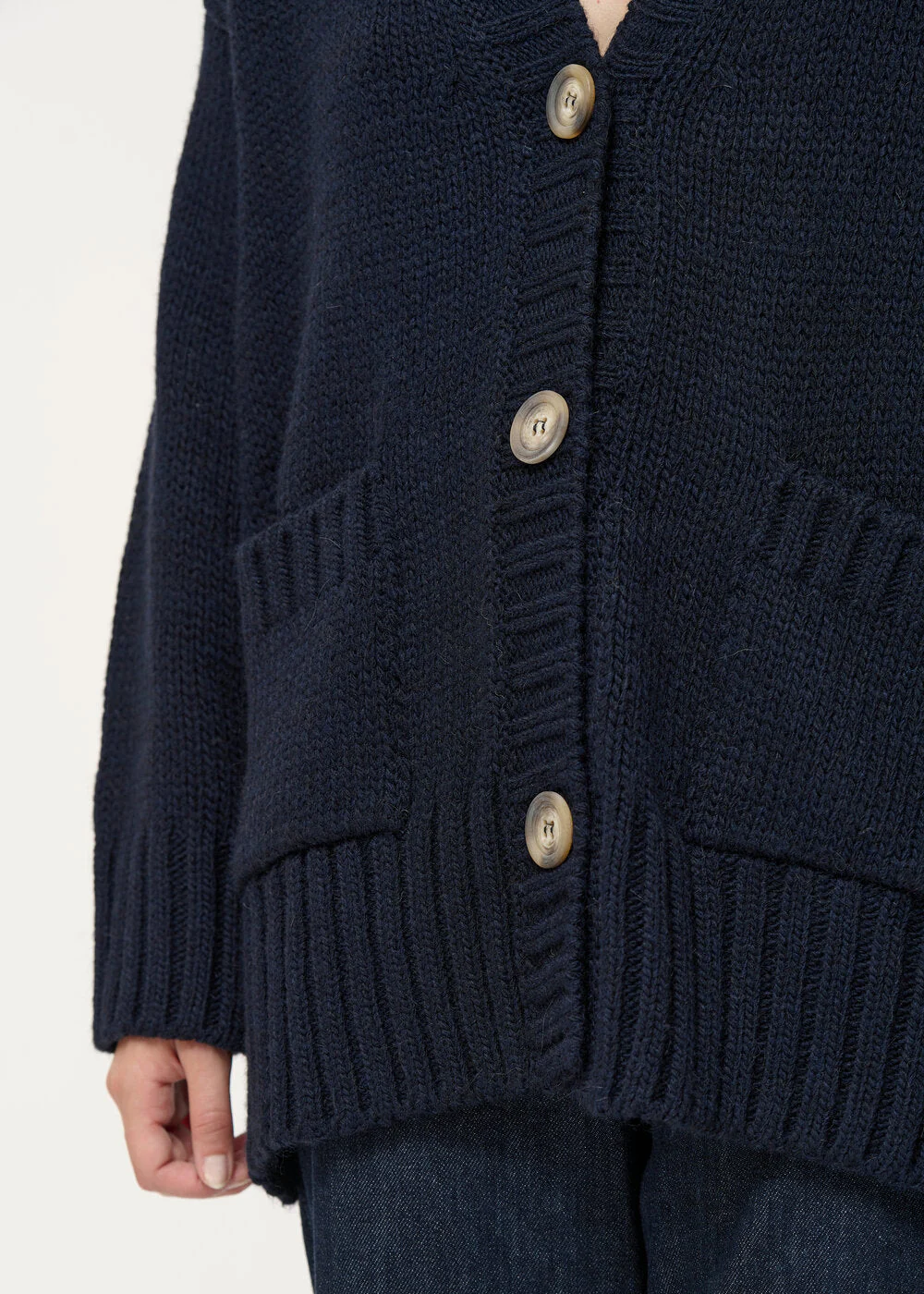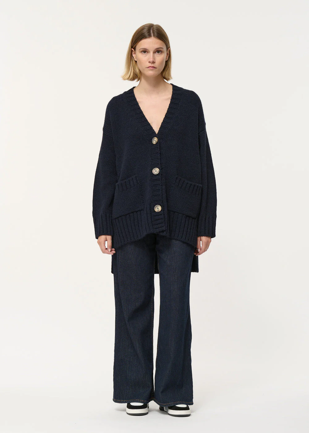 – Cardigan oversize en maille épaisse– Volume long et droit– Manches longues, emmanchures descendues– Encolure V– Deux poches plaquées à la taille– Fermeture devant boutonnée– Fentes côtés– Finitions en bord-côte Notre mannequin mesure 1m73 et porte une taille 36/S.Ce modèle se porte oversized, prenez une taille en-dessous de votre taille habituelle pour un porté plus […]