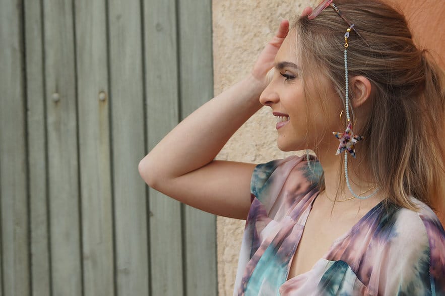 Ce cordon de lunettes peut à la fois se porter en collier, en tour de cou ou tout simplement façon 2021, comme sur les podiums à l’avant de la lunette 😉