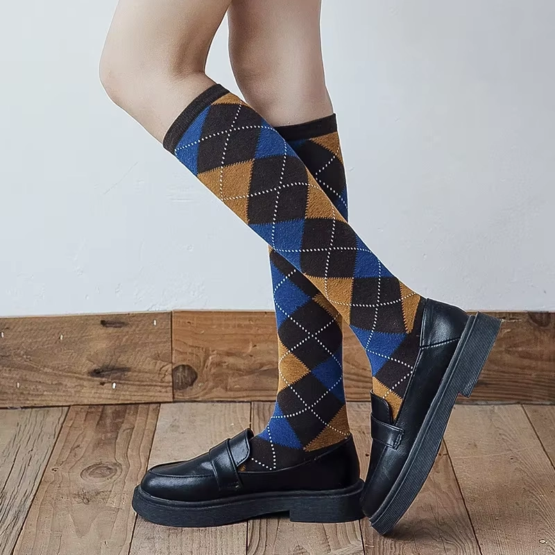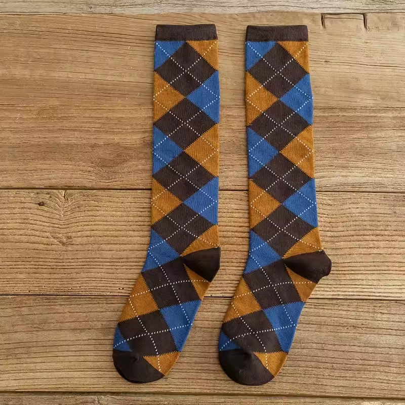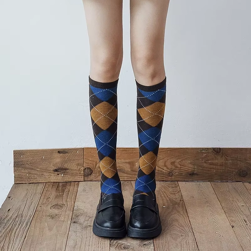 Chez Shine, on te propose de capturer l’essence même du style Preppy avec une touche de caractère ! Ces chaussettes hautes femme sont la pièce signature pour celles qui aiment l’élégance intemporelle avec un twist. Confectionnées dans une maille douce et confortable qui monte juste sous le genou, elles affichent fièrement le motif losange (Argyle) dans une palette de couleurs riche et automnale : un bleu profond, un marron camel chaud et un noir structurant. C’est l’accessoire qui change tout, celui qui donne du cachet et une allure BCBG maîtrisée à tes tenues.