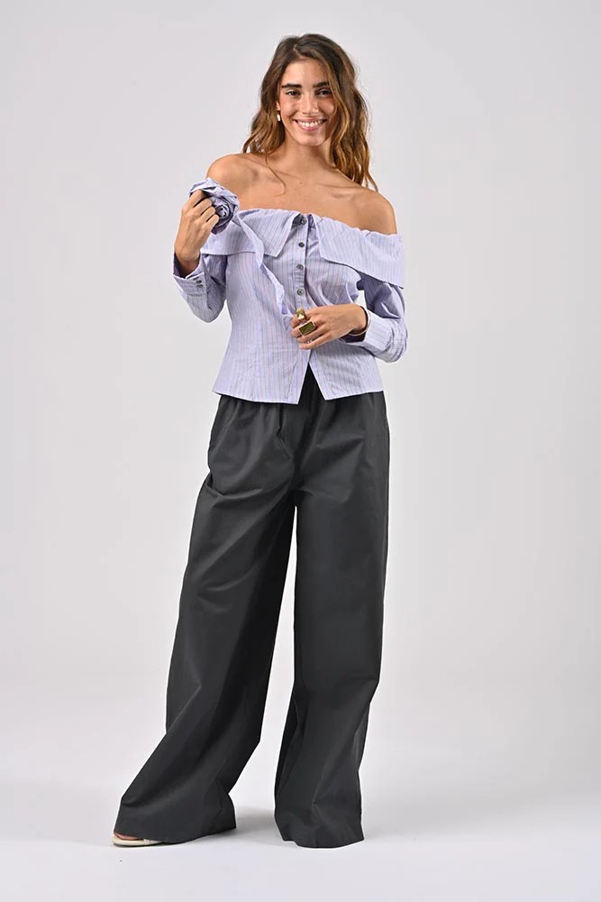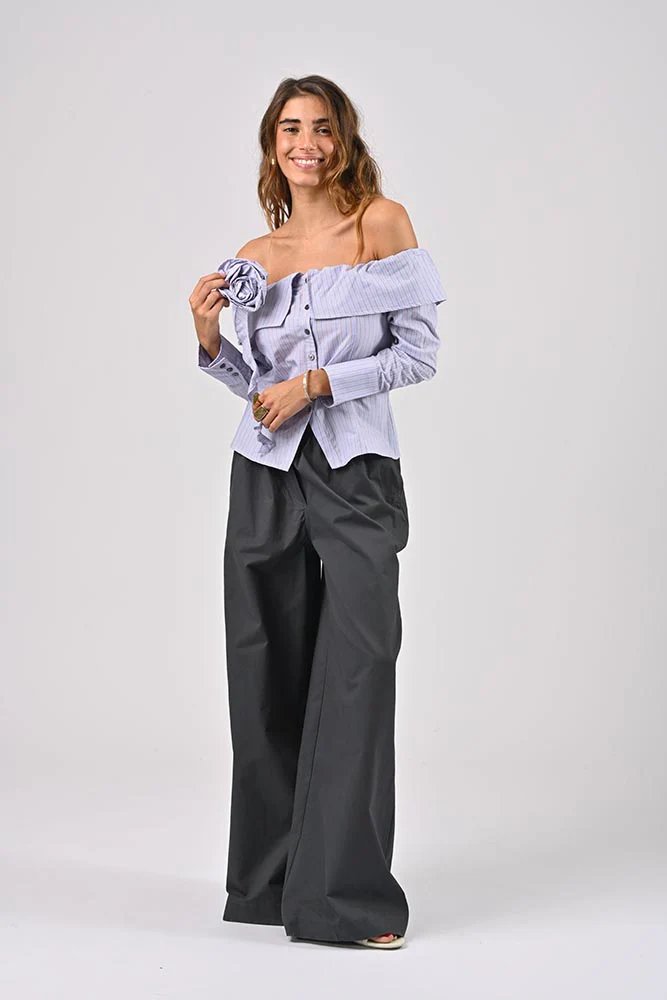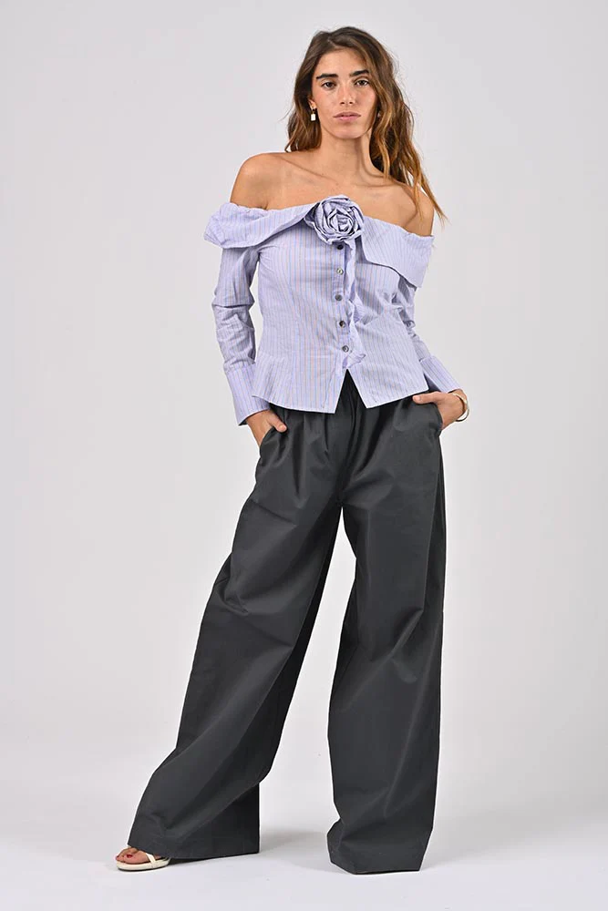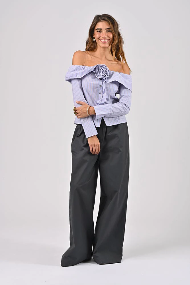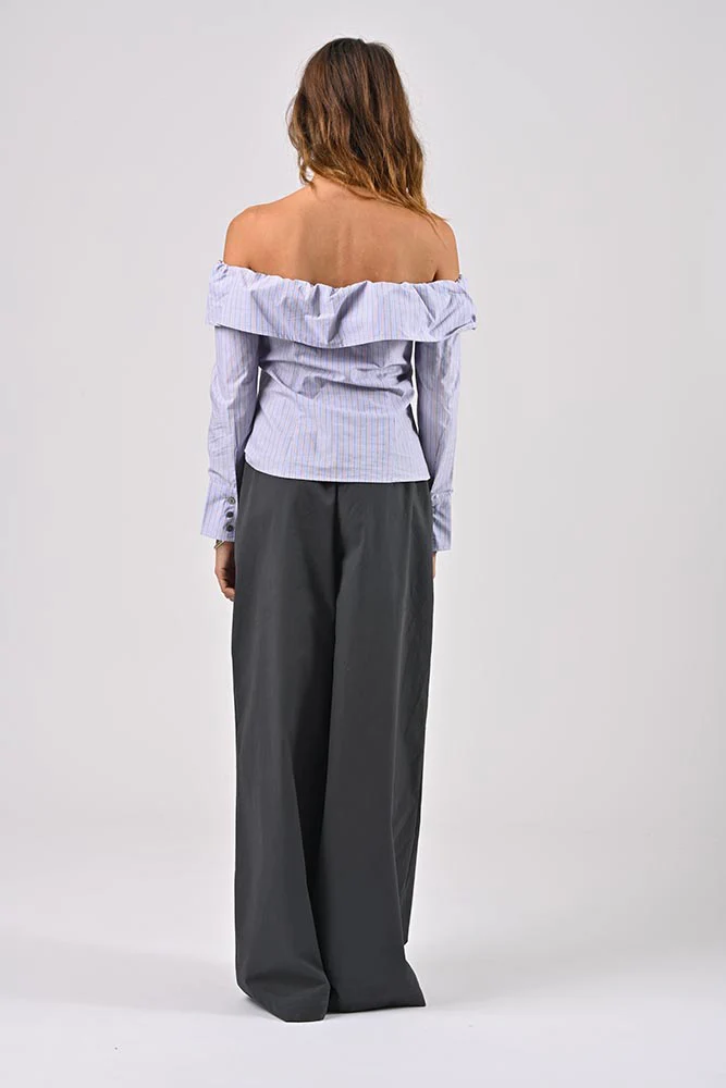 La chemise Aglae Bleu allie élégance et confort avec son design sophistiqué et son tissu léger. Son décolleté off-shoulder met en valeur les épaules, tandis que les rayures bleues et brunes apportent une touche de fraîcheur.