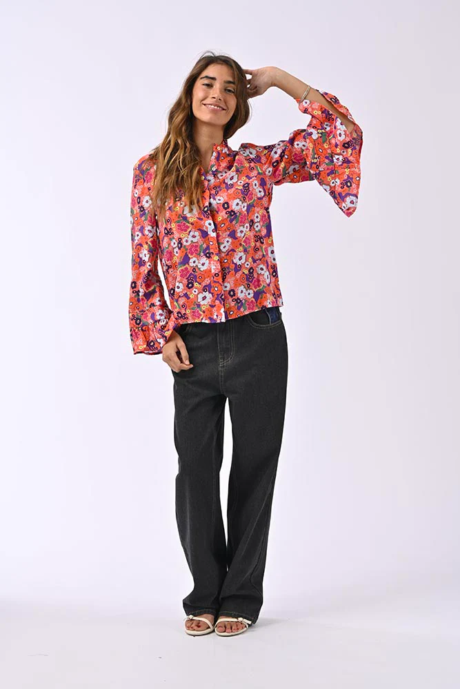 Conçue pour allier style et confort, cette chemise se distingue par ses manches longues évasées, ajoutant une dimension féminine et sophistiquée. Son col classique permet de la porter aussi bien de manière décontractée que légèrement habillée, tandis que sa coupe droite légèrement ample offre une aisance optimale.