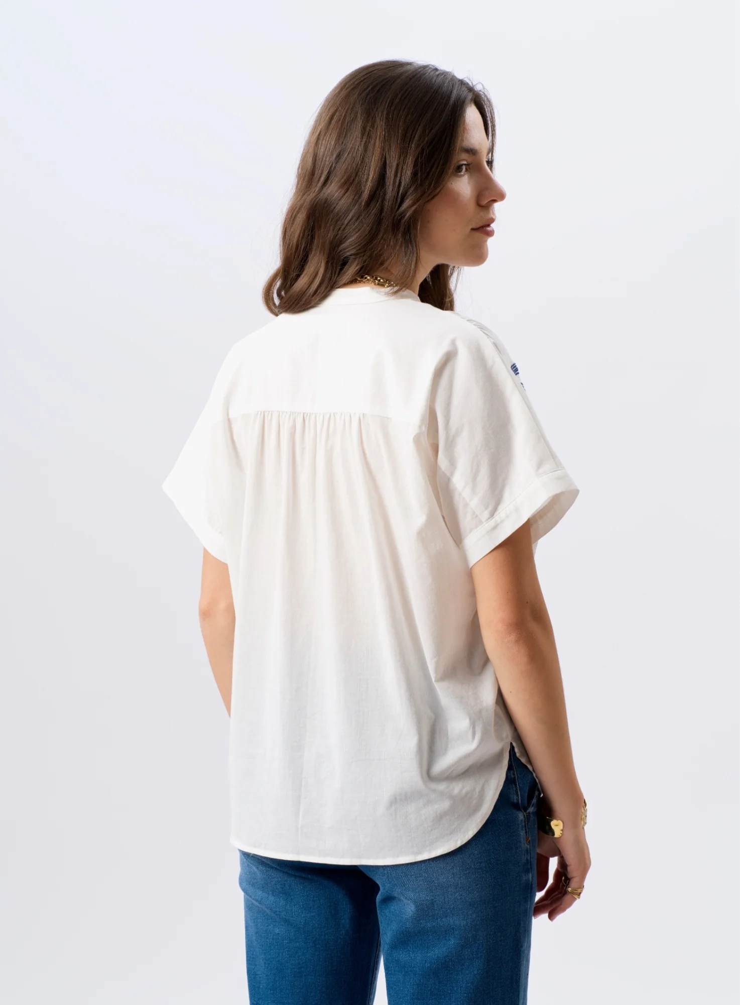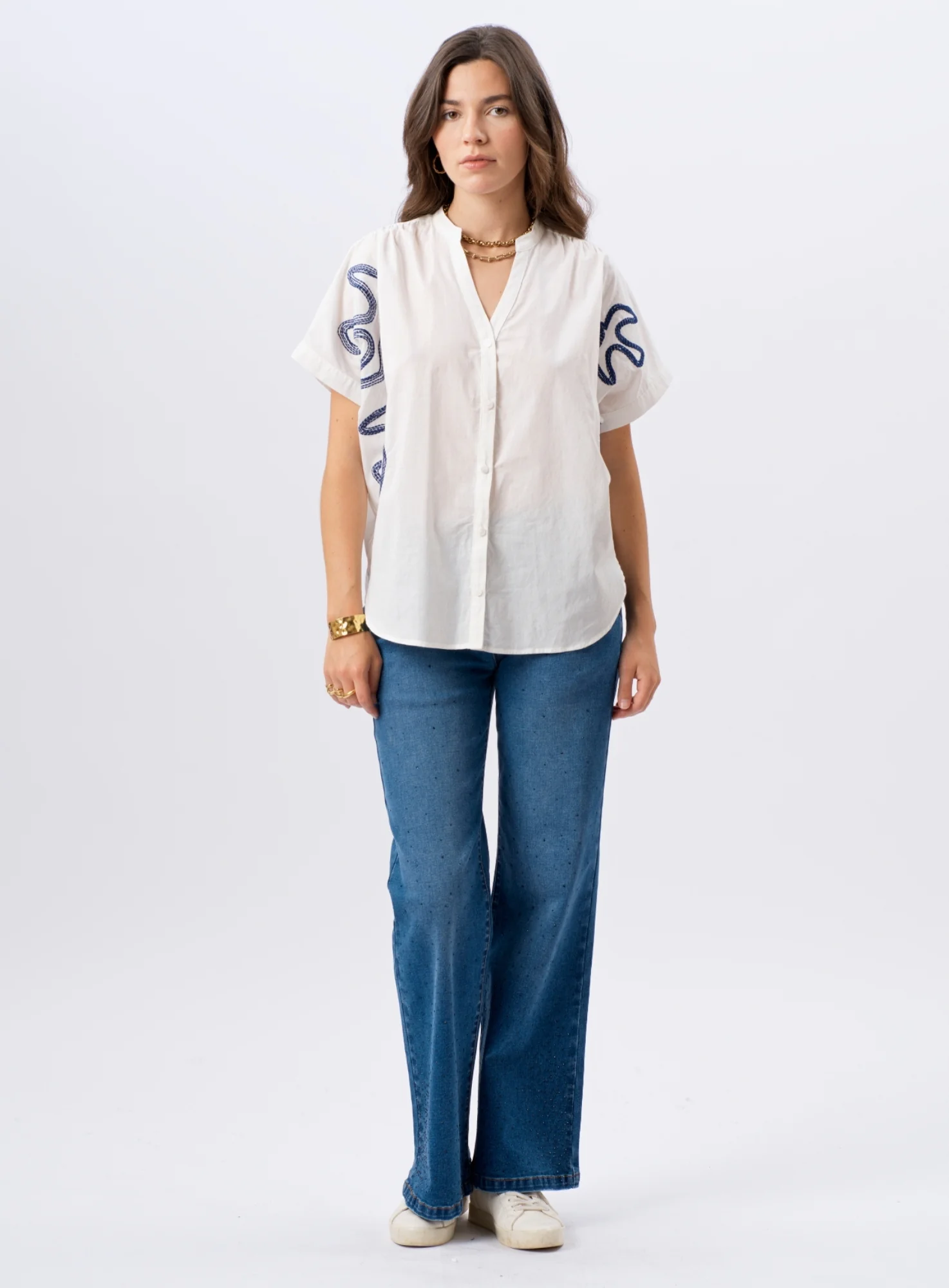 Les manches courtes de ce modèle se distinguent par des détails brodés en fil bleu marine, apportant une note originale et moderne à cette pièce classique. Les ourlets légèrement repliés des manches contribuent à un style casual chic, parfait pour diverses occasions.