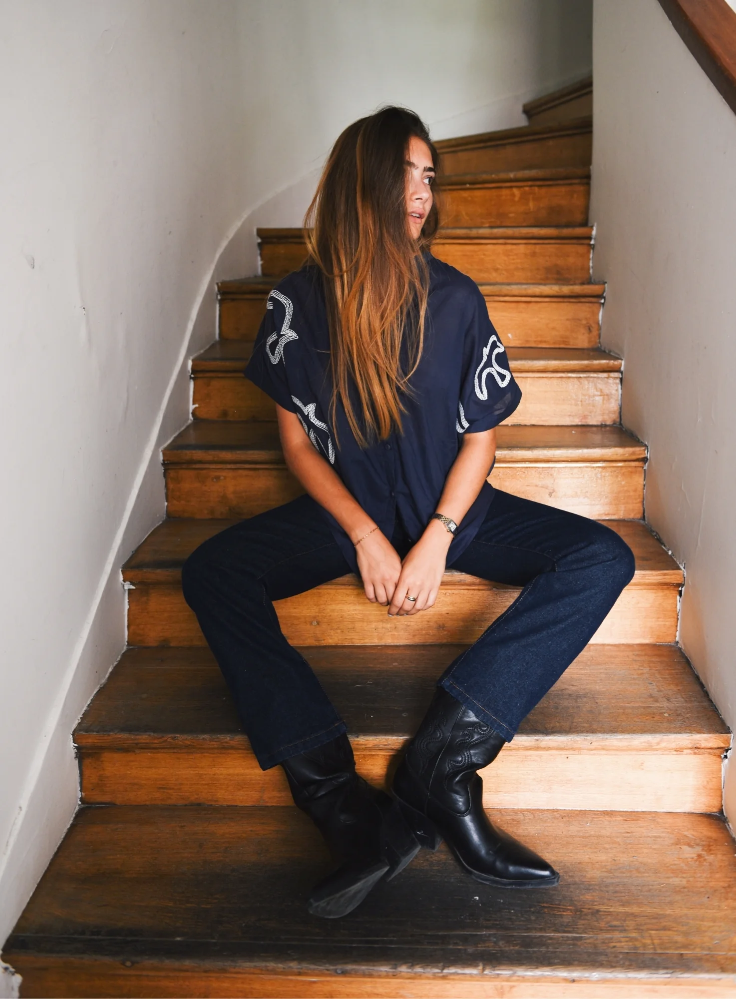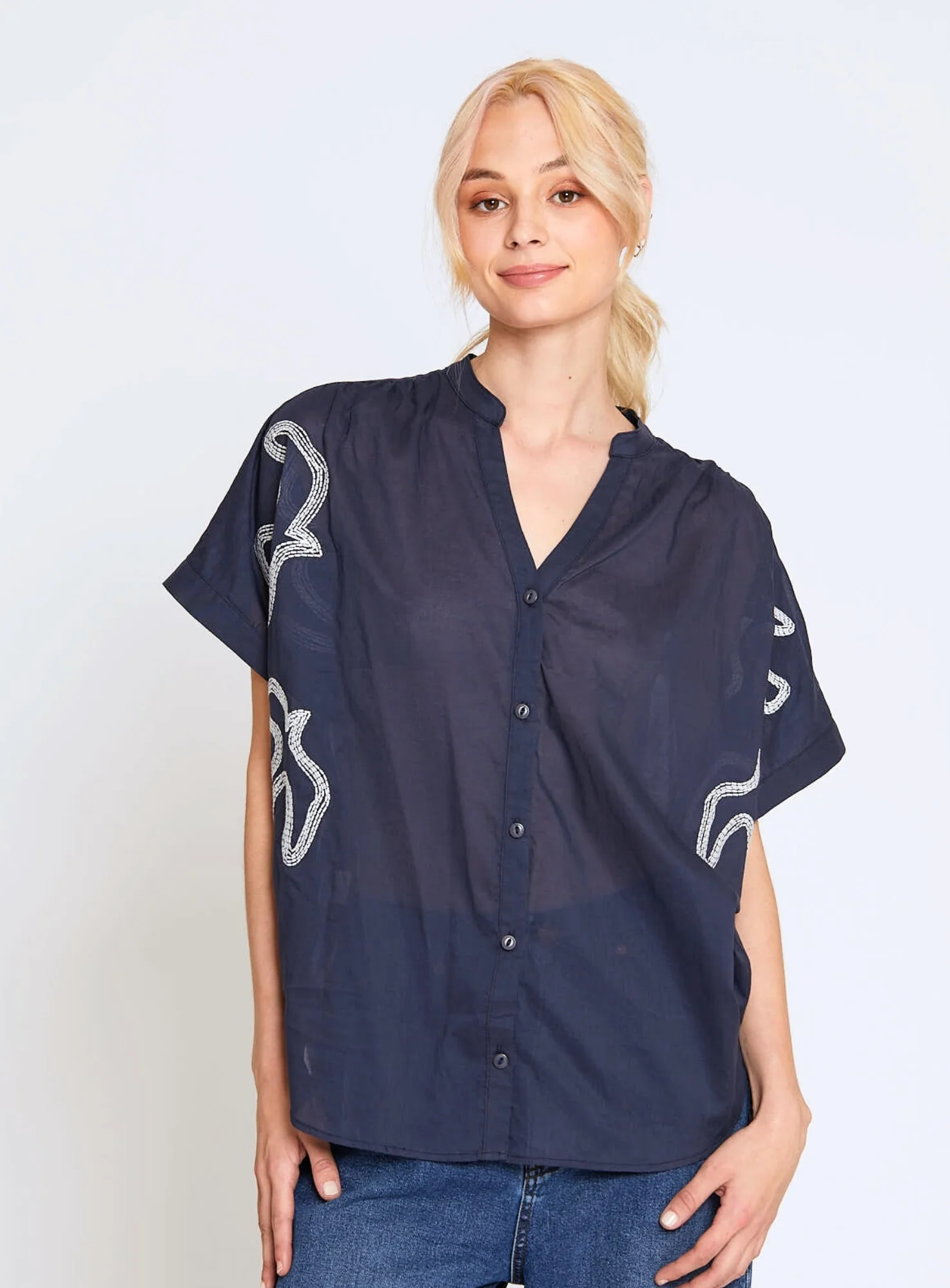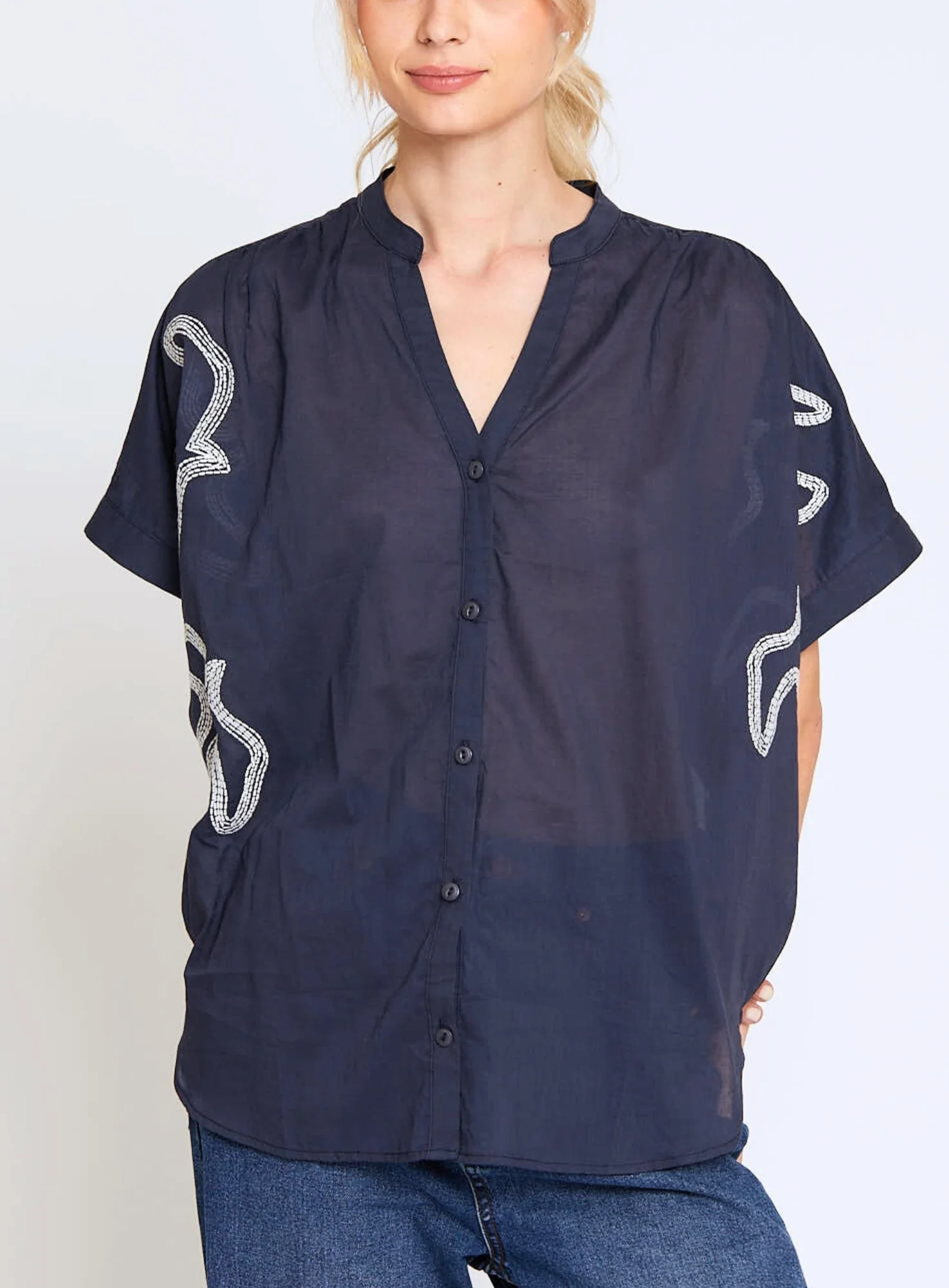Les manches courtes, ornées de détails brodés en fil blanc sur les épaules et les manches, ajoutent une dimension originale et moderne à ce modèle. Les ourlets légèrement repliés des manches renforcent le style casual chic, rendant cette chemise parfaite pour diverses occasions.