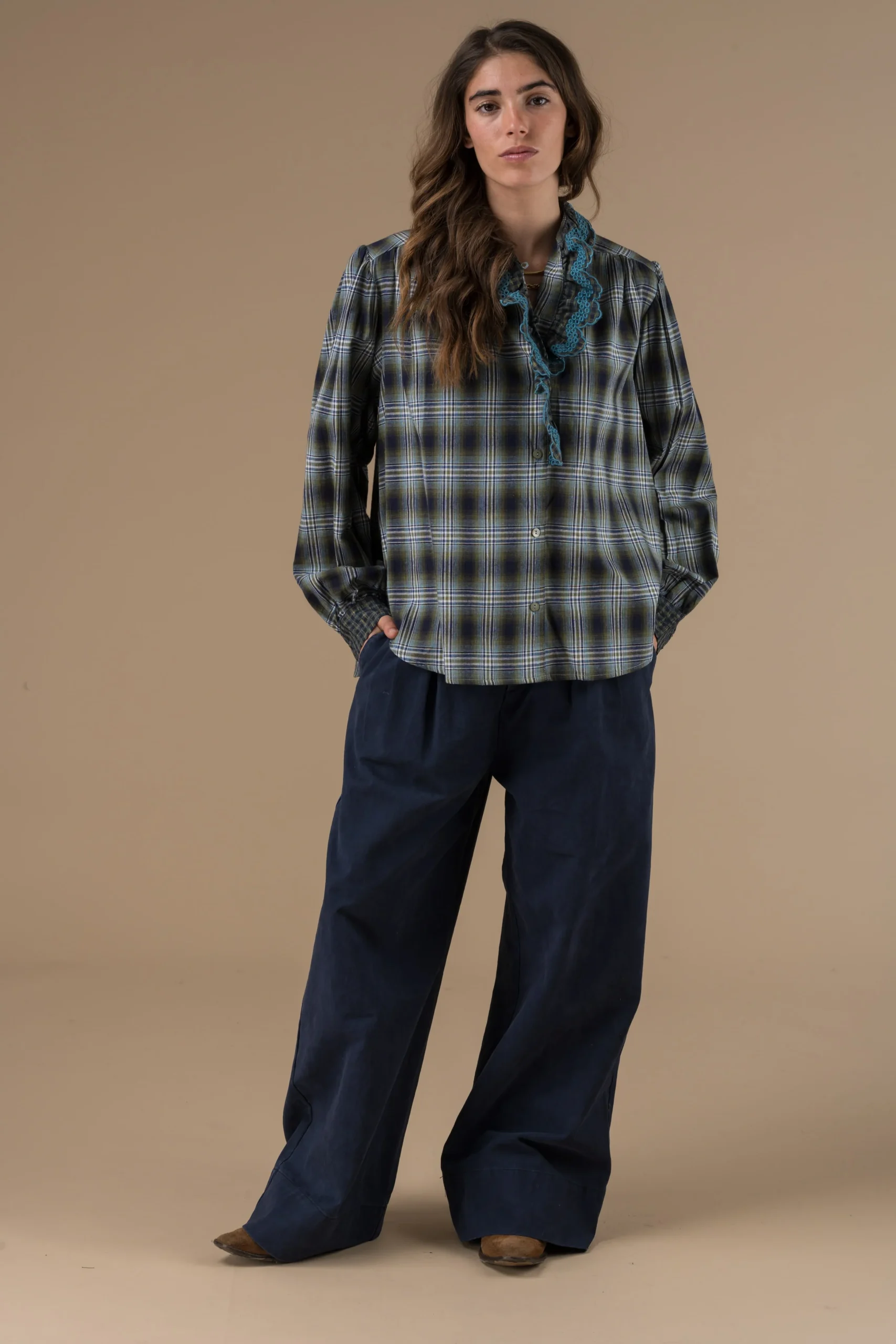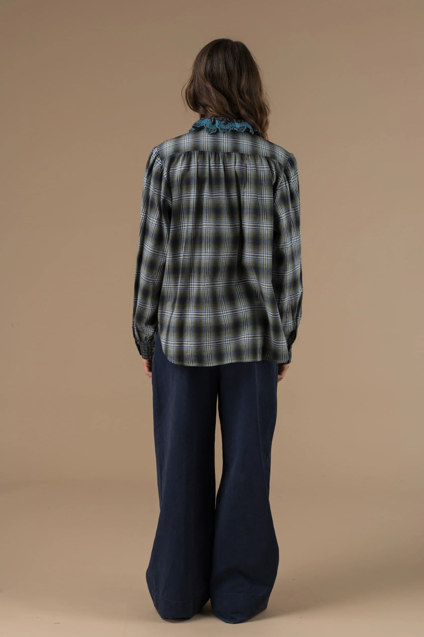 Chemise Alya manches longues à carreaux, coupe droite, rehaussée d’un col à volants et de détails brodés contrastants pour une touche féminine et raffinée. Existe en carreaux roses, carreaux marine, patchwork de bleus, carreaux canard et vert ainsi que carreaux amande.