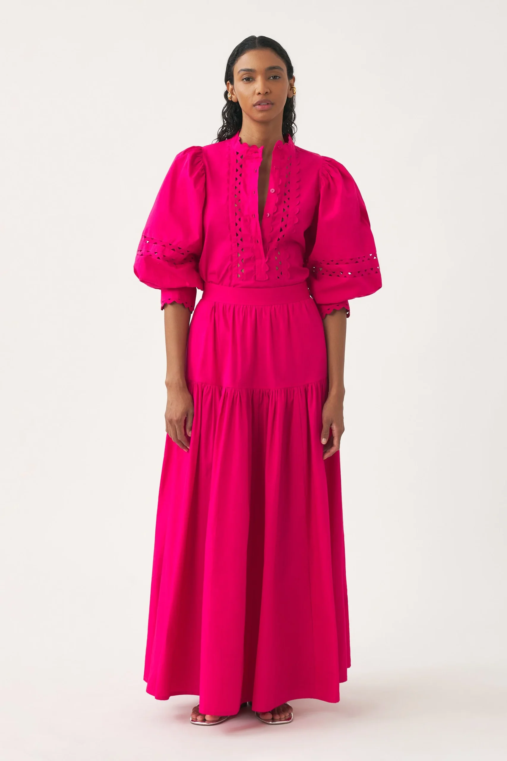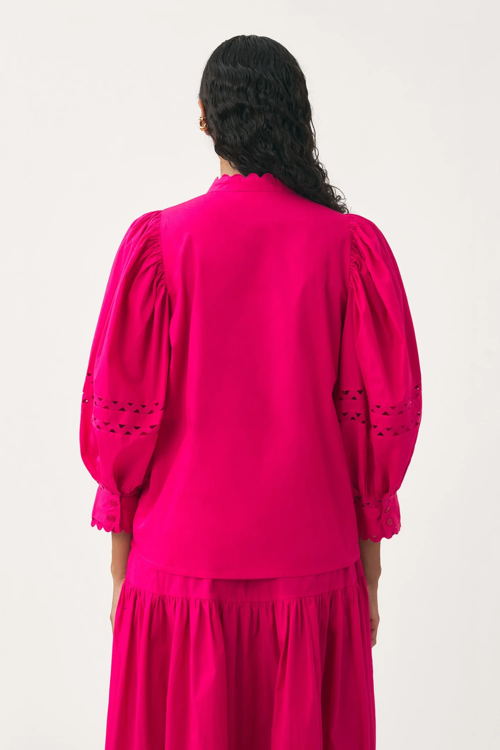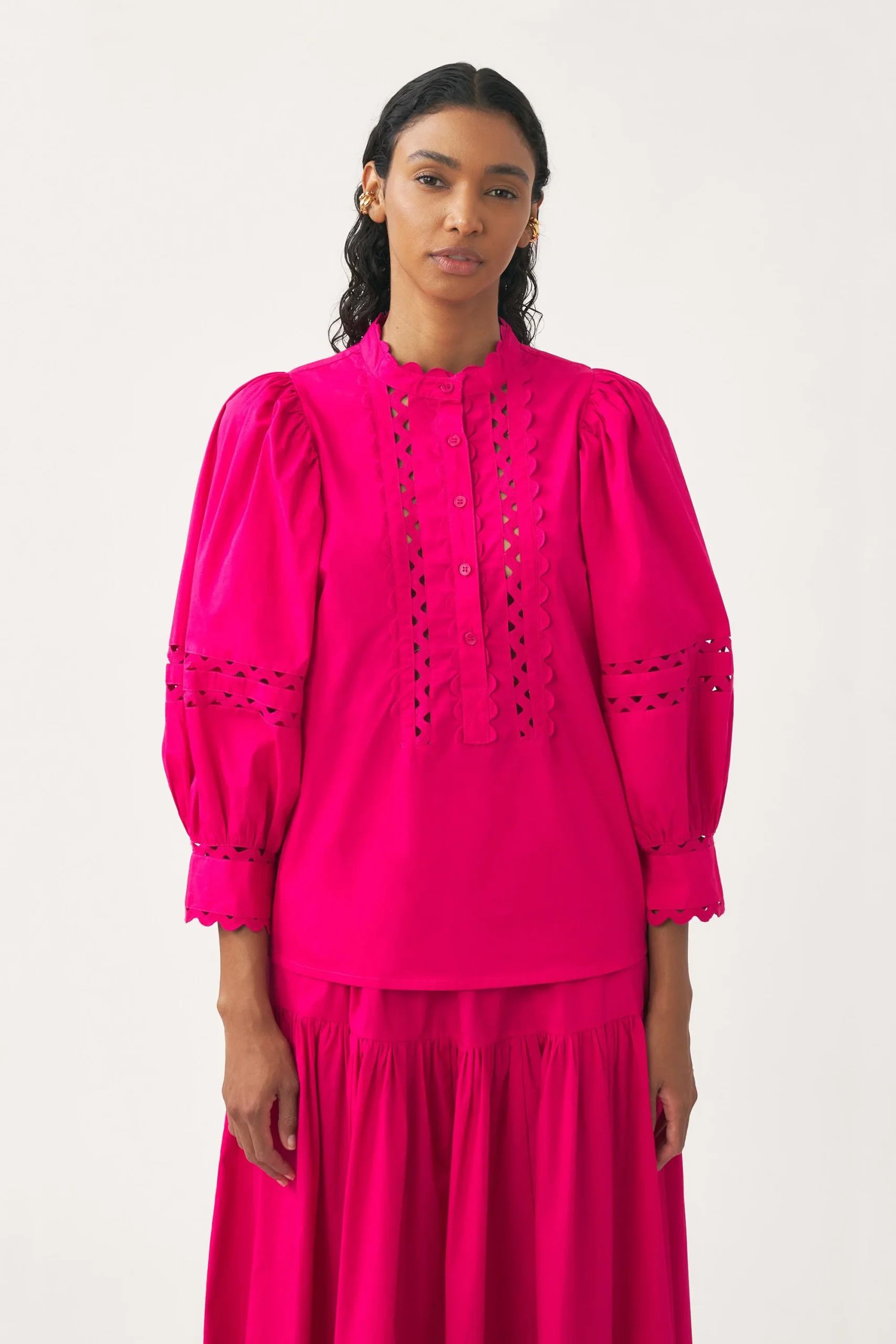 Chemisier en popeline de coton. Rubans festonnés sur la patte de boutonnage, sur les manches et à la taille. Patte de boutonnage avec boutons ton sur ton. Fronces aux épaules et aux poignets. Manches bouffantes. Poignets fermés par deux boutons. Inspiré des styles victoriens.
