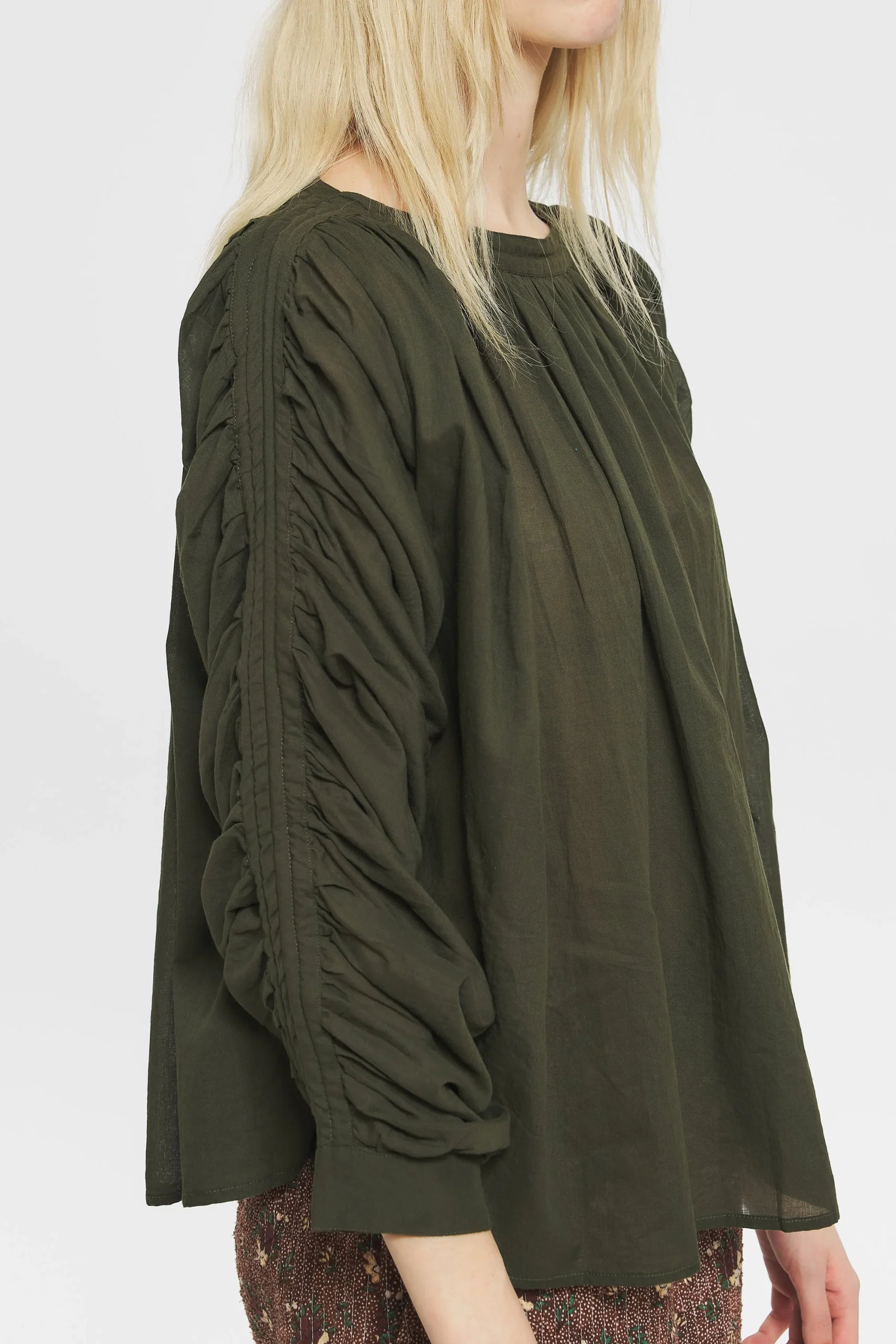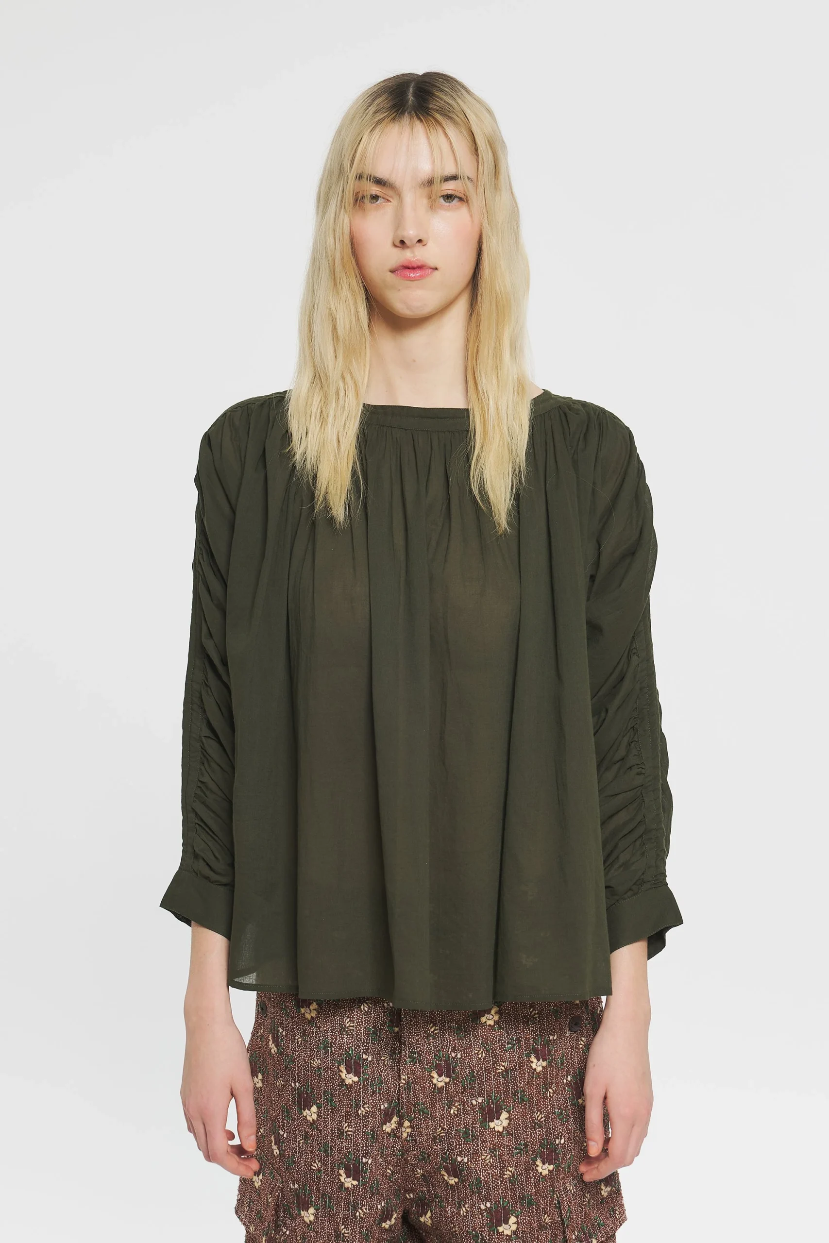 Blouse en voile de coton. Manches froncées. Double ganse à la couture. Boutons aux poignets en nacre naturelle.