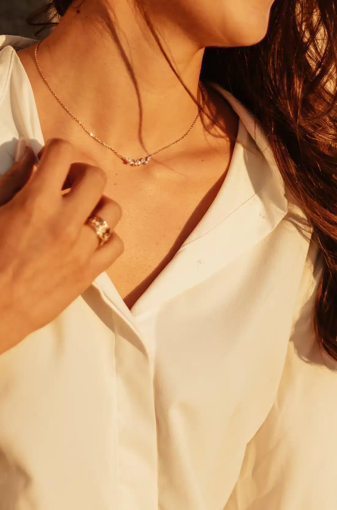 Une douce soirée d’été 🌔 🕊️ ✨ En Laiton plaqué Or 750/000 🥥 Tout en finesse, des zircons tailles navettes, qui illuminent et attirent les regards. 💎 Zircons blancs étincelants navettes 📐 Longueur totale de 45cm, avec 3 anneaux pour l’ajuster à 42 et 40cm 👍 Le Laiton plaqué or est une matière hypoallergénique – le collier peut être porté sans crainte de réactions. 💦 Le collier supporte l’eau douce