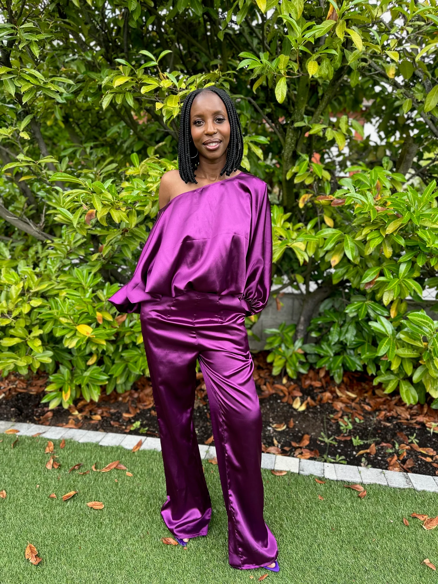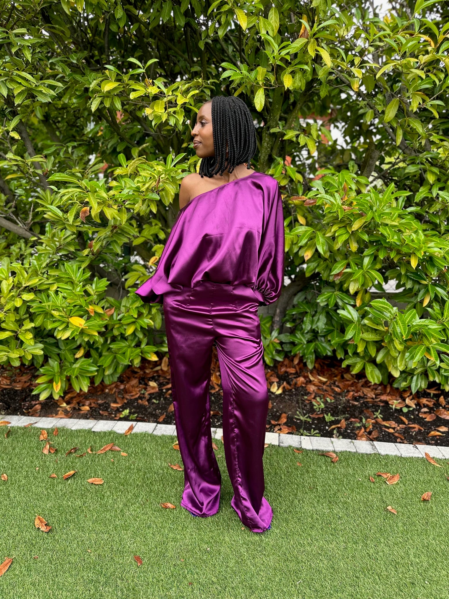 Ensemble Haut Asymétrique et Pantalon Satin Bordeaux