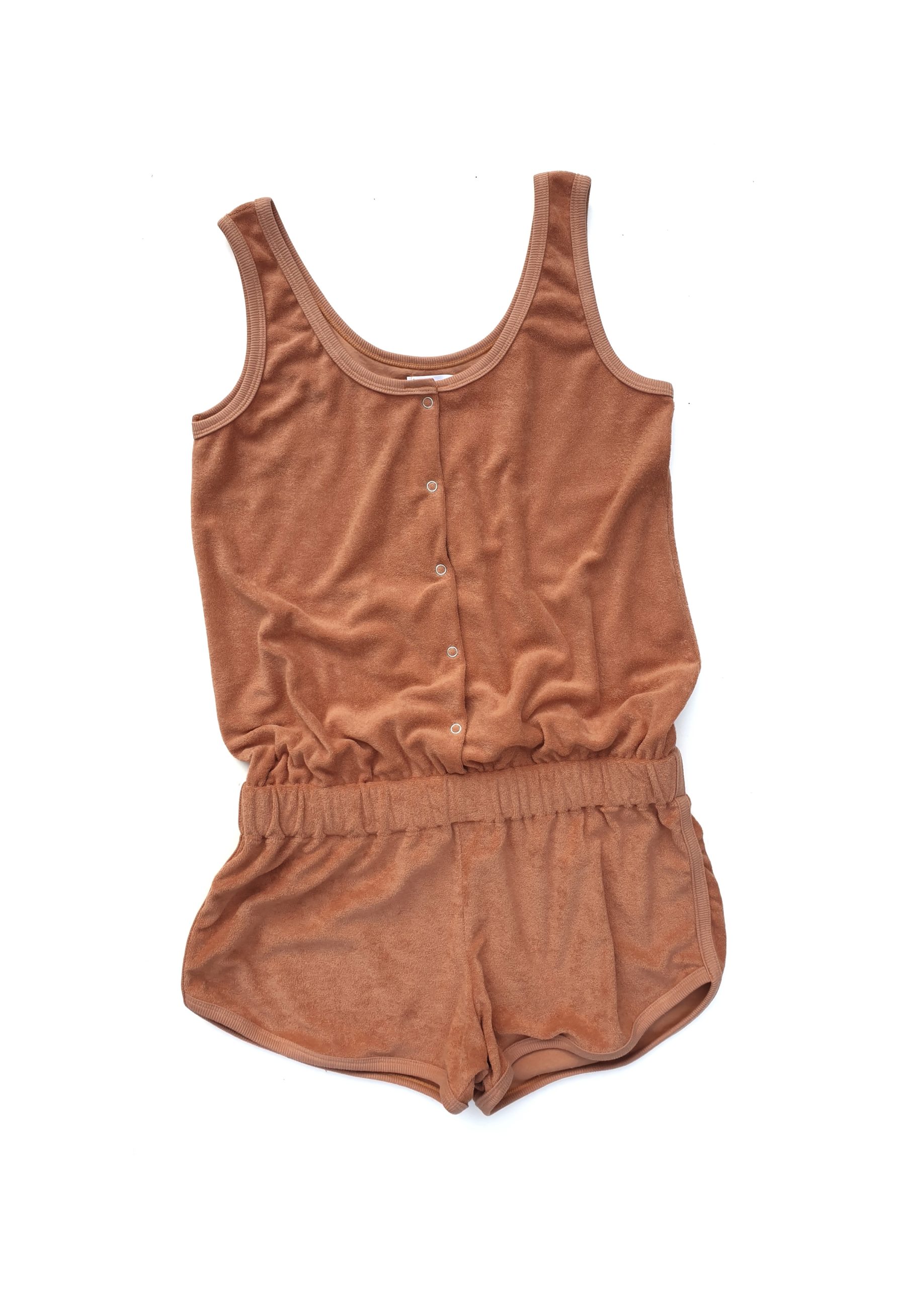Combishort sans manches, ouverture par pressions sur le devant, et ceinture élastique.