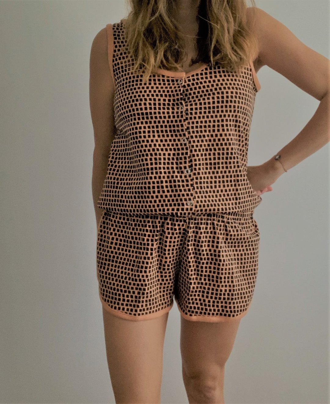 Combishort sans manches, ouverture par pressions sur le devant, et ceinture élastique. Tissu sweat 96% coton 4% élasthanne certifié Oeko-Tex Standard 100 Class I. Les bords le long du col, des emmanchures et du short seront en blanc. Vêtement confectionné à la commande dans le Sud de la France. Laver à la machine à 30° […]