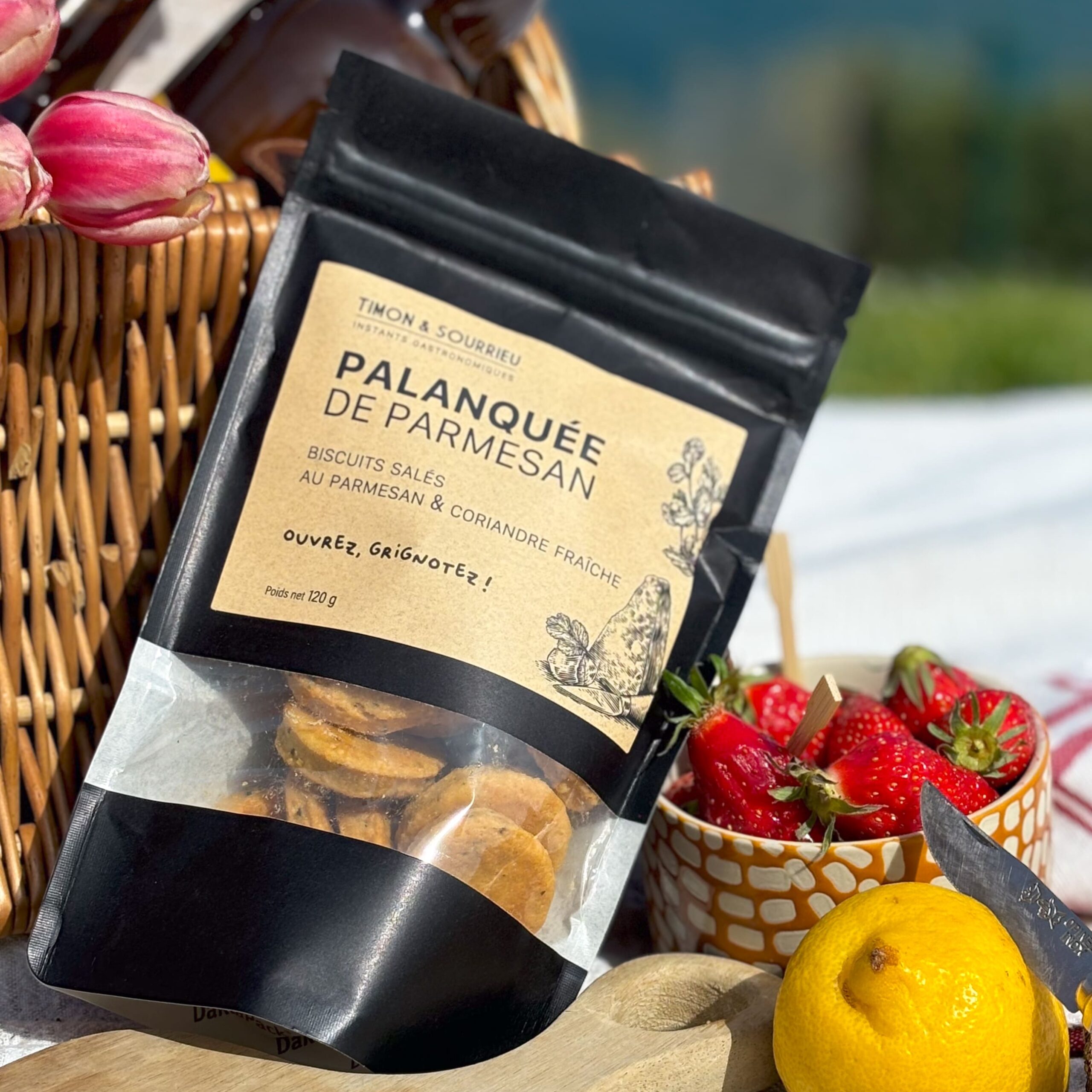 Palanquée de Parmesan, une association délicieuse et raffinée de parmesan et de coriandre fraîche, créée sous la supervision du chef étoilé Guillaume Sourrieu. Ces biscuits croquants sont parfaits pour rehausser vos apéritifs avec une touche d’originalité et de saveurs intenses.