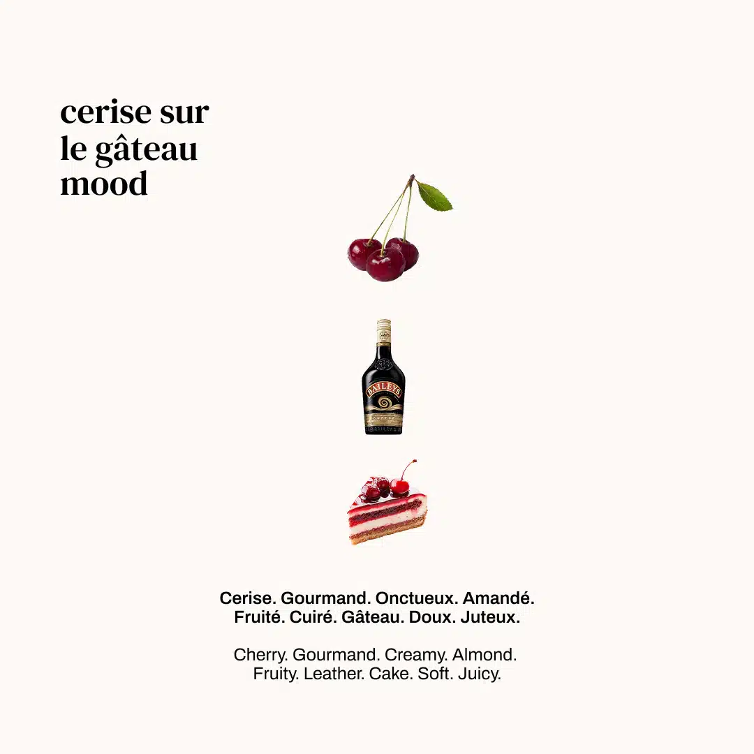 Une eau de parfum où la cerise, intense et gourmande, se mêle à des notes douces et onctueuses d’amande et de chocolat. L’accord fruité et liquoreux s’épanouit sur un fond cuiré et chaleureux, avec des touches de gâteau et de Bailey pour une sensation de réconfort et de plaisir absolu. Une fragrance douce, fruitée et enveloppante, qui surprend par son côté à la fois sucré et audacieux.