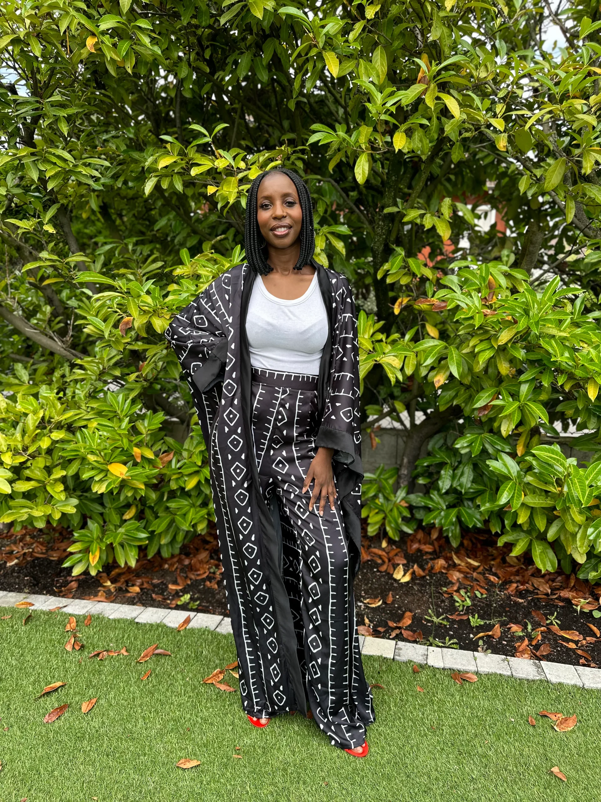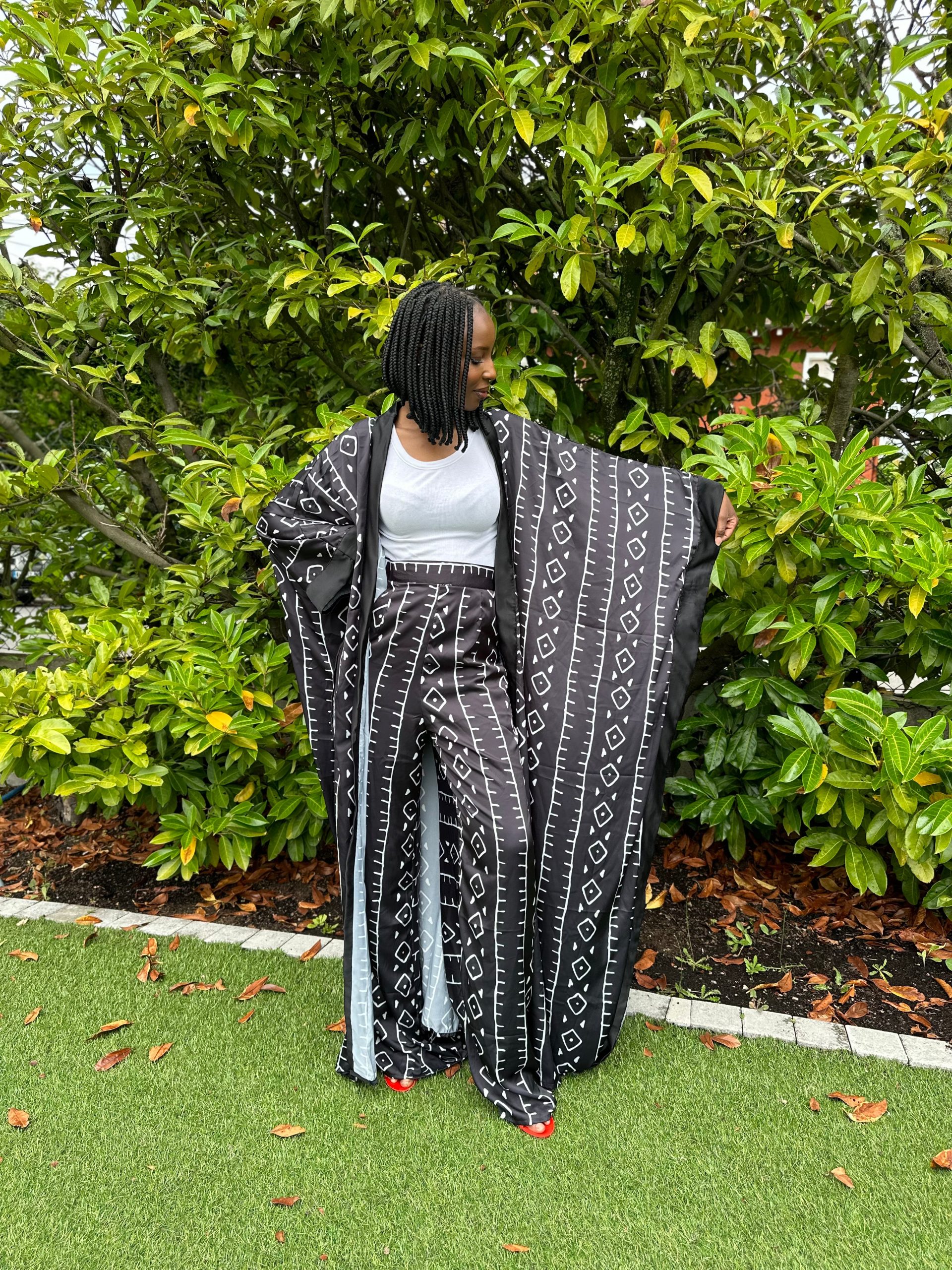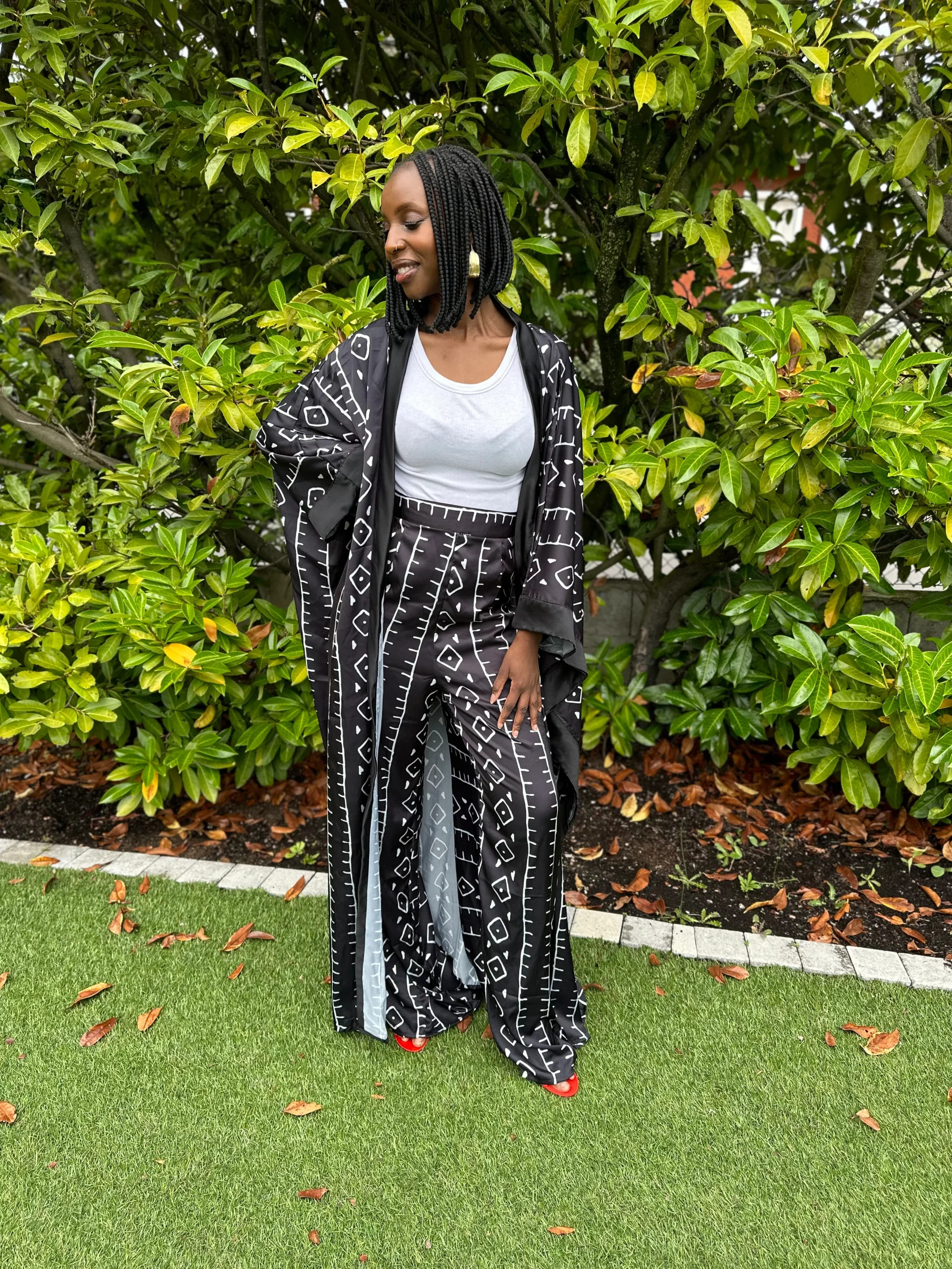 Ensemble kimono et pantalon satin imprimé ethnique