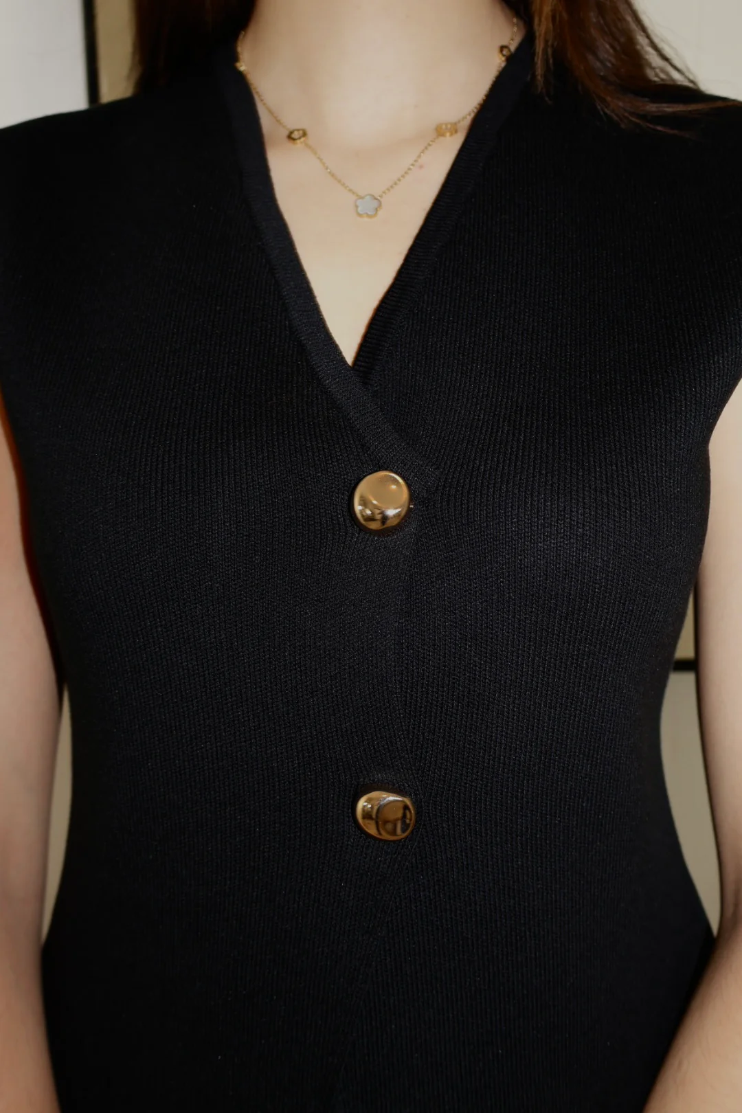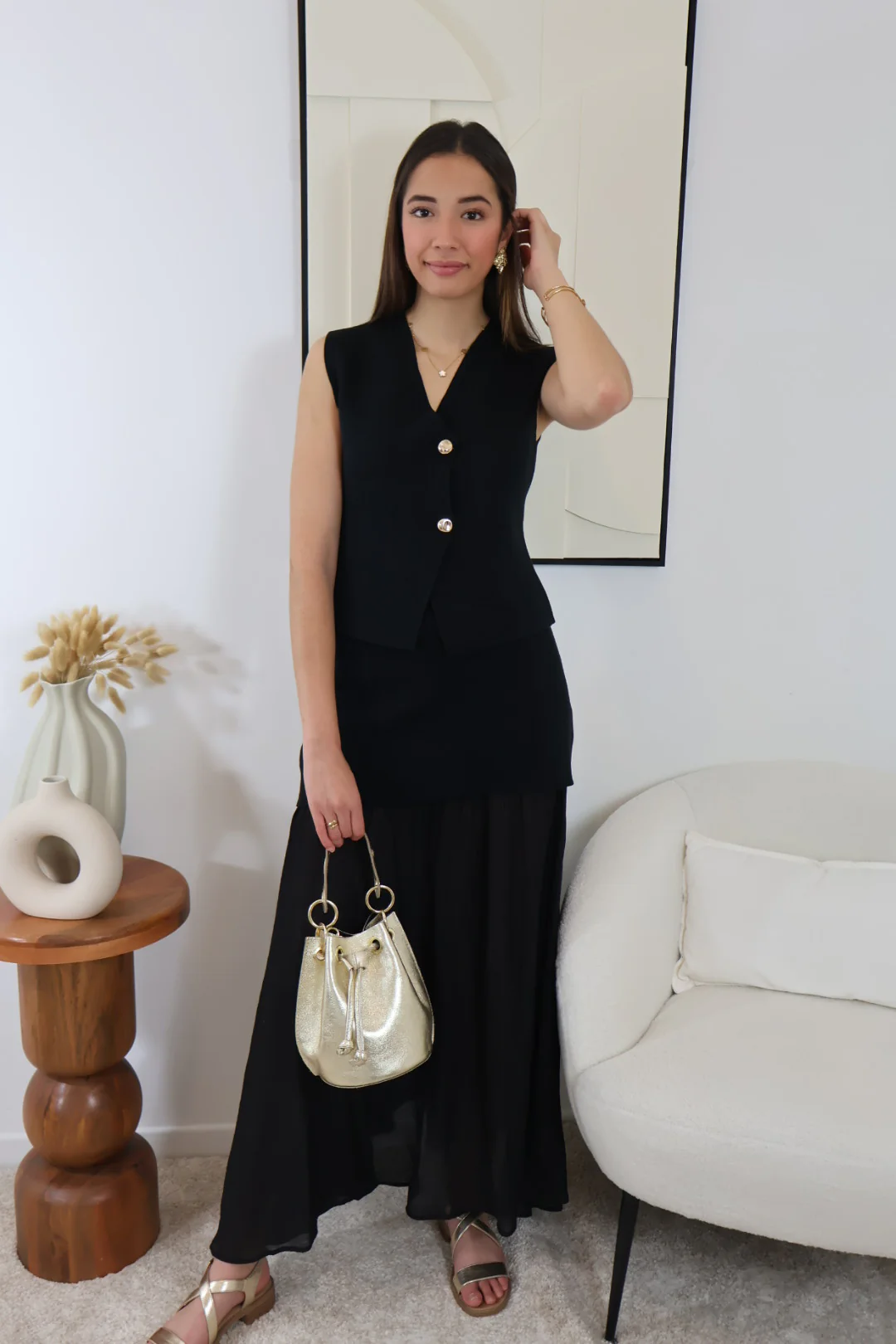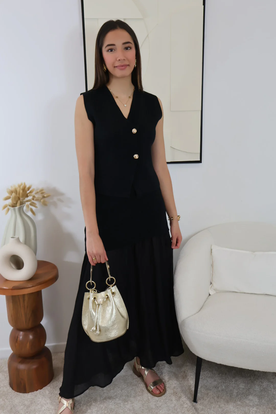 DESCRIPTION : • Ensemble deux pièces ultra féminin en maille et voile léger • Haut sans manches en maille douce avec boutons dorés • Jupe longue fluide • Taille haute avec élastique invisible et fermeture éclair discrète sur le côté • Un look frais et élégant, parfait pour les journées ensoleillées ou les occasions estivales […]