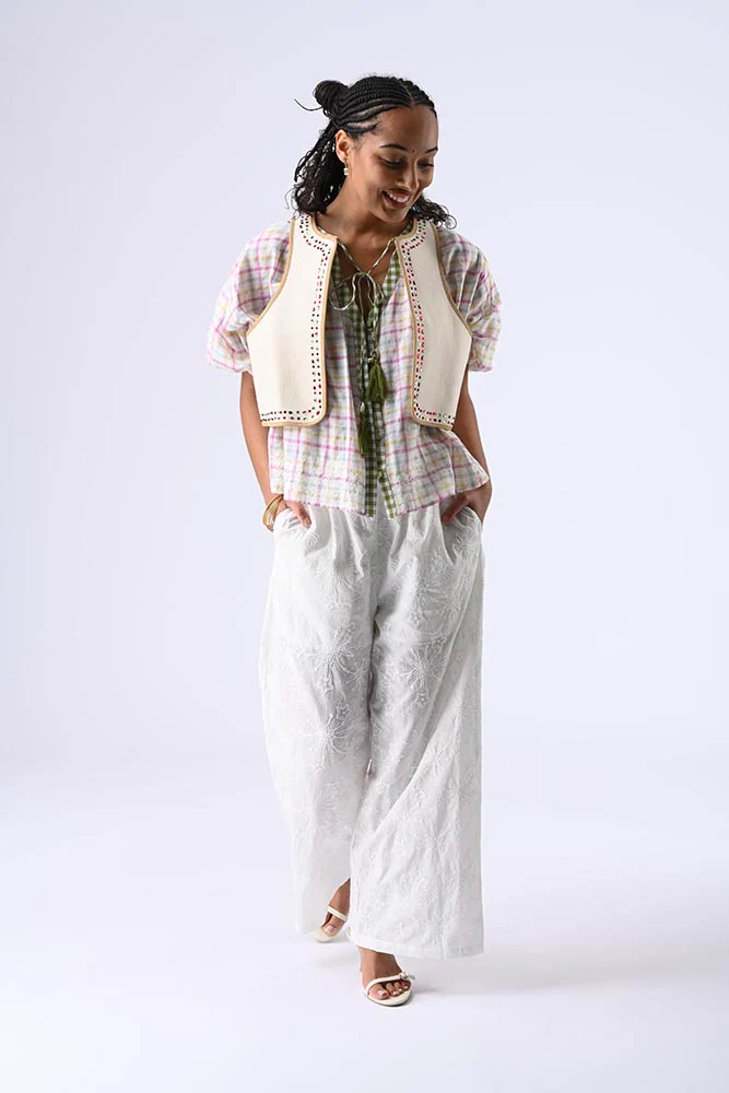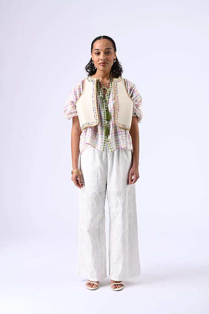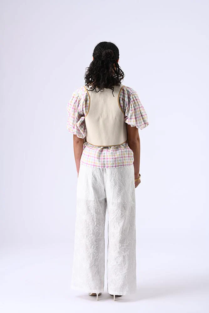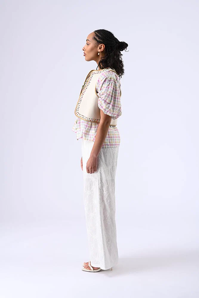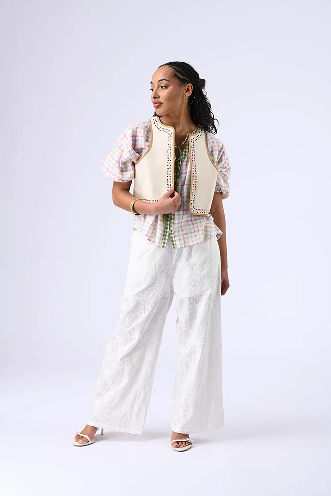 Conçu en 100% coton, ce gilet léger est idéal pour les saisons chaudes tout en offrant un confort optimal. Les surpiqûres contrastantes et les détails soignés, comme les bijoux fantaisistes, lui confèrent une touche unique et raffinée.