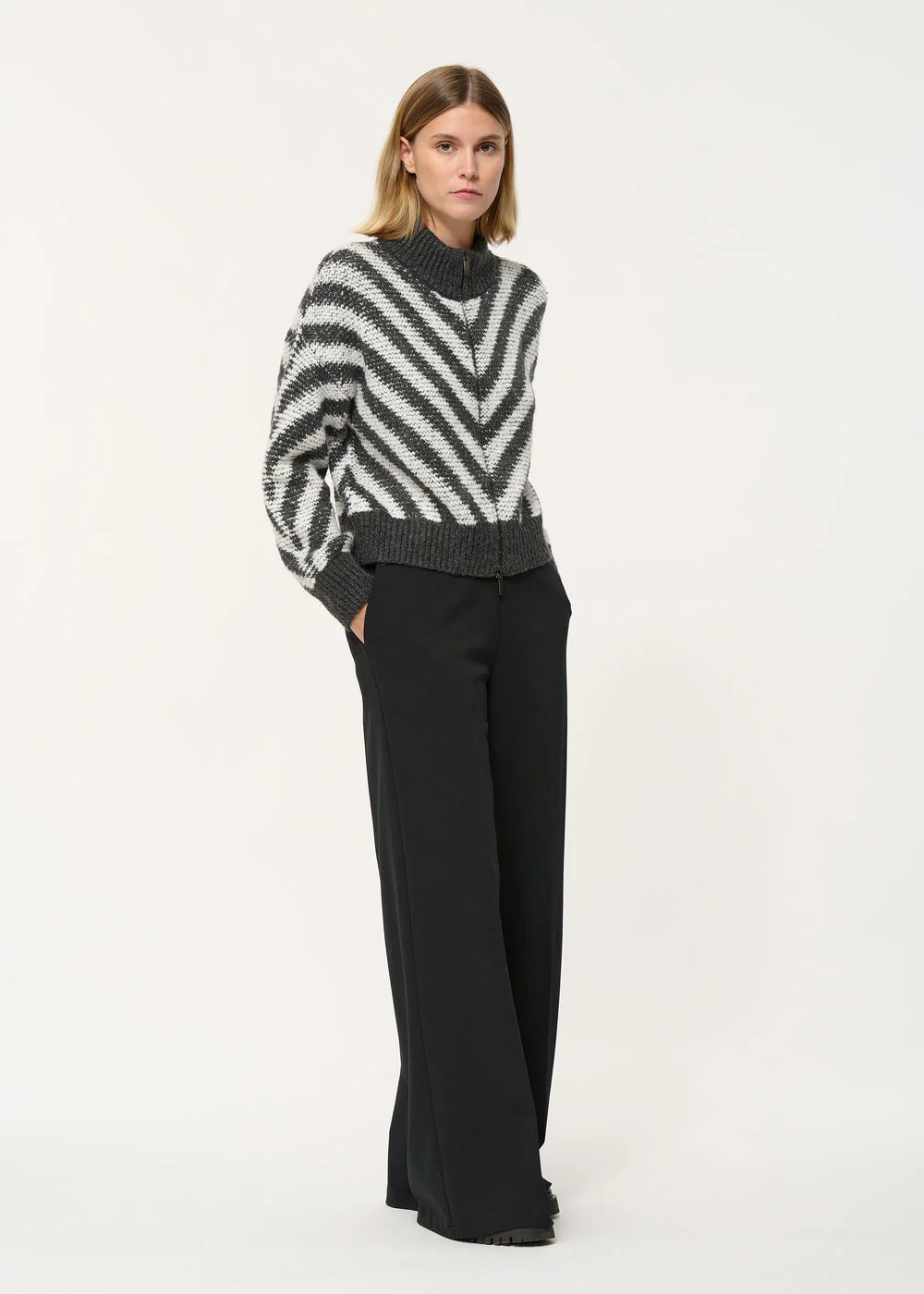 – Gilet oversize à chevrons XXL bicolores– Volume ample droit– Col montant– Manches longues, emmanchures descendues– Fermeture devant zippée– Finitions col, bas de manches et de corps en bord-côte unis Notre mannequin mesure 1m73 et porte une taille 36/S.Ce modèle se porte oversized, prenez une taille en-dessous de votre taille habituelle pour un porté plus […]