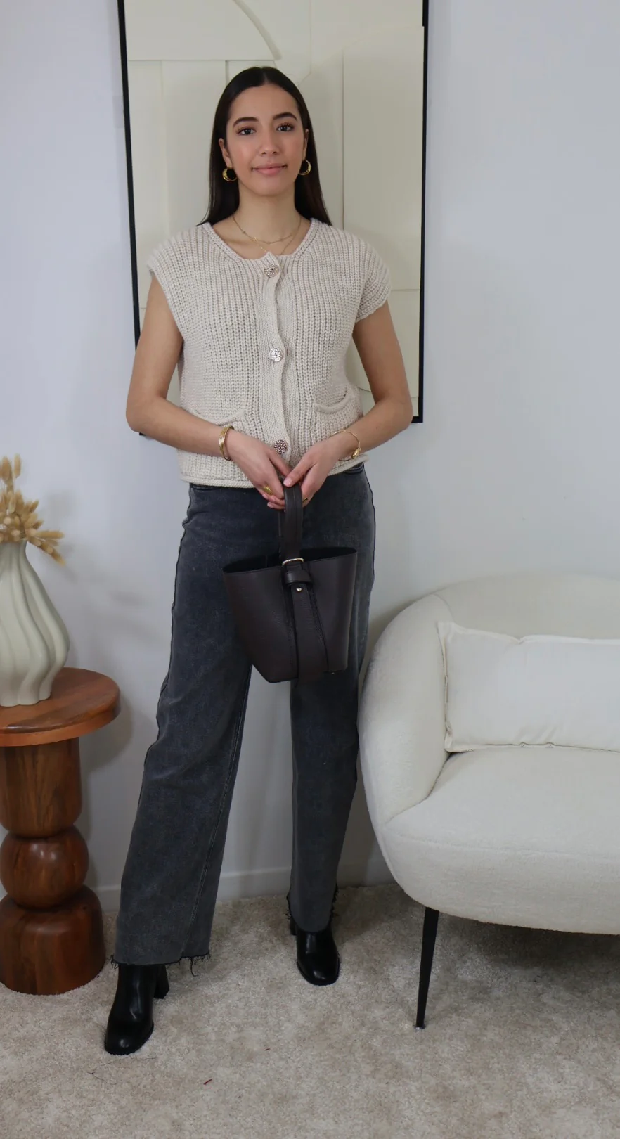 DESCRIPTION : • Gilet sans manches • Grosse maille • Deux poches devant pour une touche pratique et stylée • Se ferme avec des boutons dorés qui apportent une note d’élégance • Taille unique, convient aux tailles 36 à 42 • Couleur : BEIGE Le modèle mesure 1,71 m et porte habituellement du 38. Ce […]