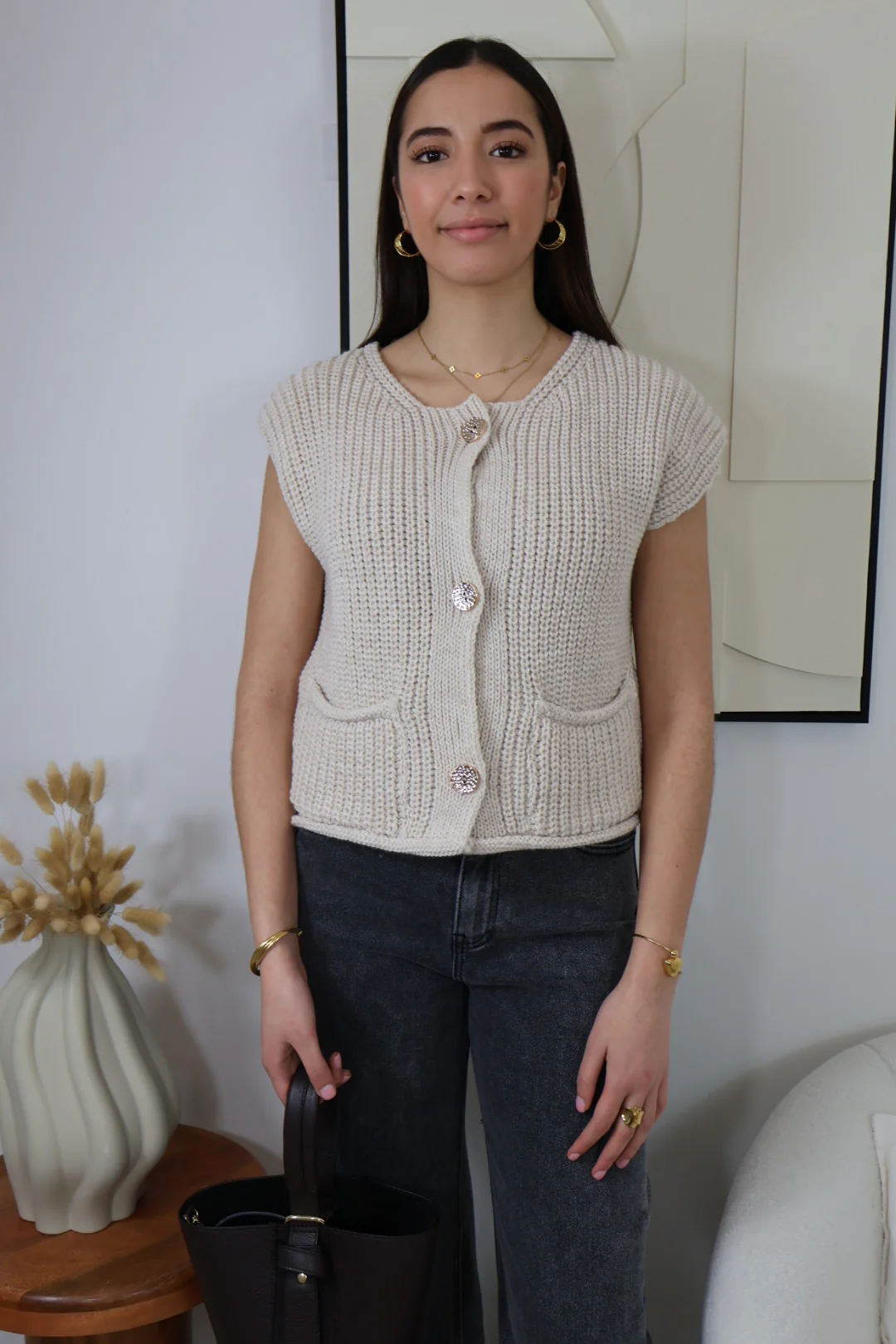 Ce gilet sans manches est parfait pour ajouter une touche de réconfort et de légèreté à votre tenue.
