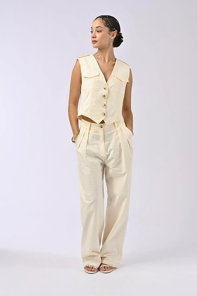 Le gilet Florine se marie parfaitement avec un pantalon assorti pour un ensemble harmonieux. Son tissu léger en fait un allié parfait pour les saisons chaudes, tout en conservant un style soigné.