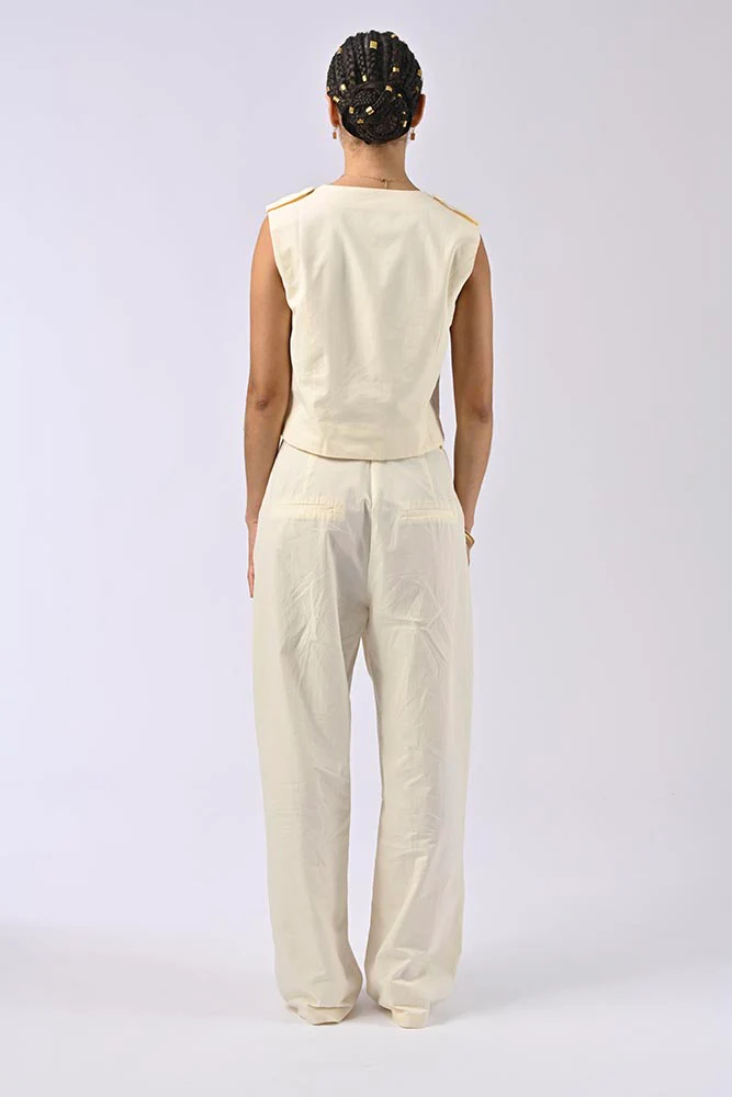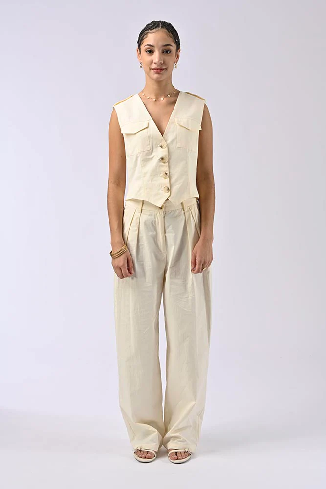 Gilet sans manches Florine en écru, un modèle élégant et intemporel pour parfaire votre garde-robe. Conçu dans un 100% coton, ce gilet allie confort et style avec une coupe droite et un col en V raffiné.